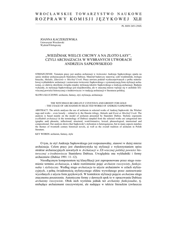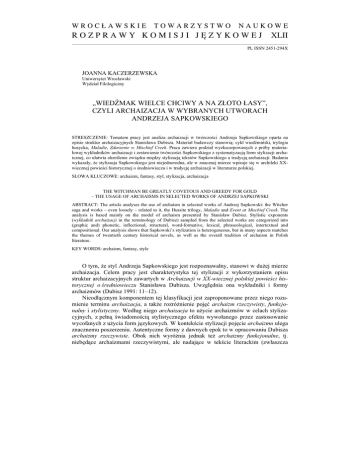 WROC£AWSKIE TOWARZYSTWO NAUKOWE ROZPRAWY KOMISJI JÊZYKOWEJ XLII _______________________________________________________________________________________________________________________ PL ISSN 2451-294X JOANNA KACZERZEWSKA Uniwersytet Wrocławski Wydział Filologiczny „WIEDŹMAK WIELCE CHCIWY A NA ZŁOTO ŁASY”, CZYLI ARCHAIZACJA W WYBRANYCH UTWORACH ANDRZEJA SAPKOWSKIEGO STRESZCZENIE: Tematem pracy jest analiza archaizacji w twórczości Andrzeja Sapkowskiego oparta na opisie struktur archaizacyjnych Stanisława Dubisza. Materiał badawczy stanowią: cykl wiedźmiński, trylogia husycka, Maladie, Zdarzenie w Mischief Creek. Praca zawiera podział wyekscerpowanych z próby materiałowej wykładników archaizacji i zestawienie twórczości Sapkowskiego z systematyzacją form stylizacji archaicznej, co ułatwia określenie związku między stylizacją tekstów Sapkowskiego a tradycją archaizacji. Badania wykazały, że stylizacja Sapkowskiego jest niejednorodna, ale w znacznej mierze wpisuje się w archilekt XXwiecznej powieści historycznej o średniowieczu i w tradycję archaizacji w literaturze polskiej. SŁOWA KLUCZOWE: archaizm, fantasy, styl, stylizacja, archaizacja THE WITCHMAN BE GREATLY COVETOUS AND GREEDY FOR GOLD – THE USAGE OF ARCHAISMS IN SELECTED WORKS OF ANDRZEJ SAPKOWSKI ABSTRACT: The article analyses the use of archaism in selected works of Andrzej Sapkowski: the Witcher saga and works – even loosely – related to it, the Hussite trilogy, Maladie and Event at Mischief Creek. The analysis is based mainly on the model of archaism presented by Stanisław Dubisz. Stylistic exponents (wykładnik archaizacji in the terminology of Dubisz) sampled from the selected works are categorized into (graphic and) phonetic, inflectional, structural, word-formative, lexical, phraseological, intertextual and compositional. Our analysis shows that Sapkowski’s stylization is heterogeneous, but in many aspects matches the themes of twentieth century historical novels, as well as the overall tradition of archaism in Polish literature. KEY WORDS: archaism, fantasy, style O tym, że styl Andrzeja Sapkowskiego jest rozpoznawalny, stanowi w dużej mierze archaizacja. Celem pracy jest charakterystyka tej stylizacji z wykorzystaniem opisu struktur archaizacyjnych zawartych w Archaizacji w XX-wiecznej polskiej powieści historycznej o średniowieczu Stanisława Dubisza. Uwzględnia ona wykładniki i formy archaizmów (Dubisz 1991: 11–12). Nieodłącznym komponentem tej klasyfikacji jest zaproponowane przez niego rozumienie terminu archaizacja, a także rozróżnienie pojęć archaizm rzeczywisty, funkcjonalny i stylistyczny. Według niego archaizacja to użycie archaizmów w celach stylizacyjnych, z pełną świadomością stylistycznego efektu wywołanego przez zastosowanie wycofanych z użycia form językowych. W kontekście stylizacji pojęcie archaizmu ulega znacznemu poszerzeniu. Autentyczne formy z dawnych epok to w opracowaniu Dubisza archaizmy rzeczywiste. Obok nich wyróżnia jednak też archaizmy funkcjonalne, tj. niebędące archaizmami rzeczywistymi, ale nadające w tekście literackim (zwłaszcza JOANNA KACZERZEWSKA 56 przy obecności archaizmów rzeczywistych) wrażenie archaiczności. Archaizmy funkcjonalne mogą być polskojęzyczne i obcojęzyczne. Te pierwsze rozgałęziają się dalej na nieogólnopolskie (dialektyzmy, regionalizmy, folkloryzmy, argotyzmy) i ogólnopolskie (kolokwializmy, estetyzmy, poetyzmy, ekspresywizm), natomiast wśród obcojęzycznych wyróżnia się: slawizmy, okcydentalizmy, orientalizmy. Archaizmy rzeczywiste i funkcjonalne tworzą razem archaizmy stylizacyjne – całość elementów składających się na archaizację 1. Próbę materiałową stanowią archaizmy zaczerpnięte z: Maladii i Zdarzenia w Mischief Creek, trylogii husyckiej, sagi wiedźmińskiej i tekstów z nią powiązanych: Ostatnie życzenie, Miecz przeznaczenia, Sezon burz, Coś się kończy, coś się zaczyna, Droga, z której się nie wraca. 1. WYKŁADNIKI ARCHAIZACJI2 Dubisz w klasyfikacji opisu wykładników wyróżnił trzy główne grupy archaizmów: graficzno-fonetyczne, gramatyczne i słownikowe. W obrębie tych pierwszych znajdują się oddane za pomocą znaków graficznych zjawiska fonetyczne charakterystyczne dla wcześniejszych okresów rozwoju polszczyzny. Archaizmy gramatyczne dzieli się na: fleksyjne, składniowe i słowotwórcze – ukazują one fakty z języka minionych epok: przemiany w odmianie wyrazów, budowie wypowiedzeń i wyrazów oraz zasadach ich tworzenia. Archaizmy słownikowe dzieli się na leksykalne i frazeologiczne. W pierwszej z tych grup znajdują się archaizmy wyrazowe, znaczeniowe, rzeczowe i stylistyczne, a druga dzieli się zgodnie z podziałem związków frazeologicznych na wyrażenia, zwroty i frazy. W obrębie tych sześciu podgrup wyodrębniono inne grupy archaizmów: polskojęzyczne, obcojęzyczne (slawizmy, okcydentalizmy, orientalizmy), rzeczywiste (autentyczne elementy charakterystyczne dla języka opisywanej w utworze epoki); intencjonalne (mogą stanowić autentyczny materiał historyczny innej epoki – neoarchaizmy – lub być neologizmami utworzonymi na kształt archaizmów rzeczywistych); nieogólnopolskie: dialektyzmy, regionalizmy, argotyzmy, kolokwializmy, estetyzmy. Poniżej znajduje się zestawienie wykładników – archaizmów stylizacyjnych zarejestrowanych w twórczości Sapkowskiego3. Wykładniki graficzno-fonetyczne 1. Zredukowane e ruchome: ośm (PJ); pochylone e jako y: nietopyrze (Oż); ślady pisowni oryginalnej w zapożyczeniach: ä jako y, e jako o, np. hyrezja (N) (niem. die Häresie, pol. herezja). 2. Nieuproszczone grupy spółgłoskowe, np. Porzyczską (Bb); uproszczone grupy spółgłoskowe, np. sól abo (zam. albo) spyzę (N); wewnątrzwyrazowe upodobnienia pod względem dźwięczności, np. wielgi (zam. wielki) (PJ). 3. Grupa -ir przed rozszerzeniem, np. Kazimir (Bb). 4. Skrócone formy wyrazowe, n