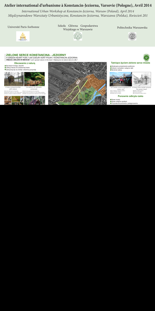 Atelier international d’urbanisme à Konstancin-Jeziorna, Varsovie (Pologne), Avril 2014 International Urban Workshop at Konstancin-Jeziorna, Warsaw (Poland), April 2014 Międzynarodowe Warsztaty Urbanistyczne, Konstancin-Jeziorna, Warszawa (Polska), Kwiecień 201 Université Paris-Sorbonne Szkoła Główna Gospodarstwa Wiejskiego w Warszawie Politechnika Warszawska K A GREEN HEART FOR // UN COEUR VERT POUR // KONSTANCIN-JEZIORNA JEZIORNA Tętniące życiem zielone serce miasta Obcowanie z naturą Na lewym brzegu Jeziorki Odkryjnaturęnacodziennejtrasie Zatrzymajsięnachwilęiobserwujprzyrodę On the left bank of Jeziorka Discover nature on your daily route Have a break to observe wild life I ZIELONE SERCE WIĘCEJ ZIELENI W MIEŚCIE ! Let’s sprawl nature in the town ! Déployons la nature dans la ville ! A new companionship with nature S TA NC N ZIELONE SERCE KONSTANCINA - JEZIORNY ON Atrakcyjneprzestrzeniepubliczne Kultura,rozrywkaiusługiwręki Nałonienatury La nature, un nouveau camarade Un centre vivant englobant le A lively town-center around coeur vert the green heart De meilleurs espaces publics Des activités variées Reliées par la nature Sur la rive gauche de la Jeziorka Découvrez la nature sur votre trajet quotidien Faites une pause pour observer la vie sauvage Better public spaces Diverse activities Connected through nature Ponownie odkryta rzeka Nowemosty Nowemiejscespotkań Przyrodadopoznaniaipielęgnowania Spokojne centrum Strefyruchuuspokojonegostworzą Ograniczenieruchukołowego WięcejNaturywmieście Bezpiecznąprzestrzeńdlawszystkichużytkowników Peaceful center Shared zones Quietroadswithreducedtraffic Sprawl nature in town Safe spaces for all users Redécouvrir la rivière De nouveaux ponts pour traverser la rivière De nouveaux lieux pour se rencontrer Une richesse naturelle à apprécier et à protéger Un centre apaisé Des zones de rencontre Des espaces plus calmes Plus de nature dans la ville Des espaces surs pour tous PARTNERS Central Park, NYC Fribourg, Germany New bridges to cross the river new places to meet Nature to enjoy and care for Tereny zieleni Greenareas Surfacesvégétales Nowy Ratusz Newityhall Nouvelhôteldeville Tereny podmokłe Marsh Marais Budynki uslug kultury i rekereacji Culturalandleisureservices Servicesculturelsetdeloisir Istniejące mosty i drogi Existingbridgesandpathways Pontsetcheminementsexistants Strefa rewitalizacji Revitalisationarea Airederégénération Projektowane ścieżki z drewna ProjectedWoodenpaths Cheminementsenboisprojetés Strefa intensyfikacji Intensificationarea Aired’intensification Projektowane ścieżki z betonowego podłoża Projectedpathsinconcreteground Cheminementsenstabiliséprojetés Istniejace budynki Existingbuildings bâtimentsexistants Anna Endzelm Alice Jaboeuf Anna Jachimowicz Simon Lefevre Emilien Mettler Claudine Pays Adam Potapowicz Rafal Swiatek Justyna Wykowska ORGANISATION Amiens, France Rediscover the river Oak Park, Chicago, USA K S TA NC I N ZIELONE SERCE KONSTANCINA - JEZIORNY ON ZIELONE SERCE GREEN HEART FOR // UN COEUR VERT POUR // KONSTANCIN - JEZIORNA WIĘCEJ ZIELENI W MIEŚCIE ! Let’s sprawl nature in the town ! Déployons la nature dans la ville ! UTWORZONY PRZEZ PROGRAM EDUKACYJNY FIRMY AUTODESK JEZIORNA PROJEKT ZAGOSPODAROWANIA PRZESTRZENNEGO OKOLICY PRZYSZŁEGO RATUSZA Project for the development in the future City Hall Projet d’aménagement des abords du futur Hôtel de ville Nowy Ratusz Widok na ul. Warszawską New city hall Nouvel hôtel de ville View of Warszawska Street Vue sur la rue de Varsovie Zabudowa o charakterze miejskim City houses Logements collectifs USŁUGI KULTURY I HANDLU PRZEDSZKOLE UTWORZONY PRZEZ PROGRAM EDUKACYJNY FIRMY AUTODESK UTWORZONY PRZEZ PROGRAM EDUKACYJNY FIRMY AUTODESK RATUSZ Widok na Rondo Armii Krajowej View on the National Army round-about Vue sur le rond-point de l’Armée nationale KINO «POD CHMURKĄ» SZKOŁA PODSTAWOWA AMFITEATR Zabudowa jednorodzinna willowa Family houses Logements individuels Widok na rzekę Jeziorkę View on Jeziorka river Vue sur la rivière Jeziorka HUGONÓWKA Kino pod chmurką UTWORZONY PRZEZ PROGRAM EDUKACYJNY FIRMY AUTODESK Outdoor cinema Cinéma en plein air PARTNERS ORGANISATION Widok na ul. Warszawską View of Warszawska Street Vue sur la rue de Varsovie Anna Endzelm Alice Jaboeuf Anna Jachimowicz Simon Lefevre Emilien Mettler Claudine Pays Adam Potapowicz Rafal Swiatek Justyna Wykowska Encadrants / Professors / Prowadzący Université Paris-Sorbonne Prof. dr. Hab. Anna Geppert dr. arch. Anne Pétillot Szkoła Główna Gospodarstwa Wiejskiego w Warszawie dr. inż. Mirosław Gajdak dr. inż. arch. Tomasz Majda Politechnika Warszawska dr. inż. arch. Wojciech Bartoszczuk dr. inż. Anna Bielska mgr. Agnieszka Kardaś dr. inż. Adrianna Kupidura