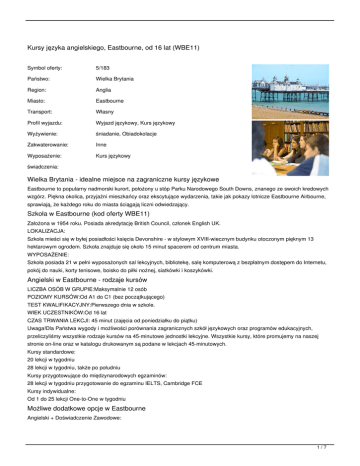 Kursy języka angielskiego, Eastbourne, od 16 lat (WBE11) Symbol oferty: 5/183 Państwo: Wielka Brytania Region: Anglia Miasto: Eastbourne Transport: Własny Profil wyjazdu: Wyjazd językowy, Kurs językowy Wyżywienie: śniadanie, Obiadokolacje Zakwaterowanie: Inne Wyposażenie: Kurs językowy świadczenia: Wielka Brytania - idealne miejsce na zagraniczne kursy językowe Eastbourne to popularny nadmorski kurort, położony u stóp Parku Narodowego South Downs, znanego ze swoich kredowych wzgórz. Piękna okolica, przyjaźni mieszkańcy oraz ekscytujące wydarzenia, takie jak pokazy lotnicze Eastbourne Airbourne, sprawiają, że każdego roku do miasta ściągają liczni odwiedzający. Szkoła w Eastbourne (kod oferty WBE11) Założona w 1954 roku. Posiada akredytację British Council, członek English UK. LOKALIZACJA: Szkoła mieści się w byłej posiadłości księcia Devonshire - w stylowym XVIII-wiecznym budynku otoczonym pięknym 13 hektarowym ogrodem. Szkoła znajduje się około 15 minut spacerem od centrum miasta. WYPOSAŻENIE: Szkoła posiada 21 w pełni wyposażonych sal lekcyjnych, bibliotekę, salę komputerową z bezpłatnym dostępem do Internetu, pokój do nauki, korty tenisowe, boisko do piłki nożnej, siatkówki i koszykówki. Angielski w Eastbourne - rodzaje kursów LICZBA OSÓB W GRUPIE:Maksymalnie 12 osób POZIOMY KURSÓW:Od A1 do C1 (bez początkującego) TEST KWALIFIKACYJNY:Pierwszego dnia w szkole. WIEK UCZESTNIKÓW:Od 16 lat CZAS TRWANIA LEKCJI: 45 minut (zajęcia od poniedziałku do piątku) Uwaga!Dla Państwa wygody i możliwości porównania zagranicznych szkół językowych oraz programów edukacyjnych, przeliczyliśmy wszystkie rodzaje kursów na 45-minutowe jednostki lekcyjne. Wszystkie kursy, które promujemy na naszej stronie on-line oraz w katalogu drukowanym są podane w lekcjach 45-minutowych. Kursy standardowe: 20 lekcji w tygodniu 28 lekcji w tygodniu, także po południu Kursy przygotowujące do międzynarodowych egzaminów: 28 lekcji w tygodniu przygotowanie do egzaminu IELTS, Cambridge FCE Kursy indywidualne: Od 1 do 25 lekcji One-to-One w tygodniu Możliwe dodatkowe opcje w Eastbourne Angielski + Doświadczenie Zawodowe: 1/7 Po odbytym kursie językowym student bierze udział w bezpłatnym stażu w jednej z brytyjskich firm lub organizacji. Do wyboru jest wiele różnych branż. Zajęcia pozalekcyjne Organizowane są przez szkołę i płatne na miejscu. Wyjścia na imprezy, zawody sportowe, wycieczki bliższe i dalsze, również poza Wielką Brytanię. Dostępne zakwaterowanie Od niedzieli do soboty/niedzieli Rodziny goszczące: pokoje 1-2-osobowe, łazienka dzielona z domownikami. Odległość: 5-35 minut pieszo. Rezydencja szkolna: pokoje wieloosobowe, łazienka dzielona. Rezydencja znajduje się w tym samym budynku, co szkoła. Dostępna tylko dla młodzieży 10-16 lat. Apartamenty: pokoje 1-osobowe. Dostępna w pełni wyposażona kuchnia. Odległość: 15-30 minut pieszo. Opcje wyżywienia dla wybranego zakwaterowania Rodziny goszczące: śniadania i obiadokolacje. Rezydencja szkolna: śniadanie, obiad i kolacja. Apartamenty: bez wyżywienia (wyżywienie we własnym zakresie). Transport i transfer Na życzenie organizujemy transport autokarem lub samolotem oraz transfer z/na lotnisko. Ubezpieczenie ATJ LINGWISTA gwarantuje Klientowi umowę ubezpieczeniową na okres wyjazdu: polisa SIGNAL IDUNA Polska Towarzystwo Ubezpieczeń S.A.. Z tytułu umowy Klientowi przysługują odszkodowania: od kosztów leczenia, od nieszczęśliwych wypadków, utrata bagażu. Kwoty ubezpieczenia: KL: (koszty leczenia) równowartość w PLN 10 000 EUR NNW: (nieszczęśliwe wypadki) 15000 PLN Bagaż: 800 PLN Istnieje możliwość zawarcia dodatkowego ubezpieczenia na wyższe kwoty za pośrednictwem naszej strony internetowej http://lingwista.com.pl/ubezpieczenia.html, jak również ubezpieczenie od kosztów rezygnacji z udziału w imprezie oraz od chorób przewlekłych (informacje na ten temat dostępne w naszym biurze lub u agenta). Cena podstawowa za wyjazd językowy obejmuje kurs językowy 20 lekcji w tygodniu wypożyczenie materiałów do nauki certyfikat ukończenia kursu ubezpieczenie KL/NNW/bagaż Cena podstawowa za wyjazd językowy nie obejmuje przelot odbiór z lotniska zakwaterowanie TERMINY: od: 2017-03-05 do: 2017-03-12 (8 dni), miejsca: sprawdź miejsca cena od: 1479 PLN od: 2017-03-05 do: 2017-03-19 (15 dni), miejsca: sprawdź miejsca cena od: 2569 PLN od: 2017-03-05 do: 2017-03-26 (22 dni), miejsca: sprawdź miejsca cena od: 3599 PLN od: 2017-03-05 do: 2017-04-02 (29 dni), miejsca: sprawdź miejsca cena od: 4629 PLN od: 2017-03-12 do: 2017-03-19 (8 dni), miejsca: sprawdź miejsca cena od: 1479 PLN od: 2017-03-12 do: 2017-03-26 (15 dni), miejsca: sprawdź miejsca cena od: 2569 PLN 2/7 od: 2017-03-12 do: 2017-04-02 (22 dni), miejsca: sprawdź miejsca cena od: 3599 PLN od: 2017-03-12 do: 2017-04-09 (29 dni), miejsca: sprawdź miejsca cena od: 4629 PLN od: 2017-03-19 do: 2017-03-26 (8 dni), miejsca: sprawdź miejsca cena od: 1479 PLN od: 2017-03-19 do: 2017-04-02 (15 dni), miejsca: sprawdź miejsca cena od: 2569 PLN od: 2017-03-19 do: 2017-04-09 (22 dni), miejsca: sprawdź miejsca cena od: 3599 PLN od: 2017-03-19 do: 2017-04-16 (29 dni), miejsca: sprawdź miejsca cena od: 4629 PLN od: 2017-03-26 do: 2017-04-02 (8 dni), miejsca: sprawdź miejsca cena od: 1479 PLN od: 2017-03-26 do: 2017-04-09 (15 dni), miejsca: sprawdź miejsca cena od: 2569 PLN od: 2017-03-26 do: 2017-04-16 (22 dni), miejsca: sprawdź miejsca cena od: 3599 PLN od: 2017-03-26 do: 2017-04-23 (29 dni), miejsca: sprawdź miejsca cena od: 4629 PLN od: 2017-04-02 do: 2017-04-09 (8 dni), miejsca: sprawdź miejsca cena od: 1479 PLN od: 2017-04-02 do: 2017-04-16 (15 dni), miejsca: sprawdź miejsca cena od: 2569 PLN od: 2017-04-02 do: 2017-04-23 (22 dni), miejsca: sprawdź miejsca cena od: 3599 PLN od: 2017-04-02 do: 2017-04-30 (29 dni), miejsca: sprawdź miejsca cena od: 4629 PLN od: 2017-04-09 do