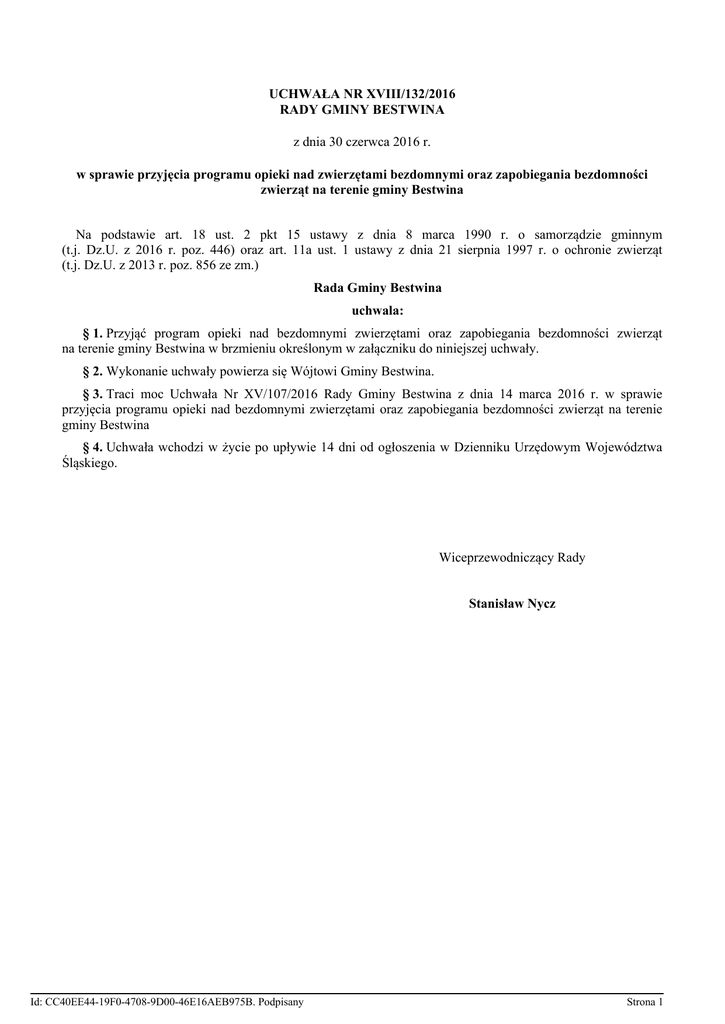 UCHWAŁA NR XVIII/132/2016 RADY GMINY BESTWINA z dnia 30 czerwca 2016 r. w sprawie przyjęcia programu opieki nad zwierzętami bezdomnymi oraz zapobiegania bezdomności zwierząt na terenie gminy Bestwina Na podstawie art. 18 ust. 2 pkt 15 ustawy z dnia 8 marca 1990 r. o samorządzie gminnym (t.j. Dz.U. z 2016 r. poz. 446) oraz art. 11a ust. 1 ustawy z dnia 21 sierpnia 1997 r. o ochronie zwierząt (t.j. Dz.U. z 2013 r. poz. 856 ze zm.) Rada Gminy Bestwina uchwala: § 1. Przyjąć program opieki nad bezdomnymi zwierzętami oraz zapobiegania bezdomności zwierząt na terenie gminy Bestwina w brzmieniu określonym w załączniku do niniejszej uchwały. § 2. Wykonanie uchwały powierza się Wójtowi Gminy Bestwina. § 3. Traci moc Uchwała Nr XV/107/2016 Rady Gminy Bestwina z dnia 14 marca 2016 r. w sprawie przyjęcia programu opieki nad bezdomnymi zwierzętami oraz zapobiegania bezdomności zwierząt na terenie gminy Bestwina § 4. Uchwała wchodzi w życie po upływie 14 dni od ogłoszenia w Dzienniku Urzędowym Województwa Śląskiego. Wiceprzewodniczący Rady Stanisław Nycz Id: CC40EE44-19F0-4708-9D00-46E16AEB975B. Podpisany Strona 1 Załącznik do Uchwały Nr XVIII/132/2016 Rady Gminy Bestwina z dnia 30 czerwca 2016r. PROGRAM OPIEKI NAD BEZDOMNYMI ZWIERZĘTAMI ORAZ ZAPOBIEGANIA BEZDOMNOŚCI ZWIERZĄT NA TERENIE GMINY BESTWINA I. Cele Programu § 1. Niniejszy program opieki nad bezdomnymi zwierzętami na terenie gminy Bestwina zwany dalej Programem, ma przyczynić się do osiągnięcia następujących celów: 1. Zapewnienia kompleksowej opieki zwierzętom bezdomnym na terenie gminy Bestwina, 2. Zapobieganiu bezdomności zwierząt. II. Realizacja Programu: § 2. 1. Wykonawcami odpowiedzialnymi za realizację programu są: 1) Urząd Gminy Bestwina, 2) Miejskie Schronisko dla Bezdomnych Zwierząt w Bielsku-Białej ul. Reksia 48, 43-305 Bielsko-Biała, zwane dalej Schroniskiem. 2. Program będzie realizowany przy współudziale następujących instytucji: 1) Policji, 2) organizacji, których statutowym celem działania jest ochrona zwierząt, a które swoim zasięgiem obejmują teren gminy Bestwina, 3) Państwowej Inspekcji Weterynaryjnej w Bielsku-Białej, 4) dzierżawców lub zarządców obwodów łowieckich z terenu gminy Bestwina. 3. Realizacja założonych celów nastąpi poprzez: 1) zapewnienie bezdomnym zwierzętom z terenu gminy Bestwina miejsca w Schronisku, 2) odławianie bezdomnych zwierząt i doprowadzanie ich do Schroniska, 3) opiekę nad wolno żyjącymi kotami, w tym ich dokarmianie, 4) poszukiwanie właścicieli dla bezdomnych zwierząt, 5) wskazanie gospodarstwa rolnego w celu zapewnienia miejsca dla zwierząt gospodarskich w przypadku niehumanitarnego ich traktowania, które zabłąkały się lub uciekły i poszkodowanych w wyniku zdarzeń drogowych, 6) zapewnienie całodobowej opieki weterynaryjnej, 7) usypianie ślepych miotów § 3. Zapewnienie bezdomnym zwierzętom miejsca w schronisku dla zwierząt 1. Gmina Bestwina zapewnia kompleksową opiekę zwierzętom bezdomnym w Schronisku na mocy zawartego Porozumienia międzygminnego z Gminą Bielsko-Biała. 2. Do Schroniska przyjmowane jest każde zwierzę bezdomne doprowadzane z terenu gminy Bestwina. Id: CC40EE44-19F0-4708-9D00-46E16AEB975B. Podpisany Strona 1 3. Schronisko funkcjonuje całodobowo w zakresie odławiania i przyjmowania zwierząt bezdomnych, agresywnych oraz tych, które uległy wypadkom drogowym i podejmuje natychmiastowe działania w celu przewiezienia tych zwierząt do Schroniska. 4. W schronisku sprawowana jest całodobowa opieka nad przebywającymi w nim zwierzętami. § 4. Opieka nad wolno żyjącymi kotami, w tym ich dokarmianie 1. Opieka nad wolno żyjącymi kotami obejmuje ich dokarmianie i zapewnienie wody pitnej, w przypadku powzięcia przez Urząd Gminy Bestwina informacji o miejscu, w którym takie koty występują. 2. Dokarmianie zwierząt wykonują pracownicy Urzędu Gminy Bestwina. § 5. Odławianie bezdomnych zwierząt 1. Odławianie bezdomnych zwierząt i umieszczanie ich w schronisku będzie miało charakter stały a podejmowane będzie na skutek interwencji mieszkańców Gminy Bestwina, zgłoszonej w Urzędzie Gminy Bestwina lub Policji. 2. Odławianie i umieszczane w Schronisku będą zwierzęta pozostawione bez opieki i nadzoru. 3. Odławianie zwierząt będzie prowadzone wyłącznie przez służby Schroniska. § 6. Sterylizacja i kastracja zwierząt bezdomnych, usypianie ślepych miotów 1. Obligatoryjna sterylizacja i kastracja zwierząt przebywających w Schronisku wykonywana będzie przez lekarza weterynarii na podstawie umowy ze Schroniskiem. 2. Sterylizacji i kastracji nie będą poddawane zwierzęta, u których istnieją przeciwskazania do wykonania w/w zabiegów. 3. Usypianie ślepych miotów dokonywane będzie w Schronisku przez wymienionego wyżej lekarza weterynarii. Usypianiu poddawane będą ślepe mioty dostarczone do Schroniska przez jego pracowników. Zabieg wykonywany będzie zgodnie z zasadami humanitarnego traktowania i uśmiercania zwierząt. § 7. Poszukiwanie właścicieli dla bezdomnych zwierząt Gmina Bestwina prowadzi działania zmierzające do znalezienia właścicieli dla bezdomnych zwierząt poprzez: 1. Podejmowanie starań w Schronisku zwierząt, w celu znalezienia odpowiednich właścicieli dla przebywających 2. Zamieszczanie ogłoszeń na stronie internetowej BIP i tablicach ogłoszeń o zwierzętach przebywających w Schronisku przeznaczonych do adopcji. § 8. Wskazanie gospodarstwa rolnego w celu zapewnienia miejsca dla zwierząt gospodarskich Jako czasowe miejsce dla zwierząt gospodarskich wyznacza się gospodarstwo rolne Pana Łukasza Maroszek, ul. Witosa 107 w Bestwinie § 9. Id: CC40EE44-19F0-4708-9D00-46E16AEB975B. Podpisany Strona 2 Zapewnienie całodobowej opieki weterynaryjnej w przypadku zdarzeń drogowych z udziałem zwierząt Na mocy zawartego porozumienia międzygminnego pomiędzy Gminą Bielsko-Biała a Gminą Bestwina Schronisko przyjmu