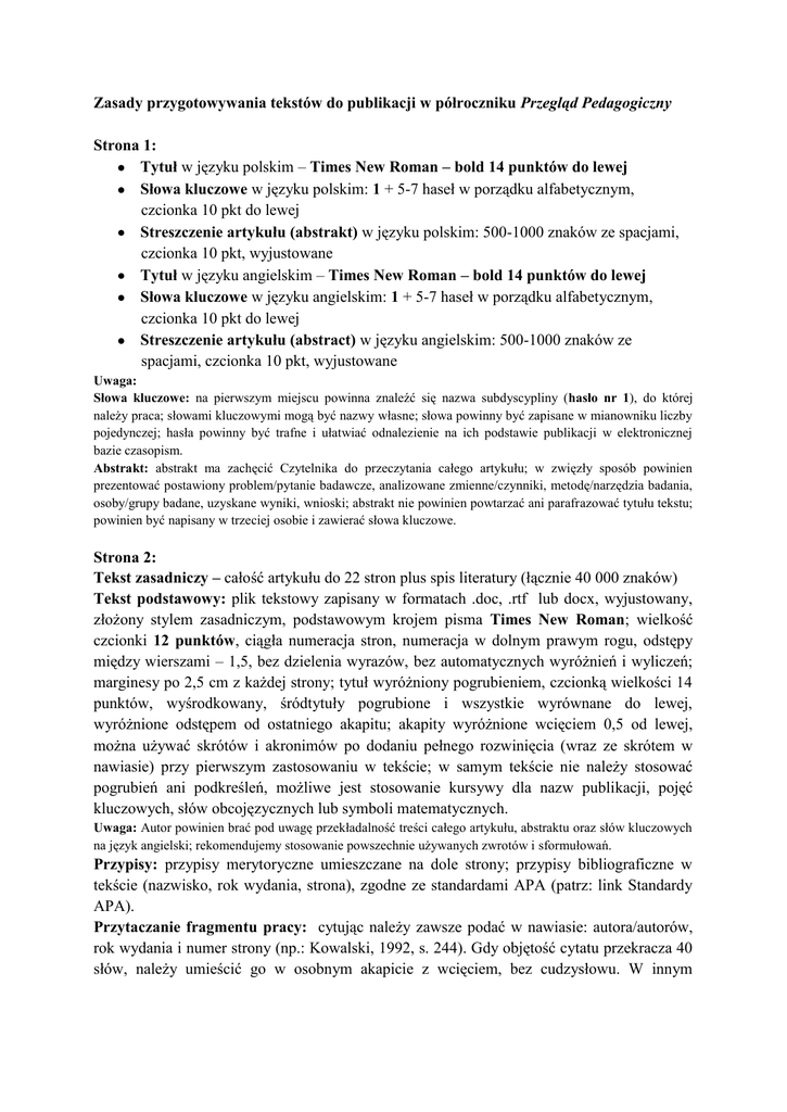 Zasady przygotowywania tekstów do publikacji w półroczniku Przegląd Pedagogiczny Strona 1: Tytuł w języku polskim – Times New Roman – bold 14 punktów do lewej Słowa kluczowe w języku polskim: 1 + 5-7 haseł w porządku alfabetycznym, czcionka 10 pkt do lewej Streszczenie artykułu (abstrakt) w języku polskim: 500-1000 znaków ze spacjami, czcionka 10 pkt, wyjustowane Tytuł w języku angielskim – Times New Roman – bold 14 punktów do lewej Słowa kluczowe w języku angielskim: 1 + 5-7 haseł w porządku alfabetycznym, czcionka 10 pkt do lewej Streszczenie artykułu (abstract) w języku angielskim: 500-1000 znaków ze spacjami, czcionka 10 pkt, wyjustowane Uwaga: Słowa kluczowe: na pierwszym miejscu powinna znaleźć się nazwa subdyscypliny (hasło nr 1), do której należy praca; słowami kluczowymi mogą być nazwy własne; słowa powinny być zapisane w mianowniku liczby pojedynczej; hasła powinny być trafne i ułatwiać odnalezienie na ich podstawie publikacji w elektronicznej bazie czasopism. Abstrakt: abstrakt ma zachęcić Czytelnika do przeczytania całego artykułu; w zwięzły sposób powinien prezentować postawiony problem/pytanie badawcze, analizowane zmienne/czynniki, metodę/narzędzia badania, osoby/grupy badane, uzyskane wyniki, wnioski; abstrakt nie powinien powtarzać ani parafrazować tytułu tekstu; powinien być napisany w trzeciej osobie i zawierać słowa kluczowe. Strona 2: Tekst zasadniczy – całość artykułu do 22 stron plus spis literatury (łącznie 40 000 znaków) Tekst podstawowy: plik tekstowy zapisany w formatach .doc, .rtf lub docx, wyjustowany, złożony stylem zasadniczym, podstawowym krojem pisma Times New Roman; wielkość czcionki 12 punktów, ciągła numeracja stron, numeracja w dolnym prawym rogu, odstępy między wierszami – 1,5, bez dzielenia wyrazów, bez automatycznych wyróżnień i wyliczeń; marginesy po 2,5 cm z każdej strony; tytuł wyróżniony pogrubieniem, czcionką wielkości 14 punktów, wyśrodkowany, śródtytuły pogrubione i wszystkie wyrównane do lewej, wyróżnione odstępem od ostatniego akapitu; akapity wyróżnione wcięciem 0,5 od lewej, można używać skrótów i akronimów po dodaniu pełnego rozwinięcia (wraz ze skrótem w nawiasie) przy pierwszym zastosowaniu w tekście; w samym tekście nie należy stosować pogrubień ani podkreśleń, możliwe jest stosowanie kursywy dla nazw publikacji, pojęć kluczowych, słów obcojęzycznych lub symboli matematycznych. Uwaga: Autor powinien brać pod uwagę przekładalność treści całego artykułu, abstraktu oraz słów kluczowych na język angielski; rekomendujemy stosowanie powszechnie używanych zwrotów i sformułowań. Przypisy: przypisy merytoryczne umieszczane na dole strony; przypisy bibliograficzne w tekście (nazwisko, rok wydania, strona), zgodne ze standardami APA (patrz: link Standardy APA). Przytaczanie fragmentu pracy: cytując należy zawsze podać w nawiasie: autora/autorów, rok wydania i numer strony (np.: Kowalski, 1992, s. 244). Gdy objętość cytatu przekracza 40 słów, należy umieścić go w osobnym akapicie z wcięciem, bez cudzysłowu. W innym przypadku fragment umieszcza się w linii właściwego tekstu, w cudzysłowie. Nie należy stosować kursywy. Tabele: treść tabeli – Times New Roman 11 pkt; tytuł tabeli – NAD tabelą – Times New Roman 12 pkt, do lewej; słowo „Tabela” oraz numer porządkowy (bez kropki) pisany zwykłą czcionką, tytuł tabeli pisany w kolejnym wierszu kursywą. Rysunki: tytuł POD rysunkiem zatytułowany Rys. …; słowo Rysunek” oraz numer porządkowy należy zapisać kursywą, natomiast tytuł w zwyczajny sposób, w linii właściwego tekstu. Wykresy: czarno-białe lub stopniowana szarość; w pliku tekstowym lub arkuszu kalkulacyjnym – edytowalne; zatytułowane jako Rys. … - pod wykresem (Times New Roman 12 pkt, do lewej); obszar wykresu – Times New Roman 11 pkt. Uwaga: schematy graficzne prosimy dostosować do formatu kolumny; opisy na wykresach powinny być proporcjonalne do wielkości rysunku; wszystkie tabele, wykresy i rysunki powinny być edytowalne, aby można było je dopasować do łam czasopisma; w tym celu należy załączyć je wraz z tytułami na końcu pliku z artykułem (po literaturze), pozostawiając ich tytuł w miejscu występowania w tekście; Autor nie powinien szczegółowo opisywać w tekście danych zilustrowanych na grafice/w tabelach. Literatura: format not bibliograficznych tworzony zgodnie ze standardem APA, na końcu dokumentu i w kolejności alfabetycznej od nazwiska pierwszego autora, bez numeracji, tytuł każdej pracy wyrównany do lewego marginesu, bez wcięcia, kolejne wiersze kontynuowanego opisu bibliograficznego należy zapisać z wcięciem 0,5 od lewej (nie używać klawisza spacji, posłużyć się tabulatorem). Przykładowy format opisu literatury 1. Publikacje książkowe: Śliwerski B. (2013). Diagnoza uspołecznienia publicznego szkolnictwa III RP w gorsecie centralizmu. Kraków: Oficyna Wydawnicza „Impuls”. Simon S.B., Hawley, R.C. i Britton D.D. (1992). Krystalizacja wartości. Ćwiczenia pisemne dla rozwoju osobowego. Toruń – Poznań: Wydawnictwo „Edytor”. Cichosz M., Leppert R. (red.) (2011). Współczesne środowiska wychowawcze. Stan obecny i kierunki przemian. Bydgoszcz: Wydawnictwo KPSW. Czerepaniak-Walczak M. (2010). Uniwersytet – instytucja naukowo-edukacyjna czy przedsiębiorstwo? Szkoła wyższa w procesie zmiany. W: J. Piekarski, D. Urbaniak-Zając (red.), Innowacje w edukacji akademickiej. Szkolnictwo wyższe w procesie zmiany. Łódź: Wydawnictwo UŁ. 2. Artykuły: Gara J. (w druku). Specyfika polskiej recepcji twórczości Johanna Friedricha Herbarta. Przegląd Pedagogiczny, 2012(2) Bukraba-Rylska I. (2013). Od wiejskich festynów do organoleptycznej koncepcji kultury. Kultura i Edukacja, 94(1), 7 – 21. 3. Referaty i prace nieopublikowane: Kowalski S. (2013). Nierówności edukacyjne w małych 