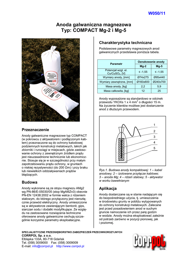 W050/11 Anoda galwaniczna magnezowa Typ: COMPACT Mg-2 i Mg-5 Charakterystyka techniczna Podstawowe parametry magnezowych anod galwanicznych przedstawia poniŜsza tabela. Parametr Oznakowanie anody Mg-2 Mg-5 ≤ -1,55 ≤ -1,55 Ø74x275 Ø95x440 Wymiary zewnętrzne, [mm] Ø160x600 Ø240x700 Masa anody, [kg] 2,2 5,9 Masa całkowita, [kg] 12 25 Potencjał wzgl. el. Cu/CuSO4, [V] Wymiary anody, [mm] Anody wyposaŜone są standardowo w odcinek 2 przewodu YKOXs 1 x 4 mm o długości 15 m. Na Ŝyczenie klientów moŜliwe jest dostarczenie anod z dłuŜszym przewodem. 1 Przeznaczenie Anody galwaniczne magnezowe typ COMPACT (w pokrowcu z aktywatorem i podłączonym kablem) przeznaczone są do ochrony katodowej podziemnych konstrukcji metalowych, takich jak zbiorniki i rurociągi w miejscach, gdzie zastosowanie ochrony z zewnętrznym źródłem prądu jest nieuzasadnione technicznie lub ekonomicznie. Stosuje się je w szczególności przy małym zapotrzebowaniu prądu ochrony, w gruntach o niskiej rezystywności (do 200 Ωm) i przy braku lub niewielkich oddziaływaniach prądów błądzących. Budowa Anody wykonane są ze stopu magnezu AMg2 wg PN-86/E-05030/05 (stop MgAl6Zn3) obecnie PN-EN 12438:2002 w formie walca z rdzeniem stalowym, do którego przyłączony jest nierozłącznie przewód elektryczny. Anody umieszczone są w aktywatorze zawierającym bentonit, gips, siarczan sodu i dodatki modyfikujące. Ze względu na zastosowane rozwiązania techniczne oferowane anody galwaniczne cechują szczególnie korzystne parametry eksploatacyjne. 2 3 4 5 Rys.1. Budowa anody kompaktowej: 1 – kabel anodowy; 2 – izolowane przyłącze kablowe; 3 – anoda Mg; 4 – rdzeń stalowy; 5 - aktywator w worku bawełnianym Aplikacja Anody dostarczane są w stanie nadającym się do bezpośredniego uŜycia, tj. umieszczenia w środowisku gruntu w pobliŜu wytypowanych do ochrony konstrukcji metalowych. Zalecane jest przed posadowieniem anod w suchym gruncie namoczenie ich przez parę godzin w wodzie. Anody moŜna eksploatować zaleŜnie od potrzeb zarówno w pozycji pionowej, jak i poziomej. SPECJALISTYCZNE PRZEDSIĘBIORSTWO ZABEZPIECZEŃ PRZECIWKOROZYJNYCH CORRPOL Sp. z o.o. Elbląska 133A, 80-718 Gdańsk Tel. (058) 3009000 Fax: (058) 3009009 E-mail: [email protected] http://www.corrpol.pl