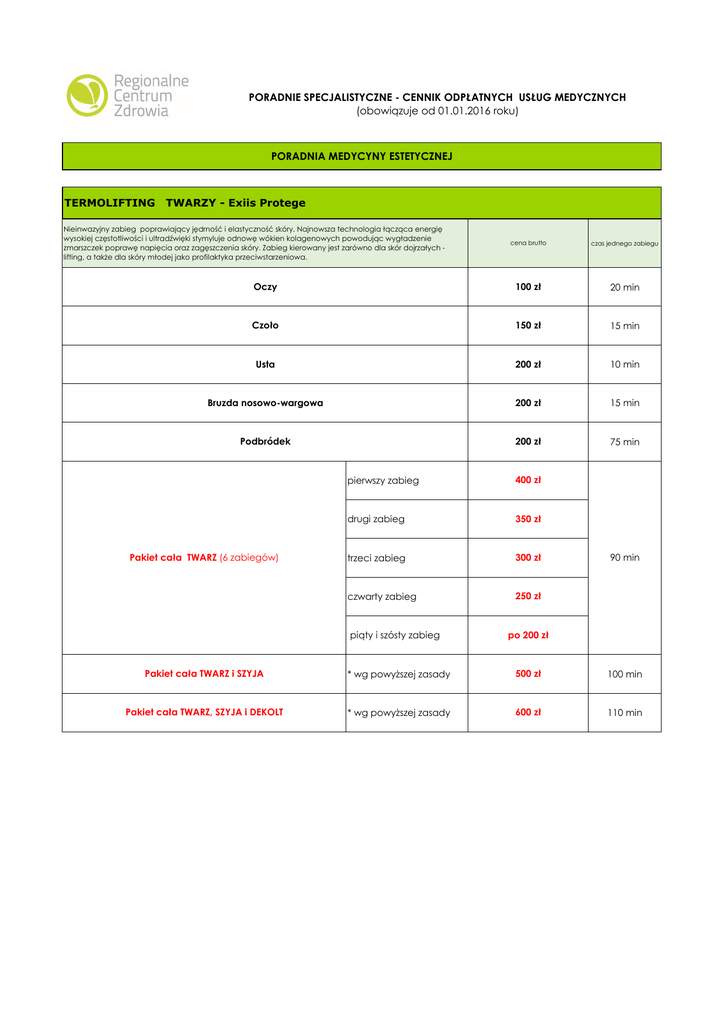 PORADNIE SPECJALISTYCZNE - CENNIK ODPŁATNYCH USŁUG MEDYCZNYCH (obowiązuje od 01.01.2016 roku) PORADNIA MEDYCYNY ESTETYCZNEJ TERMOLIFTING TWARZY - Exiis Protege Nieinwazyjny zabieg poprawiający jędrność i elastyczność skóry. Najnowsza technologia łącząca energię wysokiej częstotliwości i ultradźwięki stymyluje odnowę wókien kolagenowych powodując wygładzenie zmarszczek poprawę napięcia oraz zagęszczenia skóry. Zabieg kierowany jest zarówno dla skór dojrzałych lifting, a także dla skóry młodej jako profilaktyka przeciwstarzeniowa. cena brutto czas jednego zabiegu Oczy 100 zł 20 min Czoło 150 zł 15 min Usta 200 zł 10 min Bruzda nosowo-wargowa 200 zł 15 min Podbródek 200 zł 75 min Pakiet cała TWARZ (6 zabiegów) pierwszy zabieg 400 zł drugi zabieg 350 zł trzeci zabieg 300 zł czwarty zabieg 250 zł piąty i szósty zabieg 90 min po 200 zł Pakiet cała TWARZ i SZYJA * wg powyższej zasady 500 zł 100 min Pakiet cała TWARZ, SZYJA i DEKOLT * wg powyższej zasady 600 zł 110 min PORADNIE SPECJALISTYCZNE - CENNIK ODPŁATNYCH USŁUG MEDYCZNYCH (obowiązuje od 01.01.2016 roku) PORADNIA MEDYCYNY ESTETYCZNEJ MODELOWANIE SYLWETKI - Exilis Bezinwazyjny system do modelowania sylwetki oraz redukcji tkanki tłuszczowej. Urządzenie pracuje w technologi RID - trzy etapy pozbycia się nadmiaru tkanki tłuszczowej. Ultradźwięki i energia o wysokiej częstotliwości przenikają w głąb skóry powodując przerwania struktur tłuszczowych, odizolowanie ich i wewnętrzne rozgrzanie. Proces ten uruchamia miejscową lipolizę (rozpad komórek tłuszczowych), a co za tym idzie zmniejszenie zbędnych centymetrów. EAT Skin Shock System (cellulit, blizny, rozstępy) 1 obszar zabiegowy czas jednego zabiegu 100 zł ok. 30 min Pakiet brązowy 3 przyłożenia x 200 zł + 1 przyłożenie gratis 600 zł ok. 1 h Pakiet srebrny 3 przyłożenia x 200 zł + 1 przyłożenie gratis + konsultacja dietetyka 660 zł 1h 15 min Pakiet złoty 3 zabiegi x 250 zł + 1 zabieg gratis 750 zł ok.3o min Pakiet platynowy Pakiet złoty + EAT + konsultacja dietetyka 900 zł KRIOLIPOLIZA (redukcja tkanki tłuszczowej) EXILIS (wyszczuplanie, pojędrnianie, wygłaszanie) cena brutto Klinika przemian 1 zabieg 500 zł Klinika przemian 2 zabieg 450 zł HYBRYDOWE MODELOWANIE CIAŁA KRIO + EXILIS + EAT Klinika przemian 3 zabieg 400 zł Klinika przemian 4 zabieg 350 zł PORADNIE SPECJALISTYCZNE - CENNIK ODPŁATNYCH USŁUG MEDYCZNYCH (obowiązuje od 01.11.2016 roku) PORADNIA MEDYCYNY ESTETYCZNEJ KARBOKSYTERAPIA Zabieg karboksyterapii polega na śródskórnej lub podskórnej iniekcji dwutlenku węgla za pomocą urządzenia CARBOXYTERAPY DUAL MC2. Kosmetolog precyzyjnie podaje kontrolowane dawki dwutlenku węgla w oparciu o stan zdrowia pacjenta i procedury zabiegowe. Podanie dwutlenku węgla jest nterpretowane przez organizm jako niedotlenienie, co powoduje określoną, pozytywną odpowiedź immunologiczną organizmu. W zależności od głębokości, kąta iniekcji, oraz dawki CO2 uzyskujemy określoną reakcję organizmu : rewitalizacja skóry, poprawa drenażu, poprawa jędrności i elastyczności, eliminacja tkanki tłuszczowej, redukcja rozstępów, cellulitu, stymulacja odnowy komórkowej. Biorewitalizacja skóry, niwelowanie zmarszczek Biorewitalizacja dłoni cena brutto czas jednego zabiegu 850 zł 35 min Pakiet 6 zabiegów (5 x 170zł + szósty zab.gratis ) twarz Pakiet 6 zabiegów (5 x 200zł + szósty zab.gratis ) twarz + szyja 1 000 zł 40 min Pakiet 6 zabiegów (5 x 250zł + szósty zab. gratis) twarz, szyja dekolt 1 250 zł 45 min Pakiet 6 zabiegów (5 x 100zł + szósty zab. gratis) dłonie 500 zł 30 min Pakiet 4 zabiegów (3 x 150 + czwarty zab.gratis) dolna powieka 450 zł 20 min Pakiet 4 zabiegów (3 x 180zł +czwarty zab.gratis) górna i dolna powieka 540 zł 25 min 1 000 zł 20 min 1 obszar ( uda, pośladki, brzuch, ramiona) 1 000 zł 30 min 2 obszary 1 500 zł 45 min 1 obszar (uda, pośladki, brzuch, ramiona) 1 000 zł 15-40 min 1 obszar (ramiona, brzuch kolana 800 zł 35 min 1 250 zł 45 min Cienie, obrzęki pod oczami Wypadanie włosów Cellulit, redukcja tkanki tłuszczowej Pakiet 6 zabiegów (5 x 200zł + szósty zab. gratis) Pakiet 6 zabiegów (5 x 200zł + szósty zab.gratis), (5 x 300zł +szósty zab.gratis) Blizny, rozstępy Pakiet 6 zabiegów (5 x 200zł + szósty zab. gratis) Biorewitalizacja skóry ciała Pakiet 6 zabiegów (5 x 160zł + szósty zab.gratis), (5 x 250zł + szósty zab.gratis) skóra głowy 2 obszary PORADNIE SPECJALISTYCZNE - CENNIK ODPŁATNYCH USŁUG MEDYCZNYCH (obowiązuje od 01.11.2016 roku) PORADNIA MEDYCYNY ESTETYCZNEJ INTRAJECT zabiegi z plazmą azotową Zabiegi z wykorzystaniem plazmy azotowej, czwartego stanu skupienia. Bezoperacyjna metoda dogłębnej regeneracji skóry, liftingu i wygładzenia bruzd i zmarszczek. Doskonale sprawdza się w blefaroplastyce powiek (niechirurgiczny lifting powiek) oraz w usuwaniu wszelkiego roddzaju zmian spowodowanych upływem czasu. Wypełnianie zmarszczek i głębokich bruzd cena brutto PROMOCJA czas jednego zabiegu okolica oczu 500 zł 300 zł 40 min twarz 800 zł 500 zł 50 min twarz +szyja Blefaroplasyka powiek Leczenie rogowacenia starczego, łojotokowego, brodawki starcze 1 000 zł powieki 600 zł 1 300 zł twarz / szyja / ciało 1h 500 zł 1h 30-50 min MIKRONAKŁUWANIE i RADIOFREKWENCJA cena brutto Niechirurgiczny lifting (progresywna regenercja) Zabieg ujędrniający demkijaż, peeling kawitacyjny, twarz sonoforeza, RF-igłowa, elektroporacja, ampułka, maska ochronna * sugerowane 4 zabiegi co 4-6 twarz + szyja tyg. demkijaż, fala radiowa, elektroporacja, ampułka, maska ochronna * sugerowane 5 zabiegów co tydzień peeling kawitacyjny, elektroporacja igłowa, ampułka czas jednego zabiegu 500 zł 350,00 zł 1h 600 zł 400,00 zł 1h, 20min twarz 150,00 zł 40 min twarz + szyja 200,00 zł 1h 300 zł 50 min 400 zł 1h, 15min 200 zł 40 min 1 obszar na ciele (biust, odtłuszczenie, peeling brzuch, pośladki, uda) 