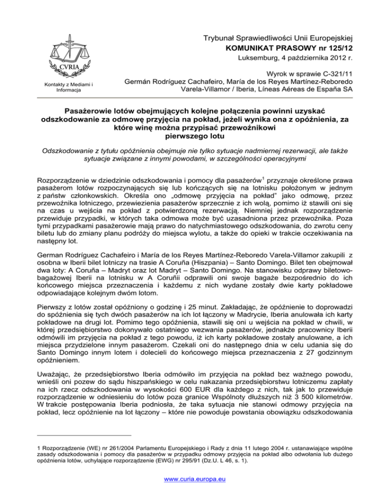Trybunał Sprawiedliwości Unii Europejskiej KOMUNIKAT PRASOWY nr 125/12 Luksemburg, 4 października 2012 r. Kontakty z Mediami i Informacja Wyrok w sprawie C-321/11 Germán Rodríguez Cachafeiro, María de los Reyes Martínez-Reboredo Varela-Villamor / Iberia, Líneas Aéreas de España SA Pasażerowie lotów obejmujących kolejne połączenia powinni uzyskać odszkodowanie za odmowę przyjęcia na pokład, jeżeli wynika ona z opóźnienia, za które winę można przypisać przewoźnikowi pierwszego lotu Odszkodowanie z tytułu opóźnienia obejmuje nie tylko sytuacje nadmiernej rezerwacji, ale także sytuacje związane z innymi powodami, w szczególności operacyjnymi Rozporządzenie w dziedzinie odszkodowania i pomocy dla pasażerów 1 przyznaje określone prawa pasażerom lotów rozpoczynających się lub kończących się na lotnisku położonym w jednym z państw członkowskich. Określa ono „odmowę przyjęcia na pokład” jako odmowę, przez przewoźnika lotniczego, przewiezienia pasażerów sprzecznie z ich wolą, pomimo iż stawili oni się na czas u wejścia na pokład z potwierdzoną rezerwacją. Niemniej jednak rozporządzenie przewiduje przypadki, w których taka odmowa może być uzasadniona przez przewoźnika. Poza tymi przypadkami pasażerowie mają prawo do natychmiastowego odszkodowania, do zwrotu ceny biletu lub do zmiany planu podróży do miejsca wylotu, a także do opieki w trakcie oczekiwania na następny lot. German Rodríguez Cachafeiro i María de los Reyes Martínez-Reboredo Varela-Villamor zakupili z osobna w Iberii bilet lotniczy na trasie A Coruña (Hiszpania) – Santo Domingo. Bilet ten obejmował dwa loty: A Coruña – Madryt oraz lot Madryt – Santo Domingo. Na stanowisku odprawy biletowobagażowej Iberii na lotnisku w A Coruñii odprawili oni swoje bagaże bezpośrednio do ich końcowego miejsca przeznaczenia i każdemu z nich wydane zostały dwie karty pokładowe odpowiadające kolejnym dwóm lotom. Pierwszy z lotów został opóźniony o godzinę i 25 minut. Zakładając, że opóźnienie to doprowadzi do spóźnienia się tych dwóch pasażerów na ich lot łączony w Madrycie, Iberia anulowała ich karty pokładowe na drugi lot. Pomimo tego opóźnienia, stawili się oni u wejścia na pokład w chwili, w której przedsiębiorstwo dokonywało ostatniego wezwania pasażerów, jednakże pracownicy Iberii odmówili im przyjęcia na pokład z tego powodu, iż ich karty pokładowe zostały anulowane, a ich miejsca przydzielone innym pasażerom. Czekali oni do następnego dnia w celu udania się do Santo Domingo innym lotem i dolecieli do końcowego miejsca przeznaczenia z 27 godzinnym opóźnieniem. Uważając, że przedsiębiorstwo Iberia odmówiło im przyjęcia na pokład bez ważnego powodu, wnieśli oni pozew do sądu hiszpańskiego w celu nakazania przedsiębiorstwu lotniczemu zapłaty na ich rzecz odszkodowania w wysokości 600 EUR dla każdego z nich, tak jak to przewiduje rozporządzenie w odniesieniu do lotów poza granice Wspólnoty dłuższych niż 3 500 kilometrów. W trakcie postępowania Iberia podniosła, że taka sytuacja nie stanowi odmowy przyjęcia na pokład, lecz opóźnienie na lot łączony – które nie powoduje powstania obowiązku odszkodowania 1 Rozporządzenie (WE) nr 261/2004 Parlamentu Europejskiego i Rady z dnia 11 lutego 2004 r. ustanawiające wspólne zasady odszkodowania i pomocy dla pasażerów w przypadku odmowy przyjęcia na pokład albo odwołania lub dużego opóźnienia lotów, uchylające rozporządzenie (EWG) nr 295/91 (Dz.U. L 46, s. 1). www.curia.europa.eu – ponieważ decyzja o odmowie przyjęcia na pokład nie wynikała z nadmiernej rezerwacji, lecz z opóźnienia wcześniejszego lotu. W tych okolicznościach sąd krajowy, który skierował do Trybunału Sprawiedliwości pytanie prejudycjalne, zmierza do ustalenia, czy pojęcie „odmowa przyjęcia na pokład” obejmuje wyłącznie sytuacje, w których loty były przedmiotem pierwotnej nadmiernej rezerwacji, czy też pojęcie to może zostać rozciągnięte na inne sytuacje. W dzisiejszym wyrok Trybunał stwierdził, że pojęcie „odmowa przyjęcia na pokład” obejmuje sytuacje nadmiernej rezerwacji, ale także sytuacje związane z innymi powodami, w szczególności operacyjnymi. Taka wykładnia wynika nie tylko z treści rozporządzenia, ale również z zamierzonego przezeń celu, to znaczy – zagwarantowania wysokiego poziomu ochrony pasażerów lotniczych. W rzeczywistości bowiem to w celu zredukowania nadmiernej liczby pasażerów, którym odmówiono przyjęcia na pokład wbrew ich woli, prawodawca Unii ustanowił w 2004 r. nowe rozporządzenie przyznając szersze znaczenie pojęciu odmowa przyjęcia na pokład, obejmując wszystkie sytuacje, w których przewoźnik lotniczy odmawia przewiezienia pasażera. Tym samym ograniczenie pojęcia „odmowa przyjęcia na pokład” do samych tylko przypadków nadmiernej rezerwacji skutkowałaby w praktyce znacznym zmniejszeniem zakresu ochrony przyznanej pasażerom poprzez pozbawienie ich wszelkiej ochrony nawet wówczas, gdy znajdują się w sytuacji, za którą podobnie jak w przypadku nadmiernej rezerwacji, nie ponoszą winy – co byłoby sprzeczne z celem prawodawcy. Ponadto rozporządzenie przewiduje przypadki, w których odmowa przyjęcia na pokład jest uzasadniona w szczególności przyczynami związanymi ze zdrowiem, wymogami bezpieczeństwa lub niewłaściwymi dokumentami podróżnymi. Tymczasem Trybunał stanął na stanowisku, że odmowa przyjęcia na pokład taka jak w niniejszej sprawie nie może zostać zrównana z takimi przyczynami, ponieważ winy za taki powód nie można przypisać pasażerom. Z kolei w każdym razie winę za taką odmowę można przypisać przewoźnikowi. W istocie bowiem, albo spowodował on opóźnienie pierwszego wykonywanego przezeń lotu; albo błędnie przyjął, że pasażerowie ci nie będą w stanie stawić się na czas u wejścia na pokład w celu odby