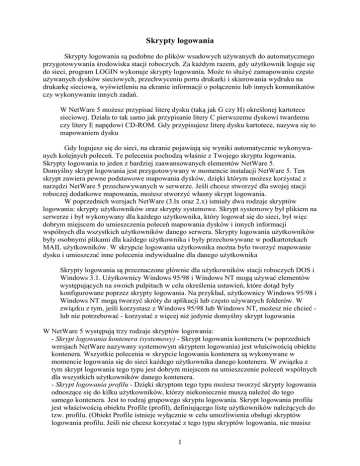 Skrypty logowania Skrypty logowania są podobne do plików wsadowych używanych do automatycznego przygotowywania środowiska stacji roboczych. Za każdym razem, gdy użytkownik loguje się do sieci, program LOGIN wykonuje skrypty logowania. Może to służyć zamapowaniu często używanych dysków sieciowych, przechwyceniu portu drukarki i skierowania wydruku na drukarkę sieciową, wyświetleniu na ekranie informacji o połączeniu lub innych komunikatów czy wykonywaniu innych zadań. W NetWare 5 możesz przypisać literę dysku (taką jak G czy H) określonej kartotece sieciowej. Działa to tak samo jak przypisanie litery C pierwszemu dyskowi twardemu czy litery E napędowi CD-ROM. Gdy przypisujesz literę dysku kartotece, nazywa się to mapowaniem dysku Gdy logujesz się do sieci, na ekranie pojawiają się wyniki automatycznie wykonywanych kolejnych poleceń. Te polecenia pochodzą właśnie z Twojego skryptu logowania. Skrypty logowania to jeden z bardziej zaawansowanych elementów NetWare 5. Domyślny skrypt logowania jest przygotowywany w momencie instalacji NetWare 5. Ten skrypt zawiera pewne podstawowe mapowania dysków, dzięki którym możesz korzystać z narzędzi NetWare 5 przechowywanych w serwerze. Jeśli chcesz stworzyć dla swojej stacji roboczej dodatkowe mapowania, możesz stworzyć własny skrypt logowania. W poprzednich wersjach NetWare (3.lx oraz 2.x) istniały dwa rodzaje skryptów logowania: skrypty użytkowników oraz skrypty systemowe. Skrypt systemowy był plikiem na serwerze i był wykonywany dla każdego użytkownika, który logował się do sieci, był więc dobrym miejscem do umieszczenia poleceń mapowania dysków i innych informacji wspólnych dla wszystkich użytkowników danego serwera. Skrypty logowania użytkowników były osobnymi plikami dla każdego użytkownika i były przechowywane w podkartotekach MAIL użytkowników. W skrypcie logowania użytkownika można było tworzyć mapowanie dysku i umieszczać inne polecenia indywidualne dla danego użytkownika Skrypty logowania są przeznaczone głównie dla użytkowników stacji roboczych DOS i Windows 3.1. Użytkownicy Windows 95/98 i Windows NT mogą używać elementów występujących na swoich pulpitach w celu określenia ustawień, które dotąd były konfigurowane poprzez skrypty logowania. Na przykład, użytkownicy Windows 95/98 i Windows NT mogą tworzyć skróty do aplikacji lub często używanych folderów. W związku z tym, jeśli korzystasz z Windows 95/98 lub Windows NT, możesz nie chcieć lub nie potrzebować - korzystać z więcej niż jedynie domyślny skrypt logowania W NetWare 5 występują trzy rodzaje skryptów logowania: - Skrypt logowania kontenera (systemowy) - Skrypt logowania kontenera (w poprzednich wersjach NetWare nazywany systemowym skryptem logowania) jest właściwością obiektu kontenera. Wszystkie polecenia w skrypcie logowania kontenera są wykonywane w momencie logowania się do sieci każdego użytkownika danego kontenera. W związku z tym skrypt logowania tego typu jest dobrym miejscem na umieszczenie poleceń wspólnych dla wszystkich użytkowników danego kontenera. - Skrypt logowania profilu - Dzięki skryptom tego typu możesz tworzyć skrypty logowania odnoszące się do kilku użytkowników, którzy niekoniecznie muszą należeć do tego samego kontenera. Jest to rodzaj grupowego skryptu logowania. Skrypt logowania profilu jest właściwością obiektu Profile (profil), definiującego listę użytkowników należących do tzw. profilu. (Obiekt Profile istnieje wyłącznie w celu umożliwienia obsługi skryptów logowania profilu. Jeśli nie chcesz korzystać z tego typu skryptów logowania, nie musisz 1 tworzyć żadnych obiektów typu profil). Podczas logowania użytkownik może uruchomić tylko jeden skrypt logowania profilu. - Skrypty logowania użytkowników - Skrypt logowania użytkownika jest właściwością danego obiektu typu User. Jeśli dany użytkownik wymaga zastosowania mapowań dysków lub innych ustawień, które nie odnoszą się do innych użytkowników, możesz zapisać je właśnie w skrypcie logowania użytkownika. Jeśli użytkownik nie posiada własnego skryptu logowania, zamiast niego wykonywany jest skrypt domyślny, tworzący podstawowe mapowania dysków. Te trzy rodzaje skryptów logowania współdziałają ze sobą tworząc podczas logowania użytkownika do sieci odpowiednie środowisko sieciowe. Skrypty logowania są wykonywane w następującej kolejności: 1. Skrypt logowania kontenera. 2. Skrypt logowania profilu. 3. Skrypt logowania użytkownika (lub domyślny skrypt logowania jeśli użytkownik nie posiada własnego skryptu). Wszystkie trzy skrypty są opcjonalne. Jeśli nie stworzysz któregoś z nich, program LOGIN przejdzie do następnego skryptu na liście. Jeśli nie istnieje żaden skrypt logowania, jedynym wykonywanym skryptem będzie wyłącznie domyślny skrypt logowania użytkowników. Rysunek 1 przedstawia trzech różnych użytkowników w drzewie BlueSky oraz obiekty w tym drzewie, zawierające skrypty logowania Rys 1. Skrypty logowania występujące \v przykładowym drzewie BlueSky Gdy do sieci loguje się użytkownik Lin, wykonywane są dla niej trzy skrypty logowania. Najpierw wykonuje się skrypt należący do kontenera bezpośrednio powyżej niej (kontener BlueSky), następnie skrypt profilu (ponieważ Lin należy do profilu Payroll), a na koniec jej własny skrypt logowania użytkownika. Gdy loguje się użytkownik Doug, wykonywane są dwa skrypty logowania. Jako pierwszy jest wywoływany skrypt należący do kontenera (BlueSky), a następnie uaktywnia się skrypt logowania użytkownika. Gdy do sieci loguje się użytkownik Mick, dla niego także są uruchamiane dwa skrypty logowania. Najpierw jest wykonywany skrypt logowania profilu (gdyż Mick należy do profilu Payroll), a następnie jego własny skrypt logowania użytkownika. Kontener bezpośrednio powyżej użytkownika nie zawiera skryptu logowania,