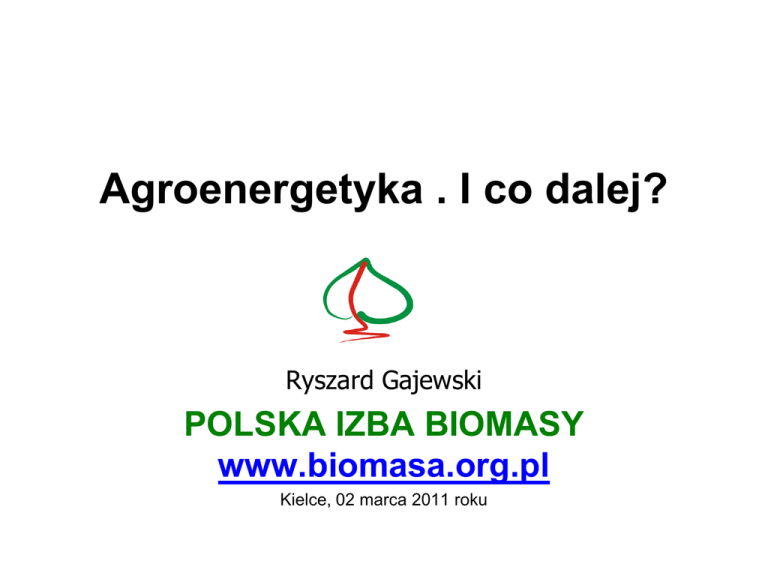 Agroenergetyka . I co dalej? Ryszard Gajewski POLSKA IZBA BIOMASY www.biomasa.org.pl Kielce, 02 marca 2011 roku Powierzchnia użytków rolnych w UE w przeliczeniu na jednego mieszkańca 2 Źródło: ecbrec ieo Jakie są dziś warunki inwestowania w Polsce? Ranking Banku Światowego dla 183 krajów (2010 r.) www.doingbusiness.org Ease of Doing Business Rank ▲ Starting a Business Dealing with Construction Permits Getting Credit Paying Taxes Singapore Hong Kong SAR, China New Zealand United Kingdom United States Denmark 1 2 3 4 5 6 4 6 1 17 9 27 2 1 5 16 27 10 6 2 2 2 6 15 4 3 26 16 62 13 18 59 79 41 19 15 46 6 46 46 88 44 59 70 55 160 106 84 70 46 89 15 128 103 58 151 8 ... Germany Lithuania Latvia Belgium France 22 23 24 25 26 88 87 53 31 21 ... Azerbaijan Tunisia Romania Oman 54 55 56 57 Czech Republic Belarus Namibia 63 68 69 7 124 44 36 89 15 183 99 Poland 70 113 164 15 121 Tonga Panama Mongolia 71 72 73 30 23 86 34 66 104 116 32 72 31 175 66 15 48 44 76 ... 3 zużycie energii finalnej brutto Jaki mamy cel dla energii ze źródeł odnawialnych 15% w 2020 udział energii ze źródeł odnawialnych zielone ciepło zielona energia elektr. zielone paliwa 15% x 100% = 15% 4 Produkcja energii elektrycznej w 2009 roku w podziale na technologię wytwarzania stan na 16.04.2010 r. Elektrownie na biogaz Elektrownie na biomasę Elektrownie wodne Współspalanie 3,6% Elektrownie wiatrowe 6,3% 12,9% 47,0% 30,3% 5 Potencjał rynkowy biomasy 7000 6000 tys. ton 5000 4000 3000 2000 1000 0 2010 2011 2012 2013 2014 2015 2016 2017 2018 2019 2020 lata słoma Źródło:Opracowanie własne PIB TUZ las 6 Zestawienie powierzchni upraw wieloletnich roślin energetycznych w poszczególnych województwach w 2009 roku [ha] Rodzaje wieloletnich roślin energetycznych Województwo Ślazowiec Trawy wieloletnie Mozga Trzcinowata Wierzba Miskant Dolnośląskie 600 11,0 KujawskoPomorskie 198 Lubelskie 305 Lubuskie 409 Łódzkie 211 1,6 62 9,5 Mazowieckie 762 1 200,0 30,1 Opolskie 226 7,5 1,0 Podkarpackie 651 42,1 12,7 45,2 Podlaskie 156 3,8 4,0 1,7 165,5 Pomorskie 394 17,4 0,2 487,7 3,6 902,9 Śląskie 259 2,8 39,2 17,1 0,5 28,5 Małopolskie Świętokrzyskie Brzoza 0,3 1,3 10,7 281,6 3,4 14,7 Olszyna 0,4 5,0 338,8 1,0 99 571 382,1 Wielkopolskie 765 31,7 Zachodniopomorskie 489 116,2 2,6 985,4 6 157 1 832,6 121,5 1 364,0 26,7 21,9 72,8 0,2 0,3 1 992,6 2,0 1,6 285,8 751,0 0,7 318,8 0,2 8,3 5,6 10,5 13,0 4,5 83,8 1,2 647,7 16,7 52,6 410,9 215,9 1,3 19,1 611,7 481,4 3,3 28,6 Razem 0,5 0,9 WarmińskoMazurskie Polska Topola 0,2 128,4 993,7 2,9 849,5 1 678,2 6,0 10 198,1 7 Źródło: Opracowanie własne PIB na podstawie ARiMR Produkcja biogazu w UE w 2008 i 2009 roku [ktoe] Źródło:EurObserw’ER 2010 8 Produkcja biogazu w krajach UE w przeliczeniu na 1000 mieszkańców [toe] Źródło:EurObserw’ER 2010 Biogaz jako paliwo • 8,3 Mtoe energii pierotnej wyprodukowano z biogazu w krajach UE w 2009 roku • 25,2 TWh energii elektrycznej wyprodukowano z biogazu w krajach UE w 2009 roku • 56,4 TWh energii elektrycznej planuje się wyprodukować z biogazu w krajach UE w 2020 roku 1 Źródło:EurObserw’ER 2010 10 Czechy, Niemcy… i Polska Czechy Niemcy Polska Liczba mieszkańców w mln 10,3 82,1 38,1 Powierzchnia w km2 79000 357000 312000 Grunty orne w mln ha 3,1 11,9 11,8 Grunty rolne na 1 mieszkańca 0,35 O,21 0,42 Liczba biogazownii rolniczych 235 6000 11 Moc zainstalowana w MW 120,12 2300 9 11 Jak wygląda rynek biogazownii rolniczych w Polsce • obecnie w Polsce działa 11 biogazowni o łącznej mocy 9 MW. • Jednocześnie w trakcie realizacji jest ok. 50 projektów, a około 190 w planach. 12 Niemiecki rynek biogazownii rolniczych • Do końca 2010 roku działało około 6000 biogazowni rolniczych, o łącznej mocy zainstalowanej ok. 2300 MW energii elektrycznej • W 2010 r. niemiecki sektor biogazu zatrudniał ponad 11.000 ludzi. • W kwietniu 2010 roku 32 biogazownie podłączony były do sieci gazowej • W 2020 roku biogaz wprowadzony do sieci będzie stanowił 6% konsumowanego gazu 13 Czeski rynek biogazownii rolniczych • • • • Aktualny stan bigazownii 235 Aktualna moc zainstalowana 120,12 MW Aktualna produkcji energii el. 484,2 GWh Udział biogazownii w OZE 9% 14 Dlaczego biogazownie są opłacalne w Niemczech • 20 letni gwarantowany okres gratyfikacji biogazownii rolniczych od zakończenia inwestycji • Przyłączanie w pierwszej kolejności do krajowych sieci energetycznych i sieci przesyłowych gazu oraz energii elektrycznej wytwarzanej z OZE • Zobowiązanie zarządców sieci przesyłowych do odbioru i dokonywania płatności w pierwszej kolejności dla wytwórców energii elektrycznej z OZE 15 Dlaczego biogazownie są opłacalne w Czechach • 15 letni gwarantowany okres gratyfikacji biogazownii rolniczych jeden z najwyższych w EU • Kredyty preferencyjne na biogazownie rolnicze • 30% refundacja kosztów budowy biogazownii rolniczych w ramach PROW w latach20072013 • Ulgi w podatkach lokalnych 16 Dlaczego rozwój biogazowni w Polsce jest tak spowolniony? Niestabilny system wsparcia • brak gwarancji ceny i prawa żądania zakupu dla energii elektrycznej z biogazu rolniczego (wszystkie inne OZE mają, bo mają koncesję URE, rolnicze mogą mieć jedynie – co miało być ułatwieniem - wpis ARR) • brak gwarancji ceny dla biogazu wtłaczanego do sieci oraz brak obowiązku zakupu, jest tylko gwarancja odbioru przez dystrybutora sieci • krótki i niestabilny system wsparcia (zielone, brązowe, żółte, fioletowe) Procedury realizacji inwestycji w oparciu o biogazownię • Biogaz do sieci gazowej – wtłaczany może być tylko biogaz rolniczy. To nie jest zgodne z dyrektywą 2009/28/WE • Skomplikowane procedury, praktycznie jednakowe bez względu na wielkość jednostki 17 Polityka rolna w zakresie wieloletnich roślin energetycznych • Zlikwidowano dopłaty bezpośrednie • Zlikwidowano dopłaty do zakładania plantacji • Nie powstały mechanizmy współpracy energetyka – ro