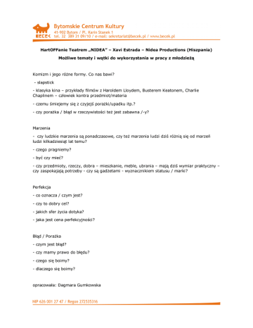 HartOFFanie Teatrem „NIDEA” – Xavi Estrada – Nidea Productions (Hiszpania) Możliwe tematy i wątki do wykorzystania w pracy z młodzieżą Komizm i jego różne formy. Co nas bawi? - slapstick - klasyka kina – przykłady filmów z Haroldem Lloydem, Busterem Keatonem, Charlie Chaplinem – człowiek kontra przedmiot/materia - czemu śmiejemy się z czyjejś porażki/upadku itp.? - czy porażka / błąd w rzeczywistości też jest zabawna /-y? Marzenia - czy ludzkie marzenia są ponadczasowe, czy też marzenia ludzi dziś różnią się od marzeń ludzi kilkadziesiąt lat temu? - czego pragniemy? - być czy mieć? - czy przedmioty, rzeczy, dobra – mieszkanie, meble, ubrania – mają dziś wymiar praktyczny – czy zaspokajają potrzeby - czy są gadżetami - wyznacznikiem statusu / marki? Perfekcja - co oznacza / czym jest? - czy to dobry cel? - jakich sfer życia dotyka? - jaka jest cena perfekcyjności? Błąd / Porażka - czym jest błąd? - czy mamy prawo do błędu? - czego się boimy? - dlaczego się boimy? opracowała: Dagmara Gumkowska