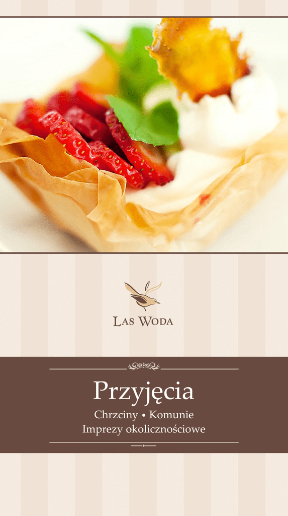 Przyjęcia Chrzciny • Komunie Imprezy okolicznościowe MENU – PROPOZYCJA I Dania główne Rosół z kury/domowy makaron/warzywa ogrodowe Roladki wieprzowe z serem bałkańskim /grillowane warzywa/ziemniaka z patelni/sos ziołowy Deser lodowy/świeże owoce/bita śmietana/sos czekoladowy Schab pieczony/rukola/sos kaparowy Domowy pasztet/czerwona porzeczka/chrzan Galantyna drobiowa/bakalie/sos żurawinowy Rolada z pstrąga/mus z buraczka/piklowana dynia Opiekany sandacz/włoszczyzna/smażone pomidory Tuszki śledziowe/marynowane maślaki/wędzona śliwka Pierś drobiowa/sałata rzymska/ziołowe grzanki Grillowane warzywa/rukola/krem balsamiczny Ser mozzarella/pomidory/domowe pesto Przekąski zimne Sałatki Dodatki Wybór domowych pikli i marynat Wybór sosów do mięs Wybór świeżego pieczywa Masełka smakowe Wybór ciast z naszej cukierni Krojone owoce cytrusowe Patera owoców sezonowych Soki owocowe Kawa/ herbata Woda mineralna Bufet słodki Napoje Cena 100 zł brutto za osobę Park Rekreacyjno-Biznesowy Las Woda ul. Spokojna 1, 08-470 Wilga • tel. 25 685 30 10, 723 99 74 70/71 [email protected] • www.laswoda.pl MENU – PROPOZYCJA II Dania główne Krem z groszku/mięta/bazylia/słodka śmietana Grillowana pierś drobiowa/puree z marchwi/cukinia/sos balsamiczny Sorbet truskawkowy/mascarpone/domowa beza/owoce sezonowe Szaszłyk wieprzowy/ziemniak z wody/marynowana pekińska/sos paprykowy Schab pieczony/rukola/sos kaparowy Rolada z kaczki/marynowana dynia/żurawina Domowy pasztet/czerwona porzeczka/chrzan Szynka sarmacka/ser wiejski/zioła ogrodowe Rolada z sandacza/marnowane grzyby/ziołowe remoulade Tuszki śledziowe/salsa pomidorowa/czerwona cebula Galareta z pieczonym łososiem/oliwki/kapary/śmietana chrzanowa Sałata rukola/ser feta/szynka włoska/pomidorek czereśniowy Sałatka z makaronu/świeżych warzyw/tuńczyka/jajka Liście sałat sezonowych/wędzony łosoś/oliwki/sos miodowo-musztardowy Grillowane warzywa/rukola/krem balsamiczny Danie główne II Przekąski zimne Sałatki Dodatki Wybór domowych pikli i marynat Wybór sosów do mięs Wybór świeżego pieczywa Masełka smakowe Wybór ciast z naszej cukierni Galaretka owocowa Krojone owoce cytrusowe Patera owoców sezonowych Soki owocowe Kawa/herbata Woda mineralna Bufet słodki Napoje Cena 120 zł brutto za osobę Park Rekreacyjno-Biznesowy Las Woda ul. Spokojna 1, 08-470 Wilga • tel. 25 685 30 10, 723 99 74 70/71 [email protected] • www.laswoda.pl MENU - PROPOZYCJA III Dania główne Krem z białych warzyw/smażone borowiki/oliwa truflowa Pieczona kaczka/puree z dyni/pieczony buraczek/leniwe/owoce leśne Ciastko czekoladowe/krem waniliowy/karmelizowany banan/sos toffi Danie główne II Roladka wieprzowa/suszony pomidor/szynka włoska/świeże zioła/pomidorowe risotto Przekąski zimne Schab pieczony/rukola/sos kaparowy Szynka dojrzewająca/ melon/ gorgonzola Pasztet cielęcy/ smażona brusznica/piklowana dynia Nóżki po warszawsku/ marynowane grzyby/śmietana chrzanowa Sandacz marynowany/ zalewa imbirowa/ papryka/ kolendra Kalmary/ pomarańcza/ cykoria/ prażony sezam Marynowany łosoś/ świeży koper/sos miodowo musztardowy Liście sałat sezonowych/ wędzony kurczak/ananas/pestki słonecznika Grillowane warzywa/ ziołowe gnocchi/ szpinak/ser bursztyn Pieczony buraczek/ pomarańcza/ roszponka/ winegret kolendrowy Ser mozzarella/pomidory/domowe pesto Sałatki Dodatki Wybór domowych pikli i marynat Wybór sosów do mięs Wybór świeżego pieczywa Masełka smakowe Wybór ciast z naszej cukierni Panna cotta Krojone owoce cytrusowe Patera owoców sezonowych Soki owocowe Kawa/ herbata Woda mineralna Bufet słodki Napoje Cena 150 zł brutto za osobę Park Rekreacyjno-Biznesowy Las Woda ul. Spokojna 1, 08-470 Wilga • tel. 25 685 30 10, 723 99 74 70/71 [email protected] • www.laswoda.pl