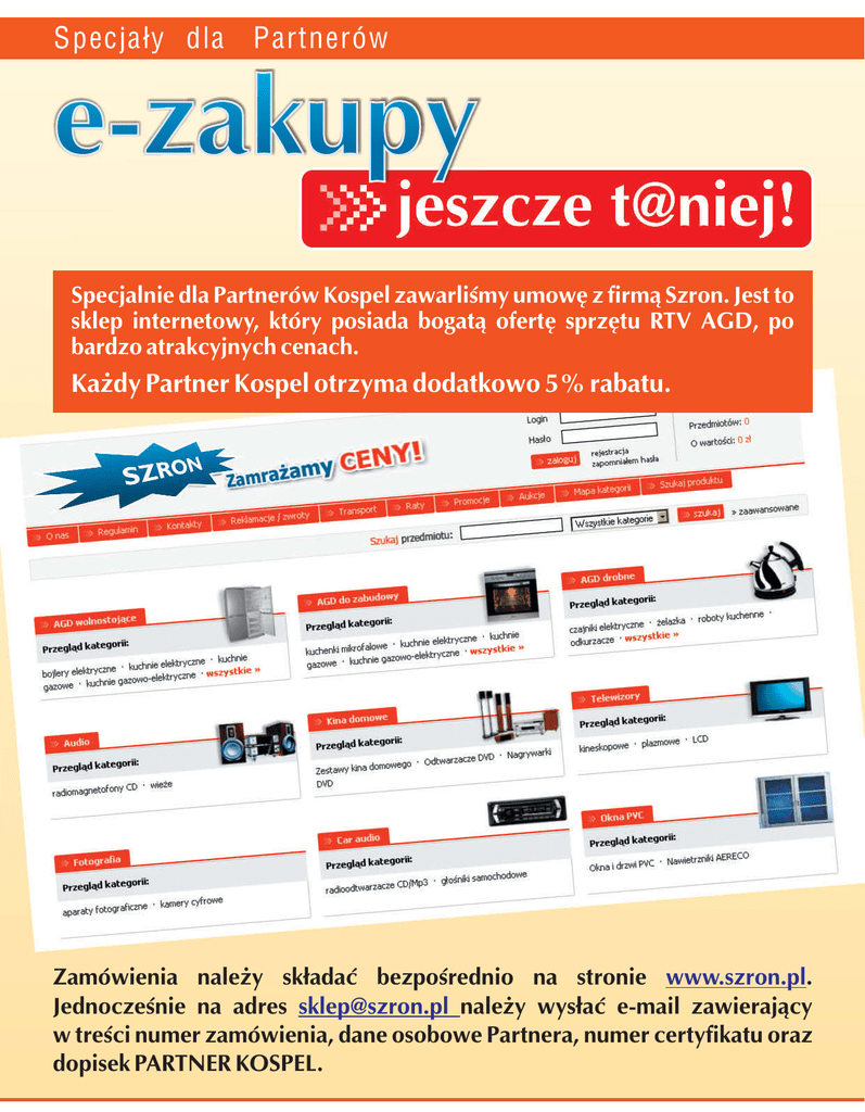 Specjały dla Partnerów e-zakupy Specjalnie dla Partnerów Kospel zawarliśmy umowę z firmą Szron. Jest to sklep internetowy, który posiada bogatą ofertę sprzętu RTV AGD, po bardzo atrakcyjnych cenach. Każdy Partner Kospel otrzyma dodatkowo 5% rabatu. Zamówienia należy składać bezpośrednio na stronie www.szron.pl. Jednocześnie na adres [email protected] należy wysłać e-mail zawierający w treści numer zamówienia, dane osobowe Partnera, numer certyfikatu oraz dopisek PARTNER KOSPEL. Specjały dla ... a może Bałtyk ma swój urok nie tylko latem. Jesienne i zimowe sztormy to okres, gdy można głęboko wdychać jod i oglądać niepowtarzalne widoki wzburzonego morza. Proponujemy połączyć przyjemność nadmorskich spacerów z możliwością zwiedzenia fabryki i zapoznania się z technologią produkcji podgrzewaczy i kotłów. Partnerów nad morze? Specjalnie dla Parterów KOSPEL, współpracujące z nami hotele oferują miły wypoczynek i bardzo atrakcyjne ceny. „Bursztyn” SPA, basen, morskie powietrze Ośrodek Wypoczynkowy „Bursztyn” znajduje się w cichym i ustronnym miejscu około 600 m od morza. W sąsiedztwie „Bursztynu” znajduje się pas przybrzeżnych wydm, za którymi rozciąga się szeroka, piaszczysta plaża. Ośrodek dysponuje własnym krytym basenem, sauną i jacuzzi. Cena za 1 osobę już od 45 zł. Każdy Profesjonalny Partner Kospel otrzyma specjalny 10% rabat. Pełna oferta dostępna jest na stronie www.bursztyn.dabki.pl Hotel GROMADA Sp. z o.o. 75-035 Koszalin ul. Zwycięstwa 20-24 Tel.: + 48 (94) 342-79-11 Fax: + 48 (94) 342-79-11 [email protected] www.gromada.koszalin.pl Promocyjne ceny w hotelu ARKA Hotel Gromada znajduje się w centrum Koszalina, blisko stacji kolejowej i dworca PKS. Odległość do morza i turystycznej miejscowości Mielno wynosi tylko 10 km. Hotel oferuje pokoje 1 i 2 osobowe oraz apartamenty. W części hotelu *** oraz ** pokoje wyposażone są w łazienkę, telewizor, telefon. Specjalne ceny dla Partnerów: - pokój 1-osobowy w części *** -140,00 zł za dobę (ze śniadaniem), - pokój 2-osobowy w części *** - 220,00 zł za dobę (ze śniadaniem). Rezerwacji należy dokonywać bezpośrednio w recepcji, na hasło KOSPEL. Specjały dla Partnerów Komórki dla Partnerów Kospel Profesjonalnym Partnerom, którzy posiadają Certyfikaty, proponujemy korporacyjne warunki na telefony komórkowe, specjalnie wynegocjowane w sieci Orange. Oferujemy: prawdopodobnie najtańsze na rynku rozmowy, ponad 80 modeli telefonów, już od 1,22zł, bezpłatne połączenia między Komórkami dla Partnerów, tani bezprzewodowy internet. Szczegóły oferty oraz pełna lista modeli telefonów dostępne są w Dziale Marketingu, u Moniki Szmuniewskiej, tel. (094) 317 05 12, e-mail: [email protected]