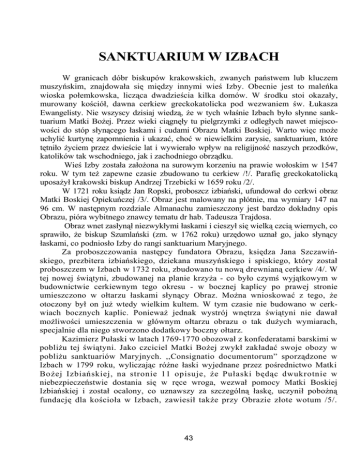 SANKTUARIUM W IZBACH W granicach dóbr biskupów krakowskich, zwanych państwem lub kluczem muszyńskim, znajdowała się między innymi wieś Izby. Obecnie jest to maleńka wioska połemkowska, licząca dwadzieścia kilka domów. W środku stoi okazały, murowany kościół, dawna cerkiew greckokatolicka pod wezwaniem św. Łukasza Ewangelisty. Nie wszyscy dzisiaj wiedzą, że w tych właśnie Izbach było słynne sanktuarium Matki Bożej. Przez wieki ciągnęły tu pielgrzymki z odległych nawet miejscowości do stóp słynącego łaskami i cudami Obrazu Matki Boskiej. Warto więc może uchylić kurtynę zapomnienia i ukazać, choć w niewielkim zarysie, sanktuarium, które tętniło życiem przez dwieście lat i wywierało wpływ na religijność naszych przodków, katolików tak wschodniego, jak i zachodniego obrządku. Wieś Izby została założona na surowym korzeniu na prawie wołoskim w 1547 roku. W tym też zapewne czasie zbudowano tu cerkiew /!/. Parafię greckokatolicką uposażył krakowski biskup Andrzej Trzebicki w 1659 roku /2/. W 1721 roku ksiądz Jan Ropski, proboszcz izbiański, ufundował do cerkwi obraz Matki Boskiej Opiekuńczej /3/. Obraz jest malowany na płótnie, ma wymiary 147 na 96 cm. W następnym rozdziale Almanachu zamieszczony jest bardzo dokładny opis Obrazu, pióra wybitnego znawcy tematu dr hab. Tadeusza Trajdosa. Obraz wnet zasłynął niezwykłymi łaskami i cieszył się wielką czcią wiernych, co sprawiło, że biskup Szumlański (zm. w 1762 roku) urzędowo uznał go, jako słynący łaskami, co podniosło Izby do rangi sanktuarium Maryjnego. Za proboszczowania następcy fundatora Obrazu, księdza Jana Szczawińskiego, prezbitera izbiańskiego, dziekana muszyńskiego i spiskiego, który został proboszczem w Izbach w 1732 roku, zbudowano tu nową drewnianą cerkiew /4/. W tej nowej świątyni, zbudowanej na planie krzyża - co było czymś wyjątkowym w budownictwie cerkiewnym tego okresu - w bocznej kaplicy po prawej stronie umieszczono w ołtarzu łaskami słynący Obraz. Można wnioskować z tego, że otoczony był on już wtedy wielkim kultem. W tym czasie nie budowano w cerkwiach bocznych kaplic. Ponieważ jednak wystrój wnętrza świątyni nie dawał możliwości umieszczenia w głównym ołtarzu obrazu o tak dużych wymiarach, specjalnie dla niego stworzono dodatkowy boczny ołtarz. Kazimierz Pułaski w latach 1769-1770 obozował z konfederatami barskimi w pobliżu tej świątyni. Jako czciciel Matki Bożej zwykł zakładać swoje obozy w pobliżu sanktuariów Maryjnych. ,,Consignatio documentorum” sporządzone w Izbach w 1799 roku, wyliczając różne łaski wyjednane przez pośrednictwo Matki Bożej Izbiańskiej, na stronie 11 opisuje, że Pułaski będąc dwukrotnie w niebezpieczeństwie dostania się w ręce wroga, wezwał pomocy Matki Boskiej Izbiańskiej i został ocalony, co uznawszy za szczególną łaskę, uczynił pobożną fundację dla kościoła w Izbach, zawiesił także przy Obrazie złote wotum /5/. 43 Na ścianie obok ołtarza Matki Bożej wymalowano wtedy Pułaskiego na tle obozu konfederatów, modlącego się do Matki Bożej Izbiańskiej /6/. W roku 1886 zbudowano w Izbach nową, okazałą cerkiew murowaną z kamienia, usytuowaną podobnie jak poprzednia na planie krzyża z dwoma bocznymi kaplicami. W kaplicy po prawej stronie umieszczono w ołtarzu łaskami słynący Obraz. Nowa, obszerniejsza cerkiew potrzebna była ze względu na duży napływ pielgrzymów. Szły tu nawet pielgrzymki z Węgier i Słowacji, szli katolicy obydwu obrządków /?/. Profesor dr Rodion Mochnacki z Krakowa (syn ks. Włodzimierza Mochnackiego, greckokatolickiego administratora w Czyrnej do 1913 roku), zmarły w 1981 roku, jako sędziwy starzec opowiadał mi, że pamięta wielki napływ ludzi do Izb i kult Matki Bożej Izbiańskiej. W 1923 roku mieszkańcy Izb przeszli w większości na prawosławie i zbudowali sobie osobną świątynię, rozebraną po ostatniej wojnie. Tymczasem starą cerkiew zamknięto i kult zaczął wygasać. Klucze do cerkwi miał u siebie greckokatolicki proboszcz w Banicy. On też z małymi grupkami swoich parafian chodził do Izb, by odprawiać tam Mszę świętą i modlić się przed Obrazem. Nieraz zdarzało się, że wierni zostali obrzuceni kamieniami przez prawosławnych Izbian (oczywiście poza cerkwią). W roku 1947 wysiedlono resztę Łemków, opuszczona cerkiew niszczała. Rozkradzio-no wiele elementów z jej bogatego wyposażenia. Łaskami słynący Obraz szczęśliwie ocalał, nie naruszony w swym ołtarzu. Zaczęli sprowadzać się nowi osadnicy, obecni mieszkańcy Izb. Przez krótki okres czasu należeli do rzymskokatolickiej parafii w Bereście, później (1948) utworzono takąż parafię w Czyrnej i tam Izby przyłączono. Ksiądz Stanisław Panek, pierwszy rzymsko-katolicki proboszcz w Czyrnej, dojeżdżał regularnie do Izb - izbiańska świątynia ożyła. Od tej pory stale w Izbach odprawiane są Msze święte. Dnia 24 marca 1955 roku bezprawnie zabrano łaskami słynący Obraz i umieszczono go w bocznym ołtarzu kościoła w Bereście (dawna cerkiew unicka), a do Izb zrobiono kopię. Namalował ją ksiądz kanonik Adam Stachoń. Kopia jest piękna, wykonana dokładnie i starannie, ale jest to tylko kopia. W Bereście zaczęto czcić izbiańska Ikonę, ale wnet kult ustał. Obraz pełni tam funkcję zwykłego ołtarzowego wizerunku. Usilne starania o powrót świętej Ikony do Izb, jak dotychczas nie odniosły skutku. Studenckie Koło Przewodników Beskidzkich w Warszawie, chcąc przypomnieć i uczcić Kazimierza Pułaskiego, konfederatów barskich i ich nabożeństwo do Matki Bożej Izbiańskiej, ufundowało pamiątkową tablicę, która została wmurowana w ścianę kościoła obok ołtarza, gdzie był umieszczony cudowny Obraz. Dnia 3 maja 1985 roku ksiądz biskup Piotr Bednarczyk tę tablicę uroczyście odsłonił i poświęcił. Dokonał tego w obecności wielu kapłanów, około dwustu przew