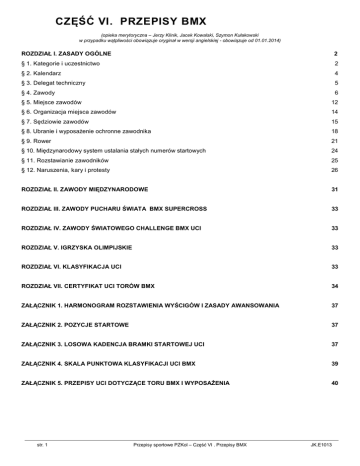 CZĘŚĆ VI. PRZEPISY BMX (opieka merytoryczna – Jerzy Klinik, Jacek Kowalski, Szymon Kułakowski w przypadku wątpliwości obowiązuje oryginał w wersji angielskiej - obowiązuje od 01.01.2014) ROZDZIAŁ I. ZASADY OGÓLNE 2 § 1. Kategorie i uczestnictwo 2 § 2. Kalendarz 4 § 3. Delegat techniczny 5 § 4. Zawody 6 § 5. Miejsce zawodów 12 § 6. Organizacja miejsca zawodów 14 § 7. Sędziowie zawodów 15 § 8. Ubranie i wyposażenie ochronne zawodnika 18 § 9. Rower 21 § 10. Międzynarodowy system ustalania stałych numerów startowych 24 § 11. Rozstawianie zawodników 25 § 12. Naruszenia, kary i protesty 26 ROZDZIAŁ II. ZAWODY MIĘDZYNARODOWE 31 ROZDZIAŁ III. ZAWODY PUCHARU ŚWIATA BMX SUPERCROSS 33 ROZDZIAŁ IV. ZAWODY ŚWIATOWEGO CHALLENGE BMX UCI 33 ROZDZIAŁ V. IGRZYSKA OLIMPIJSKIE 33 ROZDZIAŁ VI. KLASYFIKACJA UCI 33 ROZDZIAŁ VII. CERTYFIKAT UCI TORÓW BMX 34 ZAŁĄCZNIK 1. HARMONOGRAM ROZSTAWIENIA WYŚCIGÓW I ZASADY AWANSOWANIA 37 ZAŁĄCZNIK 2. POZYCJE STARTOWE 37 ZAŁĄCZNIK 3. LOSOWA KADENCJA BRAMKI STARTOWEJ UCI 37 ZAŁĄCZNIK 4. SKALA PUNKTOWA KLASYFIKACJI UCI BMX 39 ZAŁĄCZNIK 5. PRZEPISY UCI DOTYCZĄCE TORU BMX I WYPOSAŻENIA 40 str. 1 Przepisy sportowe PZKol – Część VI . Przepisy BMX JK.E1013 Rozdział I. ZASADY OGÓLNE § 1. Kategorie i uczestnictwo Wiek uczestników 6.1.001 Kategorie wiekowe zawodników, którzy biorą udział w zawodach umieszczonych w kalendarzu międzynarodowym i PZKol określane są przez wiek zawodnika, który jest wyznaczony przez różnicę pomiędzy rokiem urodzenia a rokiem obecnym. W zawodach BMX UCI może wziąć udział zawodnik, który ma co najmniej 5 lat. Minimalny wiek 5 lat odnosi się do rzeczywistego wieku kalendarzowego w dniu rozpoczęcia zawodów. Kategorie 6.1.002 Zawody BMX są rozgrywane na 3 poziomach rywalizacji: poziom mistrzowski, obejmujący elitę i juniorów, poziom challenge oraz poziom mastersów. Poszczególne poziomy opisane są w artykule 6.1.003, 6.1.004 i 6.1.005 . Kategorie poziomu mistrzowskiego 6.1.003 Kategorie zawodów BMX określone przez UCI w dwóch specjalnościach są następujące: ROWERY STANDARDOWE 20 CALI Wyścigi BMX racing: Elita mężczyźni - 19 lat i starsi; Elita kobiety - 19 lat i starsze; Juniorzy mężczyźni - 17 i 18 lat; Juniorzy kobiety - 17 i 18 lat; Indywidualna jazda na czas BMX Elita mężczyźni - 19 lat i starsi; Elita kobiety - 19 lat i starsze; Juniorzy mężczyźni - 17 i 18 lat; Juniorzy kobiety - 17 i 18 lat; (8 kategorii) Kategorie poziomu challenge 6.1.004 Kategorie zawodów BMX określone przez UCI są następujące: a) rowery standardowe 20 cali str. 2 Chłopcy - 5 i 6, 7, 8, 9, 10, 11, 12, 13, 14, 15, 16 lat (11 kategorii) Dziewczęta - 5-7, 8, 9, 10, 11, 12, 13, 14, 15, 16 lat (10 kategorii) Mężczyźni - 17-24, 25-29, 30 i więcej lat (3 kategorie) Kobiety - 17 i więcej lat (1 kategoria) Przepisy sportowe PZKol – Część VI . Przepisy BMX JK.E1013 b) rowery cruiser 24 cale Chłopcy/mężczyźni – 12 i mniej, 13 i 14, 15 i 16, 17-24, 25-29, 30-34, 35-39, 40-44, 45 i więcej lat (9 kategorii) Dziewczęta/kobiety – 16 i mniej, 17-29, 30 i więcej lat (3 kategorie). Razem 37 kategorii. Kategoria masters 6.1.005 Mężczyźni 30 i więcej lat (1 kategoria). Tylko rowery 20”. Zawodnicy kategorii masters mogą również startować w kategorii challenge cruissers 24 cale. 6.1.006 Zawodnik, który ma 17 lub więcej lat może, na początku sezonu, zdecydować czy startować w kategorii poziomu mistrzowskiego, challenge czy masters (tylko jeżeli ukończył 30 lat) wybierając odpowiednią grupę ze względu na wiek i płeć. W jednym sezonie, zawodnik nie może startować na 2 różnych poziomach: mistrzowskim i challenge. W licencji musi być jasno określone w jakiej kategorii zawodnik startuje w danym roku. Zawodnik, który uzyskał chociażby 1 punkt UCI nie może startować w zawodach na poziomie masters i challenge. 6.1.006 bis Od 2013 roku sezon kalendarzowy zaczyna się 1 stycznia i trwa do 31 grudnia . Zasady tworzenia kategorii 6.1.007 Pięciu zawodników stanowi kategorię. Jeśli mniej niż pięciu zawodników zgłosi się do kategorii to zostaną oni połączeni z kategorią starszą. Jednakże kategorie cruiser z maksymalnym wiekiem powyżej 34 lat zostaną połączone z kategorią młodszą. W przypadku gdy jakakolwiek nie obsadzona kategoria nie może być stworzona zgodnie z powyższymi zasadami, nie może ona powstać. Jeśli do kategorii zostanie zapisana odpowiednia liczba zawodników, którzy potwierdzą swój udział w wyścigu, a na starcie stawi się mniejsza liczba zawodników, to i tak kategoria zostanie dopuszczona. Jeśli 5 lub większa liczba zawodników zapisze się do kategorii i ich udział zostanie potwierdzony, lecz kontuzja lub choroby spowodują brak wymaganej liczby startujących do faktycznego wzięcia udziału w zawodach, to kategoria nie zostanie połączona. Klasy mistrzowska i challenge mogą być łączone w zawodach mistrzowskich jeśli podczas rejestracji zawodów w UCI będą spełnione następujące warunki: str. 3 Przepisy sportowe PZKol – Część VI . Przepisy BMX JK.E1013 - organizator poinformuje w regulaminie i w komunikacie federację narodową oraz zawodników o łączeniu poziomów, - wyniki będą liczone oddzielnie dla każdego poziomu, - zawodnicy otrzymają punkty odpowiadające ich poziomowi - zawodnicy otrzymają nagrody pieniężne odpowiadające miejscu ich poziomowi. Przykład zawodów klasy 1 Miejsce Kategoria Ilość punktów w klasyfikacji Ilość punktów w klasyfikacji w zawodach zawodniczki UCI Juniorek UCI Elity Kobiet 1 Juniorka 30 pkt (1-sze miejsce juniorek) 2 Elta 3 Juniorka 4 Elita 50 pkt (1-sze miejsce Elity) 20 pkt (2-gie miejsce juniorek) 45 pkt (2-gie miejsce Elity) W wyścigach zgłoszonych do kalendarza UCI, za wyjątkiem zasad kategorii łączonych, żaden zawodnik nie może brać udziału w rywalizacji poza swoją grupą wiekową albo w grupie płci przeciwnej. § 2. 