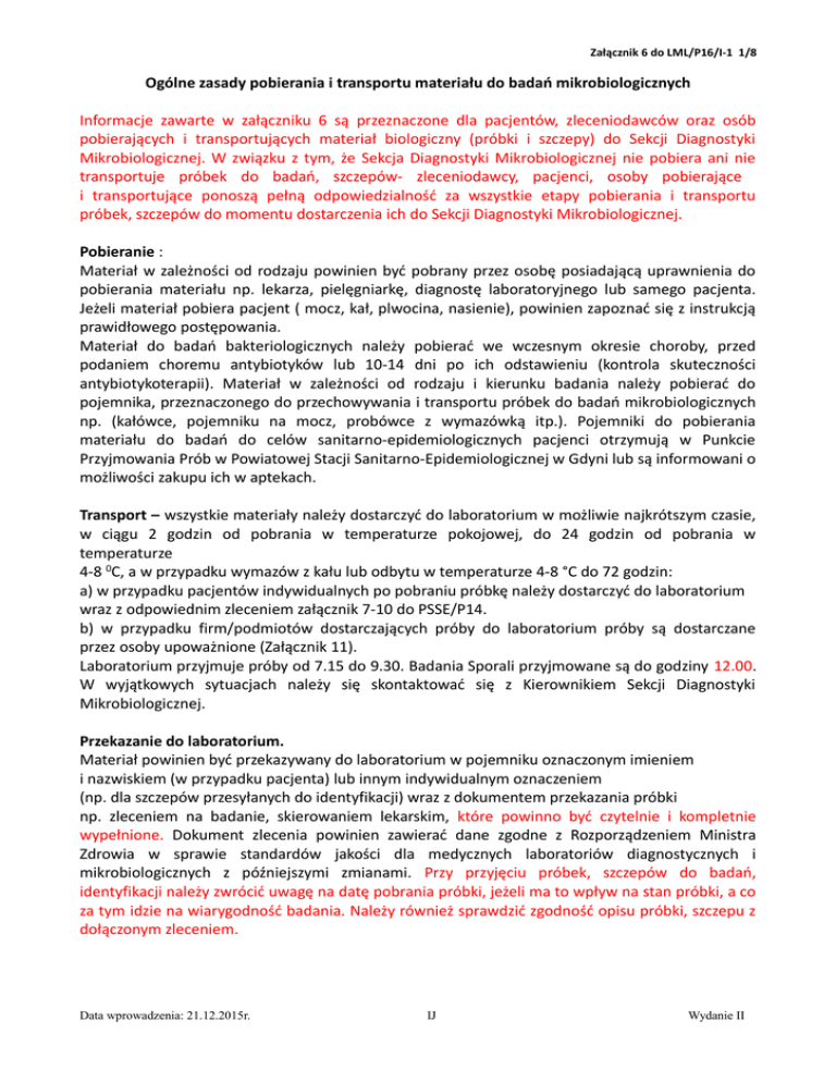 Załącznik 6 do LML/P16/I-1 1/8 Ogólne zasady pobierania i transportu materiału do badań mikrobiologicznych Informacje zawarte w załączniku 6 są przeznaczone dla pacjentów, zleceniodawców oraz osób pobierających i transportujących materiał biologiczny (próbki i szczepy) do Sekcji Diagnostyki Mikrobiologicznej. W związku z tym, że Sekcja Diagnostyki Mikrobiologicznej nie pobiera ani nie transportuje próbek do badań, szczepów- zleceniodawcy, pacjenci, osoby pobierające i transportujące ponoszą pełną odpowiedzialność za wszystkie etapy pobierania i transportu próbek, szczepów do momentu dostarczenia ich do Sekcji Diagnostyki Mikrobiologicznej. Pobieranie : Materiał w zależności od rodzaju powinien być pobrany przez osobę posiadającą uprawnienia do pobierania materiału np. lekarza, pielęgniarkę, diagnostę laboratoryjnego lub samego pacjenta. Jeżeli materiał pobiera pacjent ( mocz, kał, plwocina, nasienie), powinien zapoznać się z instrukcją prawidłowego postępowania. Materiał do badań bakteriologicznych należy pobierać we wczesnym okresie choroby, przed podaniem choremu antybiotyków lub 10-14 dni po ich odstawieniu (kontrola skuteczności antybiotykoterapii). Materiał w zależności od rodzaju i kierunku badania należy pobierać do pojemnika, przeznaczonego do przechowywania i transportu próbek do badań mikrobiologicznych np. (kałówce, pojemniku na mocz, probówce z wymazówką itp.). Pojemniki do pobierania materiału do badań do celów sanitarno-epidemiologicznych pacjenci otrzymują w Punkcie Przyjmowania Prób w Powiatowej Stacji Sanitarno-Epidemiologicznej w Gdyni lub są informowani o możliwości zakupu ich w aptekach. Transport – wszystkie materiały należy dostarczyć do laboratorium w możliwie najkrótszym czasie, w ciągu 2 godzin od pobrania w temperaturze pokojowej, do 24 godzin od pobrania w temperaturze 4-8 0C, a w przypadku wymazów z kału lub odbytu w temperaturze 4-8 °C do 72 godzin: a) w przypadku pacjentów indywidualnych po pobraniu próbkę należy dostarczyć do laboratorium wraz z odpowiednim zleceniem załącznik 7-10 do PSSE/P14. b) w przypadku firm/podmiotów dostarczających próby do laboratorium próby są dostarczane przez osoby upoważnione (Załącznik 11). Laboratorium przyjmuje próby od 7.15 do 9.30. Badania Sporali przyjmowane są do godziny 12.00. W wyjątkowych sytuacjach należy się skontaktować się z Kierownikiem Sekcji Diagnostyki Mikrobiologicznej. Przekazanie do laboratorium. Materiał powinien być przekazywany do laboratorium w pojemniku oznaczonym imieniem i nazwiskiem (w przypadku pacjenta) lub innym indywidualnym oznaczeniem (np. dla szczepów przesyłanych do identyfikacji) wraz z dokumentem przekazania próbki np. zleceniem na badanie, skierowaniem lekarskim, które powinno być czytelnie i kompletnie wypełnione. Dokument zlecenia powinien zawierać dane zgodne z Rozporządzeniem Ministra Zdrowia w sprawie standardów jakości dla medycznych laboratoriów diagnostycznych i mikrobiologicznych z późniejszymi zmianami. Przy przyjęciu próbek, szczepów do badań, identyfikacji należy zwrócić uwagę na datę pobrania próbki, jeżeli ma to wpływ na stan próbki, a co za tym idzie na wiarygodność badania. Należy również sprawdzić zgodność opisu próbki, szczepu z dołączonym zleceniem. Data wprowadzenia: 21.12.2015r. IJ Wydanie II Załącznik 6 do LML/P16/I-1 2/8 Osoba (rejestrator, analityk) przyjmująca próbki, szczepy do badań weryfikuje tożsamość pacjenta oraz ma prawo do odmowy przyjęcia próbki w przypadku: a) braku materiału do badania lub za dużej ilości materiału w pojemniku (pojemnik powinien być wypełniony w 1/4) b) brudnego pojemnika na kał lub pobrania do niewłaściwego pojemnika c) nieczytelnie lub niekompletnie wypełnionego zlecenia d) w przypadku nieprawidłowej techniki pobrania materiału i sposobu przechowywania próby e) w przypadku nieprawidłowych warunków transportu i czasu dostarczenia próbki W przypadku odstępstw od niniejszej instrukcji należy uzgadniać warunki indywidualne z Kierownikiem Sekcji Diagnostyki Mikrobiologicznej. 1. Pobieranie kału na badanie bakteriologiczne: Próbkę do badania bakteriologicznego pobiera Pacjent lub Opiekun po uprzednim zapoznaniu się z niniejszą instrukcją. · Od osób zdrowych badanych na nosicielstwo pałeczek Salmonella, Shigella (do celów sanitarno-epidemiologicznych): Osoba wykonująca badanie bakteriologiczne kału w kierunku schorzeń jelitowych powinna dostarczyć do laboratorium trzy próbki kału w ciągu 3 kolejnych dni roboczych (1 próbka-1 dzień). Laboratorium nie przyjmuje do badania trzech, a nawet dwóch próbek dostarczonych tego samego dnia. W przypadku, gdy nie udaje się uzyskać próbek kału do badania w kierunku Salmonella, Shigella dopuszcza się pobranie wymazu z odbytu. Transport kału, wymazu do dwóch godzin może przebiegać w temperaturze pokojowej, przedłużenie czasu transportu wymaga schłodzenia materiału. Próbka kału, wymazy powinny być dostarczone do badania przed upływem 24 godzin od pobrania. Wyjątkiem jest pobranie wymazu z kału wymazówką z podłożem transportowym, która do momentu dostarczenia próbki (maksymalnie w ciągu 72 godzin) do laboratorium musi być przechowywana w temperaturze 4-8 °C . · Od osób chorych: Kał należy pobrać w początkowym okresie choroby, możliwie najszybciej po zaistnieniu podejrzenia (po pojawieniu się biegunki, śluzu bądź krwi w kale), kiedy czynnik etiologiczny schorzenia występuje najobficiej. Próbę należy pobrać przed podaniem antybiotyków lub innych chemioterapeutyków ponieważ mają one istotny wpływ na wynik badania. Kał od chorych pobiera się trzykrotnie w trzech kolejnych dniach (o ile objawy biegunkowe utrzymują się) w celu zwiększenia wykrywalności czynnika etiologicznego i pewniejszego rozpoznania choroby. · Od ozdrowieńców i nosicieli pochorobowych oraz osoby 