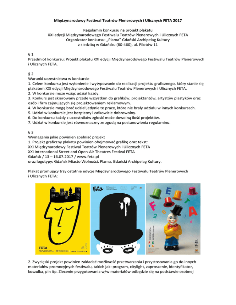 Międzynarodowy Festiwal Teatrów Plenerowych i Ulicznych FETA 2017 Regulamin konkursu na projekt plakatu XXI edycji Międzynarodowego Festiwalu Teatrów Plenerowych i Ulicznych FETA Organizator konkursu: „Plama” Gdański Archipelag Kultury z siedzibą w Gdańsku (80-460), ul. Pilotów 11 §1 Przedmiot konkursu: Projekt plakatu XXI edycji Międzynarodowego Festiwalu Teatrów Plenerowych i Ulicznych FETA. §2 Warunki uczestnictwa w konkursie 1. Celem konkursu jest wyłonienie i wytypowanie do realizacji projektu graficznego, który stanie się plakatem XXI edycji Międzynarodowego Festiwalu Teatrów Plenerowych i Ulicznych FETA. 2. W konkursie może wziąć udział każdy. 3. Konkurs jest skierowany przede wszystkim do grafików, projektantów, artystów plastyków oraz osób i firm zajmujących się projektowaniem reklamowym. 4. W konkursie mogą brać udział jedynie te prace, które nie brały udziału w innych konkursach. 5. Udział w konkursie jest bezpłatny i całkowicie dobrowolny. 6. Do konkursu każdy z uczestników zgłosić może dowolną ilość projektów. 7. Udział w konkursie jest równoznaczny ze zgodą na postanowienia regulaminu. §3 Wymagania jakie powinien spełniać projekt 1. Projekt graficzny plakatu powinien obejmować grafikę oraz tekst: XXI Międzynarodowy Festiwal Teatrów Plenerowych i Ulicznych FETA XXI International Street and Open-Air Theatres Festival FETA Gdańsk / 13 – 16.07.2017 / www.feta.pl oraz logotypy: Gdańsk Miasto Wolności, Plama, Gdański Archipelag Kultury. Plakat promujący trzy ostatnie edycje Międzynarodowego Festiwalu Teatrów Plenerowych i Ulicznych FETA: 2. Zwycięski projekt powinien zakładać możliwość przetwarzania i przystosowania go do innych materiałów promocyjnych festiwalu, takich jak: program, citylight, zaproszenie, identyfikator, koszulka, pin itp. Zlecenie przygotowania w/w materiałów odbędzie się na podstawie osobnej umowy. Organizator w pierwszej kolejności zaprosi do realizacji druków promocyjnych autora zwycięskiego projektu. 3. Zgłoszenie prac następuje poprzez przesłanie na adres Organizatora wydruku pracy w formacie B1 pion oraz płyty CD zawierającej wersję elektroniczną pracy w formacie JPG lub TIFF. 4. W konkursie będą rozpatrywane tylko i wyłącznie prace, które zostały wysłane na adres Organizatora do dnia 22 lutego 2017 r. Decyduje data stempla pocztowego. 5. Każde zgłoszenie powinno być opatrzone metryczką informacyjną umieszczoną na odwrocie pracy. Metryczka powinna zawierać "godło-kod" autora. Do nadesłanych prac należy dołączyć zaklejoną kopertę oznaczoną tym samym "godłem-kodem" autora zawierającą: imię, nazwisko, dokładny adres z kodem pocztowym, tel./fax, e-mail. 6. Zgłoszenie powinno zawierać podpisaną przez biorącego udział w konkursie zgodę na przetwarzanie danych osobowych o treści: „Wyrażam zgodę na przetwarzanie moich danych osobowych przez organizatora konkursu na projekt plakatu FETA 2017 w celach wynikających z regulaminu tego Konkursu, zgodnie z ustawą z dnia 29 sierpnia 1997 roku o ochronie danych osobowych (Dz.U. z 1997 r. nr 133, poz. 883, tekst jedn. Dz.U z 2015 r. poz. 2135 z późniejszymi zmianami).” 7. Konkurs zostanie rozstrzygnięty do 10 marca 2017 r. na zasadzie anonimowości. Zgłoszenia nie spełniające wymogów określonych w punktach 1-7 § 3 nie zostaną dopuszczone do konkursu 8. Po rozstrzygnięciu konkursu zostanie sporządzony protokół, który zostanie podpisany przez wszystkich członków Komisji Konkursowej. 9. Autorzy projektów wyrażają zgodę na ekspozycję projektów na wystawie pokonkursowej. Wybrane przez Organizatora projekty zostaną rozkodowane 5 dni po rozstrzygnięciu konkursu. §4 Kryteria oceny 1. Prace zostaną poddane ocenie Komisji Konkursowej, składającej się z pięciu członków powołanych przez Organizatora. 2. Członkowie Komisji Konkursowej: - Prof. Tomasz Bogusławski – Akademia Sztuk Pięknych w Gdańsku - Krzysztof Dydo – Galeria Plakatu Kraków - Joanna Górska – autorka plakatu FETY w 2001 r. Studio Homework - Anna Zbierska – Wydział Promocji, Informacji i Komunikacji Społecznej Urzędu Miejskiego w Gdańsku - Elwira Twardowska – Twórczyni Międzynarodowego Festiwalu Teatrów Plenerowych i Ulicznych FETA 3. Projekt plakatu oceniany będzie pod względem estetycznym oraz funkcjonalnym. Komisja Konkursowa dokona wyboru jednego najlepszego projektu. 4. Decyzja Komisji jest niepodważalna. 5. Decyzje Komisji są ostateczne i nie przysługuje od nich odwołanie. 6. Zastrzega się, że ocena Komisji może skutkować brakiem wyłonienia i wytypowania projektu do realizacji, co jest równoznaczne z rezygnacją z przyznania nagrody, o której mowa w § 6. §5 Warunki ogólne 1. Z chwilą przesłania prac do Organizatora Uczestnik Konkursu: 1) oświadcza, iż jest wyłącznym twórcą prac w rozumieniu ustawy o prawie autorskim i prawach pokrewnych, przysługują mu wszystkie prawa autorskie do tychże prac, które nie są obciążone żadnymi prawami ani roszczeniami osób trzecich; 2) oświadcza, iż prace nie naruszają jakichkolwiek praw ani dóbr osobistych osób trzecich, a także iż uzyskał zezwolenia wymagane prawem zgody osób przedstawionych na pracach na rozpowszechnianie ich wizerunku w ramach Konkursu oraz w zakresie poniższej licencji; 3) udziela Organizatorom nieodpłatnej, niewyłącznej, nieograniczonej czasowo ani terytorialnie, niepodlegającej wypowiedzeniu i podlegającej zbyciu licencji (z prawem do udzielania dalszej licencji) na korzystanie z prac w zakresie następujących pól eksploatacji: w zakresie utrwalania i zwielokrotniania – wytwarzanie dowolnymi technikami, w tym, techniką zapisu magnetycznego, światłoczułą, audiowizualną, cyfrową, optyczną, drukarską, komputerową niezależnie od formatu zapisu i nośnika, rozmiaru, formy, techniki, oprawy, rodzaju i sposobu dystrybucji lub upubliczniania; wprowadzanie do pamięci kom