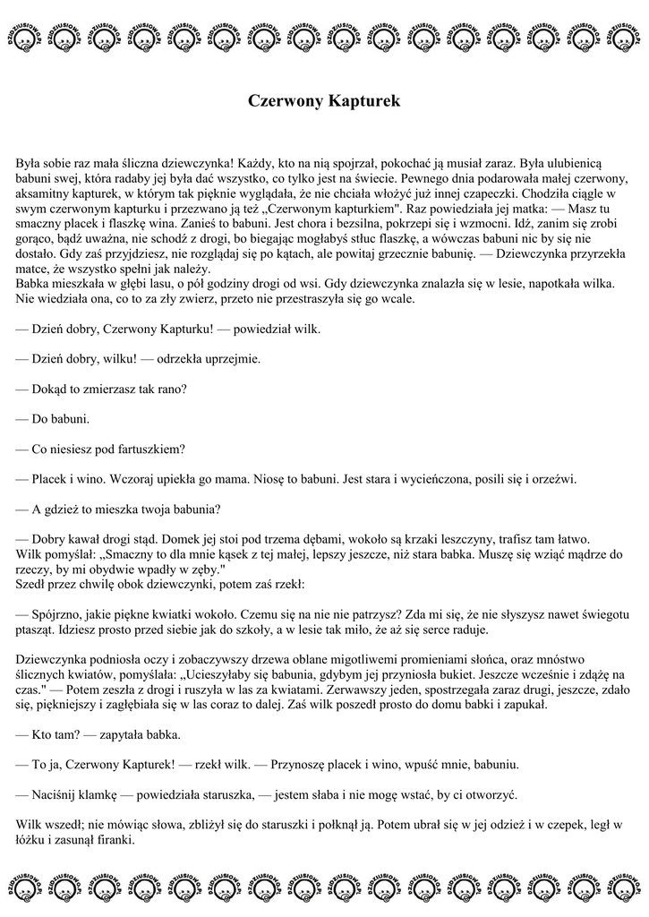 Czerwony Kapturek Była sobie raz mała śliczna dziewczynka! Każdy, kto na nią spojrzał, pokochać ją musiał zaraz. Była ulubienicą babuni swej, która radaby jej była dać wszystko, co tylko jest na świecie. Pewnego dnia podarowała małej czerwony, aksamitny kapturek, w którym tak pięknie wyglądała, że nie chciała włożyć już innej czapeczki. Chodziła ciągle w swym czerwonym kapturku i przezwano ją też „Czerwonym kapturkiem". Raz powiedziała jej matka: — Masz tu smaczny placek i flaszkę wina. Zanieś to babuni. Jest chora i bezsilna, pokrzepi się i wzmocni. Idź, zanim się zrobi gorąco, bądź uważna, nie schodź z drogi, bo biegając mogłabyś stłuc flaszkę, a wówczas babuni nic by się nie dostało. Gdy zaś przyjdziesz, nie rozglądaj się po kątach, ale powitaj grzecznie babunię. — Dziewczynka przyrzekła matce, że wszystko spełni jak należy. Babka mieszkała w głębi lasu, o pół godziny drogi od wsi. Gdy dziewczynka znalazła się w lesie, napotkała wilka. Nie wiedziała ona, co to za zły zwierz, przeto nie przestraszyła się go wcale. — Dzień dobry, Czerwony Kapturku! — powiedział wilk. — Dzień dobry, wilku! — odrzekła uprzejmie. — Dokąd to zmierzasz tak rano? — Do babuni. — Co niesiesz pod fartuszkiem? — Placek i wino. Wczoraj upiekła go mama. Niosę to babuni. Jest stara i wycieńczona, posili się i orzeźwi. — A gdzież to mieszka twoja babunia? — Dobry kawał drogi stąd. Domek jej stoi pod trzema dębami, wokoło są krzaki leszczyny, trafisz tam łatwo. Wilk pomyślał: „Smaczny to dla mnie kąsek z tej małej, lepszy jeszcze, niż stara babka. Muszę się wziąć mądrze do rzeczy, by mi obydwie wpadły w zęby." Szedł przez chwilę obok dziewczynki, potem zaś rzekł: — Spójrzno, jakie piękne kwiatki wokoło. Czemu się na nie nie patrzysz? Zda mi się, że nie słyszysz nawet świegotu ptasząt. Idziesz prosto przed siebie jak do szkoły, a w lesie tak miło, że aż się serce raduje. Dziewczynka podniosła oczy i zobaczywszy drzewa oblane migotliwemi promieniami słońca, oraz mnóstwo ślicznych kwiatów, pomyślała: „Ucieszyłaby się babunia, gdybym jej przyniosła bukiet. Jeszcze wcześnie i zdążę na czas." — Potem zeszła z drogi i ruszyła w las za kwiatami. Zerwawszy jeden, spostrzegała zaraz drugi, jeszcze, zdało się, piękniejszy i zagłębiała się w las coraz to dalej. Zaś wilk poszedł prosto do domu babki i zapukał. — Kto tam? — zapytała babka. — To ja, Czerwony Kapturek! — rzekł wilk. — Przynoszę placek i wino, wpuść mnie, babuniu. — Naciśnij klamkę — powiedziała staruszka, — jestem słaba i nie mogę wstać, by ci otworzyć. Wilk wszedł; nie mówiąc słowa, zbliżył się do staruszki i połknął ją. Potem ubrał się w jej odzież i w czepek, legł w łóżku i zasunął firanki. Tymczasem dziewczynka biegała za kwiatkami i dopiero, gdy zebrała ich tyle, że ledwo unieść mogła, przypomniała sobie o babce i poszła prędko do niej. Zdziwiło ją bardzo, że zastała drzwi otwarte, gdy zaś weszła, zrobiło jej się jakoś nieswojo. Pomyślała; „Jakże tu jakoś straszno dzisiaj, chociaż zawsze było mi bardzo wesoło u babuni". — Dzień dobry babuniu! — zawołała, ale nikt nie odpowiedział. Ilustracja autorstwa Carla Offterdingera z końca XIX w. Potem podeszła do łóżka, rozsunęła firanki i zobaczyła, że babunia leży, z czepkiem wsuniętym głęboko na twarz. Wyglądała bardzo jakoś dziwnie. — Babuniu! — powiedziała dziewczynka. — Jakież ty masz wielkie uszy!? — Bym cię lepiej słyszała, — odparł wilk, udając babunię. — A jakie ogromne oczy!? — Bym cię lepiej widziała. — A jakie ogromne ręce!? — Bym cię mogła lepiej schwytać. — A jaką ogromną paszczę!? — Bym cię łatwiej mogła połknąć. Rzekłszy to, wyskoczył wilk z łóżka i połknął biedną dziewczynkę. Nasyciwszy swą żarłoczność, wilk położył się z powrotem i zaczął głośno chrapać. Niezadługo zjawił się pod domem myśliwy i pomyślał; „Coś za głośno chrapie dziś staruszka. Muszę zobaczyć, czy nie chora". Wszedł i zbliżywszy się do łóżka, zobaczył wilka. — Tuś mi stary łotrze! — zawołał. — Dawno cię szukam! Powiedziawszy to, chciał już wziąć na cel wilka, ale wpadło mu do głowy, że może pożarł on staruszkę i że może da się ją jeszcze ocalić. Nie strzelił więc, ale rozpruł nożyczkami brzuch śpiącego zwierzęcia. Po kilku cięciach ujrzał Czerwony Kapturek, a gdy uczynił jeszcze kilka cięć, wyskoczyła dziewczynka i zawołała: — Ach, jakem się przelękła! Jakże ciemno było w brzuchu wilka! Także i babka wyszła żywa jeszcze, ale strasznie zdyszana. Dziewczynka przyniosła prędko kilka wielkich kamieni i wypełniono niemi brzuch wilka. Zwierz zerwał się, chciał uciekać, ale kamienie były tak ciężkie, że padł na ziemię i zdechł. Wszyscy troje radowali się bardzo. Myśliwy ściągnął z wilka skórę i poszedł do domu, babunia zaś zjadła placek przyniesiony, wypiła wino i wyzdrowiała. A dziewczynka pomyślała sobie: „Póki życia, nie zejdę już z drogi i nie pobiegnę w las wbrew zakazowi mamusi." Autor: Jacob Ludwig Karl Grimm i Wilhelm Karl Grimm