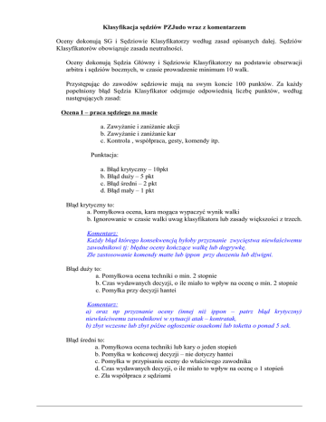 Klasyfikacja sędziów PZJudo wraz z komentarzem Oceny dokonują SG i Sędziowie Klasyfikatorzy według zasad opisanych dalej. Sędziów Klasyfikatorów obowiązuje zasada neutralności. Oceny dokonują Sędzia Główny i Sędziowie Klasyfikatorzy na podstawie obserwacji arbitra i sędziów bocznych, w czasie prowadzenie minimum 10 walk. Przystępując do zawodów sędziowie mają na swym koncie 100 punktów. Za każdy popełniony błąd Sędzia Klasyfikator odejmuje odpowiednią liczbę punktów, według następujących zasad: Ocena I – praca sędziego na macie a. Zawyżanie i zaniżanie akcji b. Zawyżanie i zaniżanie kar c. Kontrola , współpraca, gesty, komendy itp. Punktacja: a. Błąd krytyczny – 10pkt b. Błąd duży – 5 pkt c. Błąd średni – 2 pkt d. Błąd mały – 1 pkt Błąd krytyczny to: a. Pomyłkowa ocena, kara mogąca wypaczyć wynik walki b. Ignorowanie w czasie walki uwag klasyfikatora lub zasady większości z trzech. Komentarz: Każdy błąd którego konsekwencją byłoby przyznanie zwycięstwa niewłaściwemu zawodnikowi tj: błędne oceny kończące walkę lub dogrywkę. Złe zastosowanie komendy matte lub ippon przy duszeniu lub dźwigni. Błąd duży to: a. Pomyłkowa ocena techniki o min. 2 stopnie b. Czas wydawanych decyzji, o ile miało to wpływ na ocenę o min. 2 stopnie c. Pomyłka przy decyzji hantei Komentarz: a) oraz np przyznanie oceny (innej niż ippon – patrz błąd krytyczny) niewłaściwemu zawodnikowi w sytuacji atak – kontratak, b) zbyt wczesne lub zbyt późne ogłoszenie osaekomi lub toketta o ponad 5 sek. Błąd średni to: a. Pomyłkowa ocena techniki lub kary o jeden stopień b. Pomyłka w końcowej decyzji – nie dotyczy hantei c. Pomyłka w przypisaniu oceny do właściwego zawodnika d. Czas wydawanych decyzji, o ile miało to wpływ na ocenę o 1 stopień e. Zła współpraca z sędziami Komentarz: a) np. niesłuszne ukaranie zawodnika karą shido lub jej nie udzielenie. b) Błędne wskazanie zwycięzcy pomimo jasnej sytuacji punktowej na tablicy lub nie budzącego wątpliwości zwycięstwa przed czasem (np. skuteczne duszenie wykonał biały, a zwycięzcą został ogłoszony czerwony) c) Nie dotyczy sytuacji atak-kontratak (patrz błąd duży) np. „prostą” akcję na yuko wykonał czerwony a arbiter przez pomyłkę przyznaje yuko białemu. d) Zbyt wczesne lub zbyt późne ogłoszenie osaekomi lub toketta do 5 sek. Błąd mały to: a. Źle wykonywane komendy i gesty (głośność, koordynacja komend i gestów, czas wykonywania komend i gestów) b. Słaba kontrola sytuacji na macie, brak zdecydowanie c. Złe poruszanie się po macie (pole widzenia, sylwetka) Komentarz: a) dotyczy arbitra i sędziów bocznych, jeśli czas wykonywania komend i gestów ma wpływ na wynik walki należy uwzględnić to również w błędach średnich i dużych, b) panowanie nad sytuacją szczególnie w sytuacjach trudnych np. protesty zawodników czy trenerów co do oceny akcji, interwencja lekarza, błędy sędziów czasu i tablicy itp., c) ustawianie się za blisko lub za daleko od zawodników, utrudnianie sędziemu bocznemu obserwowania walki, dotyczy też pozycji i zachowania sędziego bocznego (np. sygnalizowanie akcji na skraju maty) Za każdy rodzaj błędu popełniony (nawet kilkakrotnie) w jednej walce (rundzie walk) klasyfikator odnotowuje (-) 1 pkt. Ocena II – Ocena pracy na zawodach: dyscyplina sumienność. a. Niezgłoszenie się na zawody bez usprawiedliwienia lub ich opuszczenie bez uzgodnienia z SG (-) 100 pkt b. Niezgłoszenie się do pracy w Komisji Wagi zgodnie z powołaniem (-) 15 pkt c. Uzgodnione z SG wcześniejsze opuszczenie zawodów z uwagi na np. długą podróż (–) 10 pkt d. Spóźnienie się na wagę lub odprawę przed zawodami (-) 6 pkt e. Spóźnienie się na walkę, walki (-) 3 pkt Komentarz: a) zamiana na sędziego o równorzędnych lub wyższych kwalifikacjach uzgodniona z GKS nie powoduje utraty punktów – wielokrotne zamiany mogą skutkować obniżeniem kategorii lub brakiem weryfikacji na następny rok b) uzgodniona dzień wcześniej z SG zamiana sędziego komisji wagi nie powoduje utraty punktów, d) niezgłoszenia się sędziego Komisji Wagi do SG w przeddzień zawodów (do godz. 22 – osobiste lub telefoniczne), e) brak uzgodnionego „dyżuru” przy macie, spóźnienie na walkę lub rundę walk, Klasyfikację prowadzi się na załączonych drukach jak niżej: 1. „Arkusz obserwacji walk” Arkusz służy do obserwacji trójki sędziowskiej w każdej walce. Odnotowuje się w nim błędy wraz z ich opisem w kol. „uwagi”. Na zakończenie walki ewentualne błędy przenosi się do „Arkusza Obserwacji Sędziego” oraz „Dziennika Obserwacji Sędziów” Na podstawie danych z arkusza SK omawia zauważone uchybienia po zejściu obsady z maty. 2. „Arkusz Obserwacji Sędziego” Arkusz przypisany jest do sędziego i maty na której sędziuje. SK odnotowuje ilość walk i ewentualne błędy sędziego z krótkim opisem w „swoim” wierszu arkusza. Na zakończenie zawodów oblicza się ilość walk, ocenę punktową i kategorię za zawody uzyskaną przez sędziego. 3. „Dziennik Obserwacji Sędziów” - SK prowadzi w formie zeszytu, skoroszytu, dziennik, w którym każdy sędzia będzie miał roczną historię swojego sędziowania, błędów, uwag i ocen. 4. „Zestawienie ocen sędziów” Końcowe zestawienie zawiera ilość walk oraz ocenę ( pkt i kategoria) wraz z ewentualnymi uwagami. Na zakończenie zawodów SK przekazuje do SG arkusze 1 i 2. SG przekazuje Przewodniczącemu GKS „Zestawienie ocen sędziów”, a pozostałe materiały z klasyfikacji przechowuje do zakończenia sezonu i podsumowania klasyfikacji rocznej. Główna Komisja Sędziowska Polskiego Związku Judo