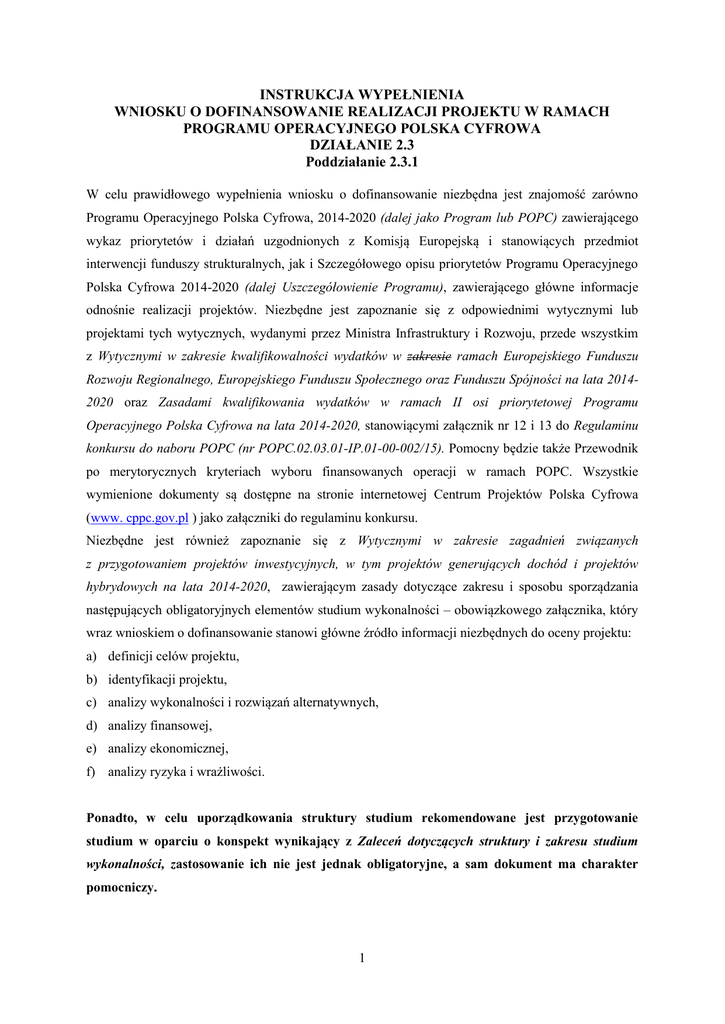 INSTRUKCJA WYPEŁNIENIA WNIOSKU O DOFINANSOWANIE REALIZACJI PROJEKTU W RAMACH PROGRAMU OPERACYJNEGO POLSKA CYFROWA DZIAŁANIE 2.3 Poddziałanie 2.3.1 W celu prawidłowego wypełnienia wniosku o dofinansowanie niezbędna jest znajomość zarówno Programu Operacyjnego Polska Cyfrowa, 2014-2020 (dalej jako Program lub POPC) zawierającego wykaz priorytetów i działań uzgodnionych z Komisją Europejską i stanowiących przedmiot interwencji funduszy strukturalnych, jak i Szczegółowego opisu priorytetów Programu Operacyjnego Polska Cyfrowa 2014-2020 (dalej Uszczegółowienie Programu), zawierającego główne informacje odnośnie realizacji projektów. Niezbędne jest zapoznanie się z odpowiednimi wytycznymi lub projektami tych wytycznych, wydanymi przez Ministra Infrastruktury i Rozwoju, przede wszystkim z Wytycznymi w zakresie kwalifikowalności wydatków w zakresie ramach Europejskiego Funduszu Rozwoju Regionalnego, Europejskiego Funduszu Społecznego oraz Funduszu Spójności na lata 20142020 oraz Zasadami kwalifikowania wydatków w ramach II osi priorytetowej Programu Operacyjnego Polska Cyfrowa na lata 2014-2020, stanowiącymi załącznik nr 12 i 13 do Regulaminu konkursu do naboru POPC (nr POPC.02.03.01-IP.01-00-002/15). Pomocny będzie także Przewodnik po merytorycznych kryteriach wyboru finansowanych operacji w ramach POPC. Wszystkie wymienione dokumenty są dostępne na stronie internetowej Centrum Projektów Polska Cyfrowa (www. cppc.gov.pl ) jako załączniki do regulaminu konkursu. Niezbędne jest również zapoznanie się z Wytycznymi w zakresie zagadnień związanych z przygotowaniem projektów inwestycyjnych, w tym projektów generujących dochód i projektów hybrydowych na lata 2014-2020, zawierającym zasady dotyczące zakresu i sposobu sporządzania następujących obligatoryjnych elementów studium wykonalności – obowiązkowego załącznika, który wraz wnioskiem o dofinansowanie stanowi główne źródło informacji niezbędnych do oceny projektu: a) definicji celów projektu, b) identyfikacji projektu, c) analizy wykonalności i rozwiązań alternatywnych, d) analizy finansowej, e) analizy ekonomicznej, f) analizy ryzyka i wrażliwości. Ponadto, w celu uporządkowania struktury studium rekomendowane jest przygotowanie studium w oparciu o konspekt wynikający z Zaleceń dotyczących struktury i zakresu studium wykonalności, zastosowanie ich nie jest jednak obligatoryjne, a sam dokument ma charakter pomocniczy. 1 Projekty współfinansowane z Europejskiego Funduszu Rozwoju Regionalnego muszą być zgodne z celami zawartymi w Programie i Uszczegółowieniu Programu oraz zgodne z regulacjami dotyczącymi funduszy strukturalnych. Zgłaszane projekty (wnioski o dofinansowanie) poddane będą szczegółowej analizie, a następnie ocenie co do zgodności z kryteriami wyboru projektów przyjętymi przez Komitet Monitorujący POPC. Do przygotowania wniosku o dofinansowanie dla Poddziałania 2.3.1 POPC służy elektroniczny formularz wniosków zamieszczony na platformie ePUAP (http://epuap.gov.pl) lub w innej formie udostępniony przez IOK. Warunkiem złożenia wniosku w formie elektronicznej jest posiadanie konta na platformie ePUAP oraz profilu zaufanego lub bezpiecznego podpisu elektronicznego weryfikowanego ważnym kwalifikowalnym certyfikatem. Wnioski o dofinansowanie projektu można składać w formie elektronicznej lub papierowej, w trybach wskazanych poniżej: 1. Wnioski o dofinansowanie projektu przyjmowane są w formie elektronicznej za pośrednictwem elektronicznej skrzynki podawczej CPPC (adres skrzynki ePUAP: /2yki7sk30g/nab231popc). Formularz wniosku jest dostępny w katalogu usług publicznych na Elektronicznej Platformie Usług Administracji Publicznej (ePUAP) 2. Wnioski w formie papierowej, wraz z obligatoryjną wersją zapisaną na nośniku elektronicznym, należy składać osobiście lub przesyłką rejestrowaną w siedzibie IP, w biurze podawczym pod adresem: Centrum Projektów Polska Cyfrowa ul. Syreny 23 01-150 Warszawa od poniedziałku do piątku w godzinach od 8.15 do 16.15 Wniosek w wersji papierowej musi być zaparafowany na każdej stronie przez Wnioskodawcę lub osobę uprawnioną do reprezentowania Wnioskodawcy, która złożyła podpis w miejscu wyznaczonym na podpis Wnioskodawcy. Wymogi dotyczące przygotowania wniosku o dofinansowanie: 1) Należy zastosować właściwy dla poddziałania 2.3.1 formularz wniosku (dotyczy również załączników, jeżeli przewidziano specjalne formularze dla załączników). 2) Wniosek o dofinansowanie należy wypełnić w języku polskim. 3) Należy przestrzegać ograniczeń w zakresie maksymalnej, dopuszczalnej liczby znaków w poszczególnych polach opisowych. Podane w instrukcji informacje w zakresie maksymalnej liczby znaków odnoszą się do znaków liczonych łącznie ze spacjami. 2 4) Wszystkie wymagane pola wniosku muszą być wypełnione zgodnie z niniejszą instrukcją, w tym podane wszystkie wymagane dane oraz informacje. 5) Do wniosku należy załączyć wszystkie wymagane załączniki zgodnie z listą podaną przez IOK. 6) Wniosek powinien zawierać poprawne wyliczenia arytmetyczne (z dokładnością do 2 miejsc po przecinku). Zaokrąglenia powinny wynikać z ogólnie przyjętych zasad matematycznych tj. >/= 5 – zaokrąglać należy „w górę”, < 5 – zaokrąglać należy „w dół”. Wyjątek stanowi zaokrąglanie kwoty wnioskowanej dofinansowania oraz udziału wkładu UE w dofinansowaniu, którą w każdym przypadku zaokrąglać należy „w dół". Dodatkowe wymogi dotyczące przygotowania wniosku o dofinansowanie w przypadku składania wniosku w formie elektronicznej: 1) Wniosek w formie elektronicznej powinien zostać złożony z zastosowaniem elektronicznego formularza na platformie ePUAP. W przypadku składania dokumentacji z wykorzystaniem platformy ePUAP osoba uprawniona do reprezentowania wnioskodawcy powinna dysponować profilem zaufanym ePUAP lub bezpiecznym podpisem ele
