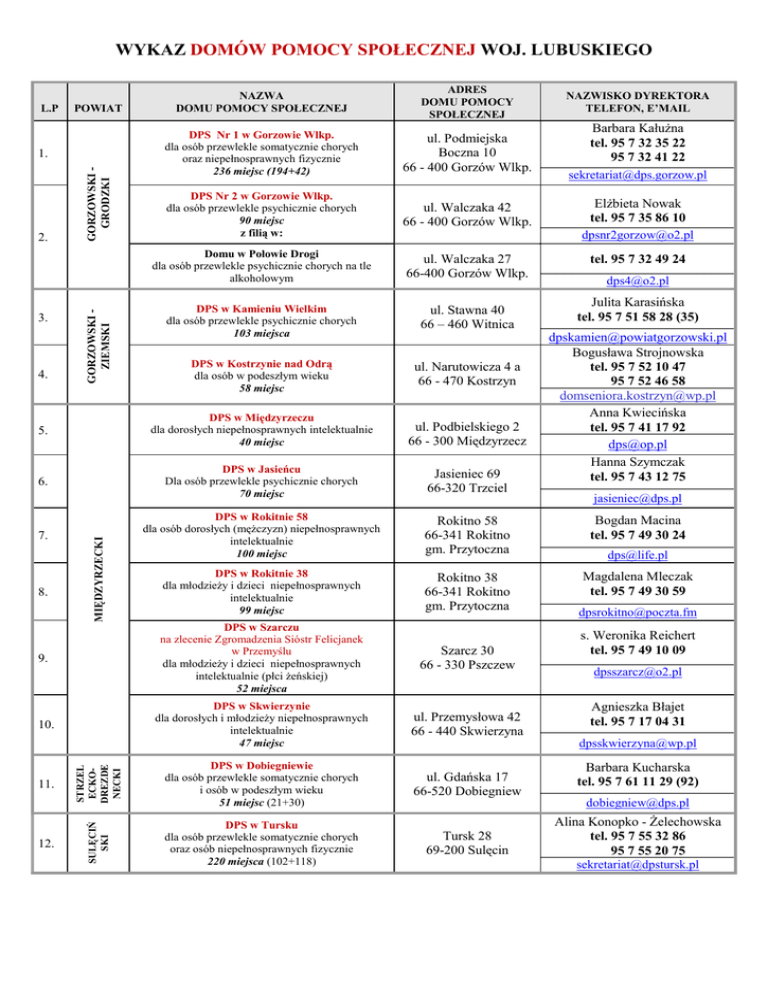 NAZWA DOMU POMOCY SPOŁECZNEJ ADRES DOMU POMOCY SPOŁECZNEJ DPS Nr 1 w Gorzowie Wlkp. dla osób przewlekle somatycznie chorych oraz niepełnosprawnych fizycznie 236 miejsc (194+42) ul. Podmiejska Boczna 10 66 - 400 Gorzów Wlkp. DPS Nr 2 w Gorzowie Wlkp. dla osób przewlekle psychicznie chorych 90 miejsc z filią w: ul. Walczaka 42 66 - 400 Gorzów Wlkp. Domu w Połowie Drogi dla osób przewlekle psychicznie chorych na tle alkoholowym ul. Walczaka 27 66-400 Gorzów Wlkp. DPS w Kamieniu Wielkim dla osób przewlekle psychicznie chorych 103 miejsca ul. Stawna 40 66 – 460 Witnica DPS w Kostrzynie nad Odrą dla osób w podeszłym wieku 58 miejsc ul. Narutowicza 4 a 66 - 470 Kostrzyn 5. DPS w Międzyrzeczu dla dorosłych niepełnosprawnych intelektualnie 40 miejsc ul. Podbielskiego 2 66 - 300 Międzyrzecz 6. DPS w Jasieńcu Dla osób przewlekle psychicznie chorych 70 miejsc Jasieniec 69 66-320 Trzciel DPS w Rokitnie 58 dla osób dorosłych (mężczyzn) niepełnosprawnych intelektualnie 100 miejsc Rokitno 58 66-341 Rokitno gm. Przytoczna Bogdan Macina tel. 95 7 49 30 24 DPS w Rokitnie 38 dla młodzieży i dzieci niepełnosprawnych intelektualnie 99 miejsc Rokitno 38 66-341 Rokitno gm. Przytoczna Magdalena Mleczak tel. 95 7 49 30 59 DPS w Szarczu na zlecenie Zgromadzenia Sióstr Felicjanek w Przemyślu dla młodzieży i dzieci niepełnosprawnych intelektualnie (płci żeńskiej) 52 miejsca Szarcz 30 66 - 330 Pszczew DPS w Skwierzynie dla dorosłych i młodzieży niepełnosprawnych intelektualnie 47 miejsc ul. Przemysłowa 42 66 - 440 Skwierzyna STRZEL ECKODREZDE NECKI DPS w Dobiegniewie dla osób przewlekle somatycznie chorych i osób w podeszłym wieku 51 miejsc (21+30) ul. Gdańska 17 66-520 Dobiegniew SULĘCIŃ SKI WYKAZ DOMÓW POMOCY SPOŁECZNEJ WOJ. LUBUSKIEGO DPS w Tursku dla osób przewlekle somatycznie chorych oraz osób niepełnosprawnych fizycznie 220 miejsca (102+118) Tursk 28 69-200 Sulęcin L.P POWIAT 4. 7. 8. GORZOWSKI ZIEMSKI 3. MIĘDZYRZECKI 2. GORZOWSKI GRODZKI 1. 9. 10. 11. 12. NAZWISKO DYREKTORA TELEFON, E’MAIL Barbara Kałużna tel. 95 7 32 35 22 95 7 32 41 22 [email protected] Elżbieta Nowak tel. 95 7 35 86 10 [email protected] tel. 95 7 32 49 24 [email protected] Julita Karasińska tel. 95 7 51 58 28 (35) [email protected] Bogusława Strojnowska tel. 95 7 52 10 47 95 7 52 46 58 [email protected] Anna Kwiecińska tel. 95 7 41 17 92 [email protected] Hanna Szymczak tel. 95 7 43 12 75 [email protected] [email protected] [email protected] s. Weronika Reichert tel. 95 7 49 10 09 [email protected] Agnieszka Błajet tel. 95 7 17 04 31 [email protected] Barbara Kucharska tel. 95 7 61 11 29 (92) [email protected] Alina Konopko - Żelechowska tel. 95 7 55 32 86 95 7 55 20 75 [email protected] 15. 16. ZIELONA GÓRA GRODZKI 14. ZIELONA GÓRA ZIEMSKI 13. 18. ŚWIEBODZIŃSKI 17. 22. DPS w Trzebiechowie dla osób przewlekle somatycznie chorych oraz dla osób niepełnosprawnych fizycznie 105 miejsc (80+25) DPS w Bełczu dla osób przewlekle somatycznie chorych oraz dla osób niepełnosprawnych fizycznie 75 miejsc (55+20) ul. Sulechowska 1 66 - 132 Trzebiechów DPS w Jordanowie dla osób przewlekle psychicznie chorych 82 miejsca Jordanowo 3 66 – 200 Świebodzin DPS w Glińsku dla kobiet przewlekle psychicznie chorych 100 miejsc Glińsk 51a 66 - 200 Świebodzin DPS w Toporowie dla dzieci i młodzieży niepełn. intelektualnie oraz dla dorosłych niepełnosprawnych intelektualnie 76 miejsc (26+50) ul. Świerczewskiego 17 66 - 233 Toporów ul. Parkowa 2 Gm. Dąbie 66-600 Krosno Odrzańskie Bełcze 19 66 - 130 Bojadła DPS w Kożuchowie dla osób przewlekle somatycznie chorych oraz niepełnosprawnych fizycznie 109 miejsc (89+20) ul. Szprotawska 19 67 - 120 Kożuchów DPS we Wschowie na zlecenie Zgromadzenia Sióstr Św. Elżbiety w Poznaniu dla dzieci i młodzieży niepełn. intelektualnie 60 miejsc Plac Św. Jana 1 67 - 400 Wschowa DPS w Lubsku dla osób przewlekle somatycznie chorych oraz osób w podeszłym wieku 135 miejsc (65+70) ul. Zamkowa 27 68 - 300 Lubsko DPS w Miłowicach dla dzieci i mlodzieży niepełn. intelektualnie oraz dla dorosłych niepełnosprawnych intelektualnie 80 miejsc (70+10) Miłowice 26 68 - 216 Olbrachtów ŻARSKI Elżbieta Michałowska tel. 68 3 20 20 64 [email protected] Piotr Mazurek tel. 68 3 27 08 38 [email protected] DPS w Szczawnie dla mężczyzn przewlekle psychicznie chorych 99 miejsc 23. 24. ul. Lubuska 11 65 - 265 Zielona Góra KROŚNI EŃSKI 21. DPS w Zielonej Górze dla kombatantów (osób w podeszłym wieku oraz osób przewlekle somatycznie chorych nie posiadających uprawnień kombatanckich) 188 miejsc (120+68) NOWOSOLS KI 20. ul. Słowackiego 29 65 - 326 Zielona Góra WSCHO WSKI 19. DPS w Zielonej Górze dla osób w podeszłym wieku oraz przewlekle somatycznie chory 68 miejsc (56+12) Agnieszka Szeląg tel. 68 3 51 41 11 [email protected] tel. 68 3 52 32 27 Barbara Daukszewicz tel. 68 3 81 10 20 [email protected] Anna Matusiak tel. 68 3 82 38 64 [email protected] Katarzyna Patrzek - Lebiotkowska tel. 68 3 41 10 76 [email protected] Aneta Bencar tel. 68 359 05 17 [email protected] Aldona Romanowska - Łuszcz tel. sekr 68 459 93 92; centr 68 459 93 91 fax. 68 459 93 92 [email protected] s. Zofia Glinka tel. 65 540 22 27 [email protected] p.o. Krystian Lesicki tel. 68 45 74 111, 68 45 74 112 fax 68 45 74 110 [email protected] Barbara Litewka tel. 68 3 74 38 22 [email protected]