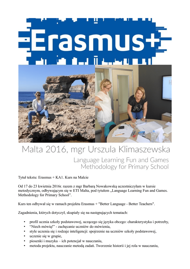 Tytuł tekstu: Erasmus + KA1. Kurs na Malcie Od 17 do 23 kwietnia 2016r. razem z mgr Barbarą Nowakowską uczestniczyłam w kursie metodycznym, odbywającym się w ETI Malta, pod tytułem „Language Learning Fun and Games. Methodology for Primary School”. Kurs ten odbywał się w ramach projektu Erasmus + "Better Language - Better Teachers". Zagadnienia, których dotyczył, skupiały się na następujących tematach: • • • • • • profil ucznia szkoły podstawowej, uczącego się języka obcego: charakterystyka i potrzeby, “Niech mówią!” - zachęcanie uczniów do mówienia, style uczenia się i rodzaje inteligencji: spojrzenie na uczniów szkoły podstawowej, uczenie się w grupie, piosenki i muzyka – ich potencjał w nauczaniu, metoda projektu, nauczanie metodą zadań. Tworzenie historii i jej rola w nauczaniu, • • • • siła video – uczenie poprzez YouTube, filmy, projekcje, gramatyka w grach i zabawach, wykorzystanie komputerów w nauczaniu języka obcego, własny rozwój językowy. Skąd pomysł, aby wziąć udział w kursie? Kursy, realizowane w ramach programu Erasmus + są dla nauczycieli fantastyczną szansą na to, aby nie tylko wzbogacić swój warsztat metodyczny, dokształcić się i zdobyć nowe narzędzia do codziennej pracy, ale także poznać nauczycieli z innych krajów, wymienić się doświadczeniami i nawiązać kontakty. Takie, które będą mogły w przyszłości zaowocować ciekawą, międzyszkolną i międzynarodową współpracą. Dzięki temu szkoła się rozwija, zwiększa się jakość jej pracy oraz poziom nauczania! Dlaczego Malta? Przede wszystkim dlatego, że motywuje do używania języka - co dla nauczycieli angielskiego ma decydujące znaczenie. Gdybym uczestniczyła w podobnym kursie w Warszawie, prawdopodobnie moja wiedza o metodach i sposobach nauczania byłaby podobna – tyle tylko że nie miałabym szansy na rozwój własnych umiejętności językowych. A to one czynią ze mnie profesjonalnego i motywującego uczniów swoim przykładem - nauczyciela. Po drugie: żeby poznać anglistów z innych krajów, porozmawiać, podzielić się doświadczeniami i wiedzą, co w pracy nauczyciela jest zawsze bezcenne. I wreszcie dlatego, że współczesny język angielski to nie tylko... BBC English. A z Katowic mimo wszystko łatwiej wylecieć do Londynu niż na Luqa (razem z panią Nowakowską leciałyśmy przez Monachium - w obie strony). Okiem kursantki Szkoła ETI jest olbrzymia i ma bardzo dobre zaplecze metodyczne. Realizuje wiele kursów dla nauczycieli w ramach programu Erasmus + ale także kształci młodzież i dorosłych z całej Europy wszystkich tych, którzy chcieliby uczyć się języka angielskiego w pięknym i słonecznym klimacie. Kurs metodyczny, w którym razem z panią Nowakowską wzięłyśmy udział, był świetnie prowadzony, przemyślany i dał nam wiele narzędzi do pracy z naszymi uczniami. Linki, materiały, ksera, doświadczenia: wszystko to, co możemy teraz, po powrocie, wprowadzać na nasze lekcje! Podczas zajęć nie tylko czerpałyśmy ze źródeł, jakie przedstawiała i udostępniała nam nasza prowadząca, Josie, ale także dzieliłyśmy się własnymi pomysłami i tymi elementami lekcji, które sprawdzają nam się najlepiej. Tak więc i my zostawiłyśmy swoje nauczycielskie ślady na Malcie. Co zyskała Piątka? Zyskała dwie nauczycielki języka angielskiego, które do swoich lekcji wprowadzają współczesne, interesujące dla uczniów i aktywizujące metody nauczania języka angielskiego. Takie, dzięki którym lekcja ma jeszcze lepszą niż dotychczas dynamikę, motywuje uczniów do powtórek słownictwa i elementów gramatycznych, rozśmiesza, prowokuje do językowej rywalizacji, a nawet... zadziwia. Uczniowie klas I - III, którzy w przyszłym roku poznają Vokiego, sami będą mogli coś na ten temat powiedzieć! Ciekawostki Językami urzędowymi na Malcie są: język angielski i język maltański. Maltański należy do rodziny języków semickich (jak hebrajski) i jest bardzo zbliżony do arabskiego i włoskiego. Malta jest sercem Morza Śródziemnego! Podczas II wojny światowej cała wyspa była okrutnie zniszczona/ zbombardowana, więc jej mieszkańcy musieli ją w krótkim czasie odgruzować, a potem odbudować. Dlatego też współczesna architektura nie robi tam oszałamiającego wrażenia. Na wyspie obowiązuje ruch lewostronny, ale na chodnikach - prawo! Tylko dlatego, że większość pieszych stanowią turyści z „normalnych” krajów. Maltańczycy do określania słońca używają metafory "this horrible yellow thing on the sky" (pol. ta okropna, żółta rzecz na niebie) i nie mają pojęcia, jak grzeszą. Po prostu nie mają. mgr Urszula Klimaszewska Zdjęcia: mgr Urszula Klimaszewska i mgr Barbara Nowakowska Dla zainteresowanych – szczegóły: Szkoła, o której mowa w tekście: ETI Malta http://www.etimalta.com/ Osoba kontaktowa: Franco E. Debono http://www.etimalta.com/executive-training-institutemalta/the-team/ Program Erasmus + http://erasmusplus.org.pl/