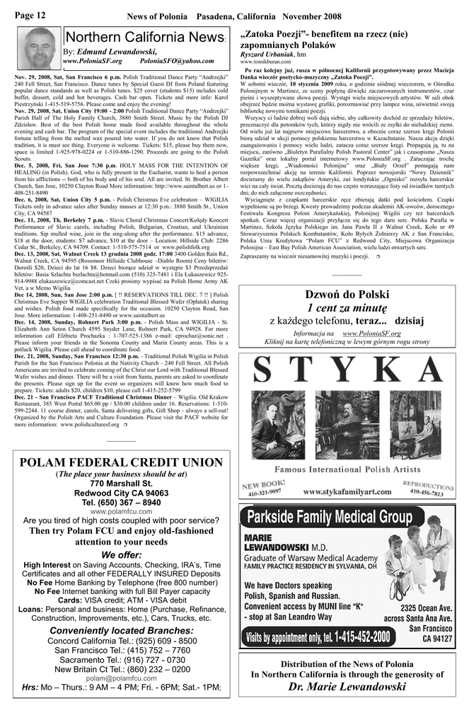 Page 12 News of Polonia Pasadena, California November 2008 Northern California News: By: Edmund Lewandowski, www.PoloniaSF.org [email protected] Nov. 29, 2008, Sat, San Francisco 6 p.m. Polish Traditional Dance Party “Andrzejki” 240 Fell Street, San Francisco. Dance tunes by Special Guest DJ from Poland featuring popular dance standards as well as Polish tunes. $25 cover (students $15) includes cold buffet, dessert, cold and hot beverages. Cash bar open. Tickets and more info: Karol Piestrzyński 1-415-519-5756. Please come and enjoy the evening! Nov. 29, 2008, Sat, Union City 19:00 - 2:00 Polish Traditional Dance Party “Andrzejki” Parish Hall of The Holy Family Church, 3880 Smith Street. Music by the Polish DJ Zdzisław. Best of the best Polish home made food available throughout the whole evening and cash bar. The program of the special event includes the traditional Andrzejki fortune telling from the melted wax poured into water. If you do not know that Polish tradition, it is must see thing. Everyone is welcome. Tickets: $15, please buy them now, space is limited 1-925-978-0224 or 1-510-886-1290. Proceeds are going to the Polish Scouts. Dec. 5, 2008, Fri, San Jose 7:30 p.m. HOLY MASS FOR THE INTENTION OF HEALING (in Polish). God, who is fully present in the Eucharist, wants to heal a person from his afflictions -- both of his body and of his soul. All are invited. St. Brother Albert Church, San Jose, 10250 Clayton Road More information: http://www.saintalbert.us or 1408-251-8490 Dec. 6, 2008, Sat, Union City 5 p.m. - Polish Christmas Eve celebration – WIGILIA Tickets only in advance sales after Sunday masses at 12:30 p.m.: 3880 Smith St., Union City, CA 94587 Dec. 11, 2008, Th, Berkeley 7 p.m. - Slavic Choral Christmas Concert/Kolędy Koncert Performance of Slavic carols, including Polish, Bulgarian, Croatian, and Ukrainian traditions. Sip mulled wine, join in the sing-along after the performance. $15 advance, $18 at the door, students: $7 advance, $10 at the door – Location: Hillside Club: 2286 Cedar St., Berkeley, CA 94709. Contact: 1-510-575-7514 or www.polishfolk.org Dec. 13, 2008, Sat, Walnut Creek 13 grudnia 2008 godz. 17:00 3400 Golden Rain Rd., Walnut Creek, CA 94595 (Rossmoor Hillside Clubhouse –Diablo Room) Ceny biletów: Dorośli $20, Dzieci do lat 16 $8. Dzieci biorące udział w występie $3 Przedsprzedaż biletów: Basia Szlachta [email protected] (510) 325-7481 i Ela Łukaszewicz 925914-9988 [email protected] Czeki prosimy wypisać na Polish Home Army AK Vet, a w Memo Wigilia Dec 14, 2008, Sun, San Jose 2:00 p.m. [ !! RESERVATIONS TILL DEC. 7 !! ] Polish Christmas Eve Supper WIGILIA celebration Traditional Blessed Wafer (Opłatek) sharing and wishes. Polish food made specifically for the occasion. 10250 Clayton Road, San Jose. More information: 1-408-251-8490 or www.saintalbert.us Dec. 14, 2008, Sunday, Rohnert Park 3:00 p.m. - Polish Mass and WIGILIA - St. Elizabeth Ann Seton Church 4595 Snyder Lane, Rohnert Park, CA 94928. For more information call Elżbieta Prochazka : 1-707-525-1386 e-mail: [email protected] . Please inform your friends in the Sonoma County and Marin County areas. This is a potluck Wigilia. Please call ahead to coordinate food. Dec. 21, 2008, Sunday, San Francisco 12:30 p.m. - Traditional Polish Wigilia in Polish Parish for the San Francisco Polonia at the Nativity Church - 240 Fell Street. All Polish Americans are invited to celebrate coming of the Christ our Lord with Traditional Blessed Wafer wishes and dinner. There will be a visit from Santa, parents are asked to coordinate the presents. Please sign up for the event so organizers will know how much food to prepare. Tickets: adults $20, children $10, please call 1-415-252-5799 Dec. 21 - San Francisco PACF Traditional Christmas Dinner – Wigilia. Old Krakow Restaurant, 385 West Portal $65.00 pp / $30.00 children under 16. Reservations: 1-510599-2244. 11 course dinner, carols, Santa delivering gifts, Gift Shop - always a sell-out! Organized by the Polish Arts and Culture Foundation. Please visit the PACF website for more information: www.polishculturesf.org ❒ „Zatoka Poezji”- benefitem na rzecz (nie) zapomnianych Polaków Ryszard Urbaniak, hm www.tomikburan.com Po raz kolejny już, rusza w północnej Kalifornii przygotowywany przez Macieja Danka wieczór poetycko-muzyczny „Zatoka Poezji”. W sobotni wieczór, 10 stycznia 2009 roku, o godzinie siódmej wieczorem, w Ośrodku Polonijnym w Martinez, ze sceny popłyną dźwięki zaczarowanych instrumentów, czar pieśni i wyszeptywane słowa poezji. Wystąpi wielu miejscowych artystów. W sali obok obejrzeć będzie można wystawę grafiki, porozmawiać przy lampce wina, uświetnić swoją bibliotekę nowymi tomikami poezji. Wszyscy ci ludzie dobrej woli dają siebie, aby całkowity dochód ze sprzedaży biletów, przeznaczyć dla potomków tych, którzy nigdy nie wrócili ze zsyłki do nieludzkiej ziemi. Od wielu już lat najpierw miejscowe harcerstwo, a obecnie coraz szersze kręgi Polonii biorą udział w akcji pomocy polskiemu harcerstwu w Kazachstanie. Nasza akcja dzięki zaangażowaniu i pomocy wielu ludzi, zatacza coraz szersze kręgi. Propagują ją, tu na miejscu, zarówno „Biuletyn Parafialny Polish Pastoral Center” jak i czasopismo „Nasza Gazetka” oraz lokalny portal internetowy www.PoloniaSF.org . Zataczając trochę większe kręgi, „Wiadomości Polonijne” oraz „Biały Orzeł” pomagają nam rozpowszechniać akcję na terenie Kalifornii. Poprzez nowojorski “Nowy Dziennik” docieramy do wielu zakątków Ameryki, zaś londyńskie „Ognisko” rozsyła harcerskie wici na cały świat. Pocztą docierają do nas często wzruszające listy od świadków tamtych dni; do nich załączone oszczędności. Wyciągnięte z czapkami harcerskie ręce zbierają datki pod kościołem. Czapki wypełnione są po brzegi. Kwesty prowadzimy podczas akademii AK-owców, dorocznego Festiwalu Kongresu Poloni Amerykańsk