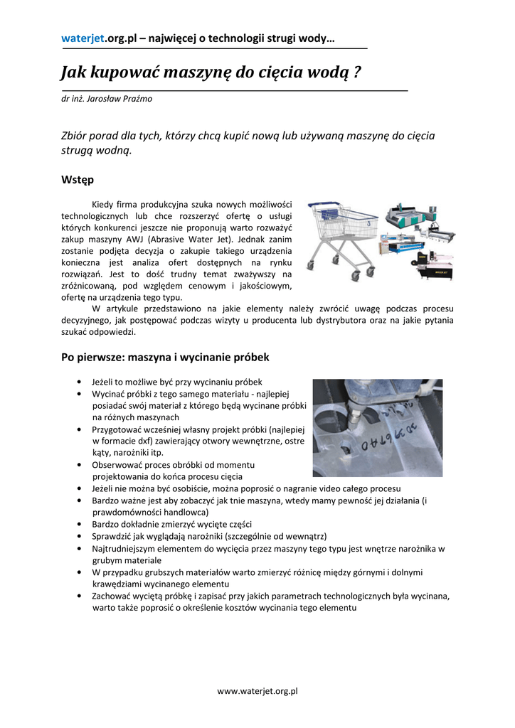 waterjet.org.pl – najwięcej o technologii strugi wody… Jak kupować maszynę do cięcia wodą ? dr inż. Jarosław Praźmo Zbiór porad dla tych, którzy chcą kupić nową lub używaną maszynę do cięcia strugą wodną. Wstęp Kiedy firma produkcyjna szuka nowych możliwości technologicznych lub chce rozszerzyć ofertę o usługi których konkurenci jeszcze nie proponują warto rozważyć zakup maszyny AWJ (Abrasive Water Jet). Jednak zanim zostanie podjęta decyzja o zakupie takiego urządzenia konieczna jest analiza ofert dostępnych na rynku rozwiązań. Jest to dość trudny temat zważywszy na zróżnicowaną, pod względem cenowym i jakościowym, ofertę na urządzenia tego typu. W artykule przedstawiono na jakie elementy należy zwrócić uwagę podczas procesu decyzyjnego, jak postępować podczas wizyty u producenta lub dystrybutora oraz na jakie pytania szukać odpowiedzi. Po pierwsze: maszyna i wycinanie próbek • • • • • • • • • • • Jeżeli to możliwe być przy wycinaniu próbek Wycinać próbki z tego samego materiału - najlepiej posiadać swój materiał z którego będą wycinane próbki na różnych maszynach Przygotować wcześniej własny projekt próbki (najlepiej w formacie dxf) zawierający otwory wewnętrzne, ostre kąty, narożniki itp. Obserwować proces obróbki od momentu projektowania do końca procesu cięcia Jeżeli nie można być osobiście, można poprosić o nagranie video całego procesu Bardzo ważne jest aby zobaczyć jak tnie maszyna, wtedy mamy pewność jej działania (i prawdomówności handlowca) Bardzo dokładnie zmierzyć wycięte części Sprawdzić jak wyglądają narożniki (szczególnie od wewnątrz) Najtrudniejszym elementem do wycięcia przez maszyny tego typu jest wnętrze narożnika w grubym materiale W przypadku grubszych materiałów warto zmierzyć różnicę między górnymi i dolnymi krawędziami wycinanego elementu Zachować wyciętą próbkę i zapisać przy jakich parametrach technologicznych była wycinana, warto także poprosić o określenie kosztów wycinania tego elementu www.waterjet.org.pl waterjet.org.pl – najwięcej o technologii strugi wody… Sprawdzić powtarzalność Powtarzalność to zdolność do powtarzalnej produkcji tego samego elementu z tą samą tolerancją. Nie osiągnie się swoich celów jeżeli będzie potrzeba wycinać element 5 razy zanim osiągnie się akceptowalny efekt. Sprawdzać powtarzalność robiąc kilka takich samych elementów w różnych punktach stołu maszyny. Można je położyć jeden na drugim i sprawdzić czy pokrywają się linie i krawędzie. Jeśli maszyna jest dobra, nie powinno być żadnej różnicy. Mierzyć rezultat Zawsze mierzyć wycinane części tak dokładnie jak to tylko możliwe. Precyzyjność maszyn AWJ jest dość wysoka - można nie zauważyć różnic gołym okiem. Warto sprawdzić krytycznie wymiary elementu, zobaczyć jak to się ma do projektu i porównać z danymi producenta maszyny. Nie porównywać jabłek z pomarańczami Zawsze wycinać ten sam element (wg tego samego projektu) z tego samego materiału na maszynach różnych producentów, wtedy łatwiej porównać pracę i dokładność różnych maszyn. Pozwoli to ocenić czas obróbki, precyzję, oraz końcową jakość. Producent maszyny będzie miał swoje próbki, ale zawsze należy się upewnić, że maszyna będzie w stanie wyciąć także nasz element. Liniowe prędkości cięcia Liniowe prędkości cięcia - szybkość poruszania się głowicy po linii prostej - nie odzwierciedlają prędkości z jaką faktycznie następuje proces przecinania. W przypadku precyzyjnej obróbki elementów potrzebne są zdecydowanie mniejsze prędkości co gwarantuje większą dokładność i jakość powierzchni przecinania (właściwości obróbkowe strumienia wodno-ściernego powodują konieczność zmniejszenia prędkości maszyny przy wycinaniu narożników i łuków tak aby wyciąć je dokładnie). Nie pytać - "Jak szybko maszyna tnie aluminium o grubości 80mm ?" Zapytać - "Ile czasu zajmie wycięcie tej części i jakiej się mogę spodziewać dokładności?" Poprosić o dowód w postaci wycięcia konkretnej części. Zapytać o koszty operacyjne Warto zapytać jakie są wszystkie koszty uruchomienia maszyny i oraz godzina jej efektywnej pracy. Największy wpływ na koszt roboczogodziny mogą mieć: koszt energii elektrycznej, wody, kanalizacji, ścierniwa oraz koszty serwisu, www.waterjet.org.pl waterjet.org.pl – najwięcej o technologii strugi wody… części zamiennych (dysz, uszczelnień pompy itp.), cena zakupu, a także praca operatora. Dokonać kalkulacji: ile dni pracy maszyny w miesiącu zajmie jej spłacenie. Poprosić kilku producentów o wycięcie tej samej próbki, wraz z podaniem kosztu i czasu jej wykonania. Prawdopodobnie uwidocznią się tu spore różnice wynikające z efektywności oprogramowania sterującego maszyną, zastosowanych głowic, użytych pomp i innych czynników. Poprosić producenta o dokładne dane kosztów pracy maszyny oraz wyszczególnienie co w tej cenie jest zawarte. Rozmawiać z klientami, którzy używają maszyny danego producenta Ludzie, którzy używają maszyny na co dzień najlepiej wiedzą jak ona działa. Warto zapytać ich o to: • Jak działa serwis i wsparcie techniczne ? • Jaki mają stosunek do producenta maszyny ? • Jakie "niespodzianki" odkryli podczas eksploatacji maszyny ? • Czy dostawca maszyny sprostał ich oczekiwaniom ? • Czy kupiliby jeszcze raz tą maszynę ? Jeśli jest się potencjalnym konkurentem osoby z którą rozmawiamy, można otrzymać nieprawdziwe informacje. Najlepiej porozmawiać z kimś z drugiego końca kraju, lub z osobą działającą w zupełnie innej branży. Można poprosić także producenta maszyn o referencje, lub znaleźć kogoś kto nie dał im referencji. Należy również pamiętać, że ludzie rzadko przyznają się do błędnych decyzji zakupowych i mogą próbować przekon