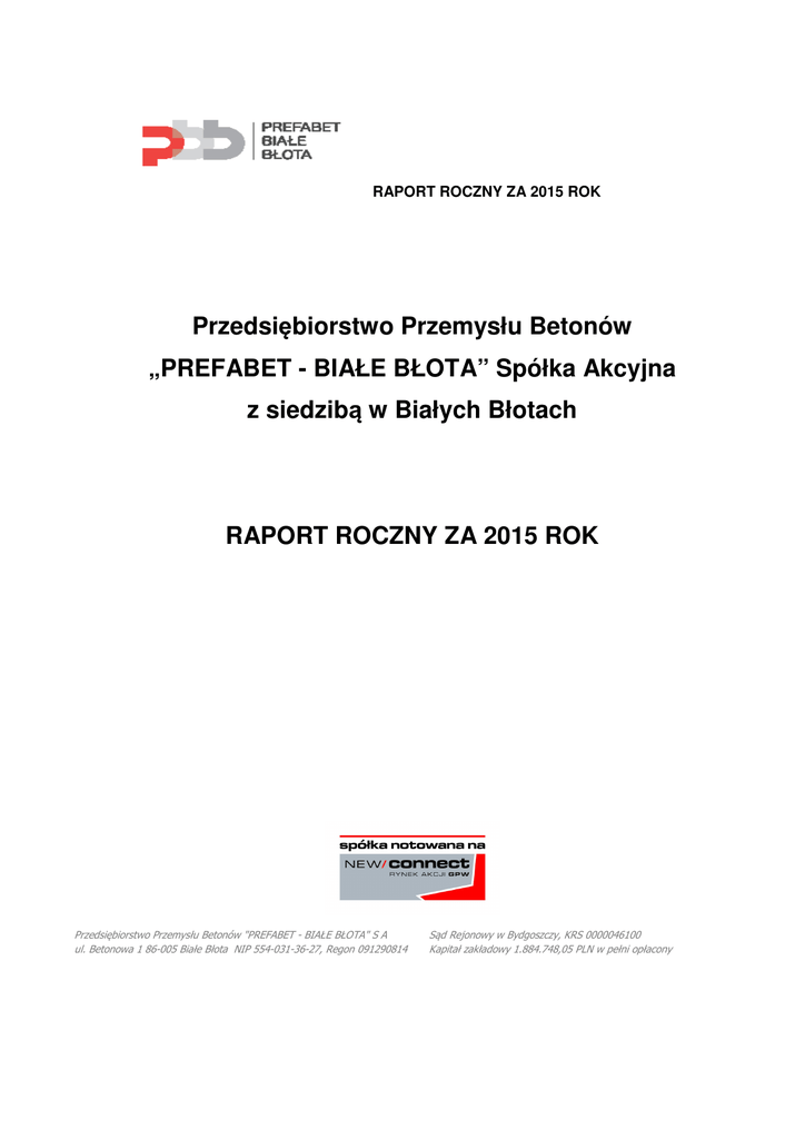 RAPORT ROCZNY ZA 2015 ROK Przedsiębiorstwo Przemysłu Betonów „PREFABET - BIAŁE BŁOTA” Spółka Akcyjna z siedzibą w Białych Błotach RAPORT ROCZNY ZA 2015 ROK Przedsiębiorstwo Przemysłu Betonów "PREFABET - BIAŁE BŁOTA" S A ul. Betonowa 1 86-005 Białe Błota NIP 554-031-36-27, Regon 091290814 Sąd Rejonowy w Bydgoszczy, KRS 0000046100 Kapitał zakładowy 1.884.748,05 PLN w pełni opłacony SPIS TREŚCI : PISMO ZARZĄDU SPÓŁKI DO AKCJONARIUSZY ………………………………………………………………………………. s. 3 INFORMACJE FINANSOWE ………………………………………………………………………………………………………. s. 4 1. Wprowadzenie …………………………………………………………………………………………………………………………. s. 4 2. Bilans aktywa ……………………………………………………………………………………………………………………………. s. 4 3. Bilans pasywa ……………………………………………………………………………………………………………………………. s. 5 4. Rachunek zysków i strat ……………………………………………………………………………………………………………. s. 6 5. Zestawienie zmian w kapitale ……………………………………………………………………………………………………… s. 7 6. Rachunek przepływów pieniężnych ……………………………………………………………………………………………… s. 7 SPRAWOZDANIE ZARZĄDU Z DZIAŁALNOŚCI SPÓŁKI W 2015 ROKU ……………………………………… s. 8 I PODSTAWOWE INFORMACJE ……………………………………………………………………………………………………… s. 9 II. 1. Opis spółki ……………………………………………………………………………………………………………………… s. 9 2. Dane Spółki …………………………………………………………………………………………………………………… s. 9 3. Organy Spółki ………………………………………………………………………………………………………………… s. 9 4. Struktura akcjonariatu ……………………………………………………………………………………………………… s. 12 5. Stosowanie ładu korporacyjnego ……………………………………………………………………………………… s. 12 6. Nabycie akcji własnych ……………………………………………………………………………………………………… s. 12 7. Informacja o oddziałach Spółki ………………………………………………………………………………………… s. 12 8. Zatrudnienie w Spółce ……………………………………………………………………………………………………… s. 12 ISTOTNE ZDARZENIA W ROZWOJU DZIAŁALNOŚCI SPÓŁKI, JAKIE NASTĄPIŁY W 2015 ROKU ORAZ PO JEGO ZAKOŃCZENIU …………………………………………………………………………………………………………… s. 13 III. ISTOTNE UMOWY ZAWARTE W ROKU OBROTOWYM ……………………………………………………………… s. 13 IV. INFORMACJA O PODSTAWOWYCH PRODUKTACH, TOWARACH I USŁUGACH …………………………… s. 15 V. INFORMACJE O RYNKACH ZBYTU I ZAOPATRZENIA ………………………………………………………………… s. 17 VI. STRATEGIA ROZWOJU ………………………………………………………………………………………………………… s. 17 VII. PRZYJĘTE ZASADY RACHUNKOWOŚCI …………………………………………………………………………………… s. 17 VIII. WAŻNIEJSZE OSIĄGNIĘCIA W DZIEDZINIE BADAŃ I ROZWOJU………………………………………………… s. 18 IX. SYTUACJA FINANSOWA SPÓŁKI …………………………………………………………………………………………… s. 18 X. INSTRUMENTY FINANSOWE ………………………………………………………………………………………………… s. 21 XI. OPIS ISTOTNYCH CZYNNIKÓW RYZYKA I ZAGROŻEN ……………………………………………………………… s. 21 XII. PODSUMOWANIE ………………………………………………………………………………………………………………… s. 24 OŚWIADCZENIA ZARZĄDU ………………………………………………………………………………………………………………….. s. 25 2 RAPORT ROCZNY ZA 2015 ROK PISMO ZARZĄDU SPÓŁKI DO AKCJONARIUSZY SZANOW NI PANSTW O Z wielką przyjemnością w imieniu Przedsiębiorstwa Przemysłu Betonów „PREFABET-BIAŁE BŁOTA” Spółka Akcyjna chcielibyśmy zaprezentować Państwu raport roczny podsumowujący działalność i osiągnięcia Spółki w 2015 roku. W roku 2015 większość działań Zarządu Spółki koncentrowało się na zwiększeniu poziomu produkcji, sprzedaży i optymalizacji zatrudnienia, poszukiwaniu nowych kontrahentów i pozyskiwaniu istotnych zamówień na wyroby i usługi Spółki. Dbając o stałych klientów nie przestajemy poszukiwać nowych partnerów i rynków, co potwierdza nasz udział w realizacjach zamówień w kraju i za granicą. Wyniki finansowe Spółki prezentują się dobrze dzięki zróżnicowanej ofercie produktowej i optymalizacji kosztów. Tym samym potwierdziły ustabilizowaną pozycję Spółki na rynku budowlanym. Zlecenia pozyskane przez Spółkę, także jako generalnego wykonawcę obiektów budowlanych, dały efektywną możliwość wykorzystania pozostałych elementów biznesowych działalności (dost
