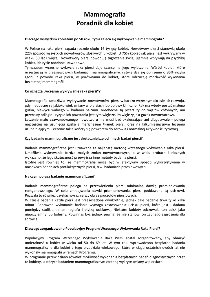 Mammografia Poradnik dla kobiet Dlaczego wszystkim kobietom po 50 roku życia zaleca się wykonywanie mammografii? W Polsce na raka piersi zapada rocznie około 16 tysięcy kobiet. Nowotwory piersi stanowią około 22% spośród wszystkich nowotworów złośliwych u kobiet. U 75% kobiet rak piersi jest wykrywany w wieku 50 lat i więcej. Nowotwory piersi powodują zagrożenie życia, ujemnie wpływają na psychikę kobiet, ich życie rodzinne i zawodowe. Tymczasem wczesne wykrycie raka piersi daje szansę na jego wyleczenie. Wśród kobiet, które uczestniczą w przesiewowych badaniach mammograficznych stwierdza się obniżenie o 35% ryzyka zgonu z powodu raka piersi, w porównaniu do kobiet, które odrzucają możliwość wykonania bezpłatnej mammografii. Co oznacza „wczesne wykrywanie raka piersi"? Mammografia umożliwia wykrywanie nowotworów piersi w bardzo wczesnym okresie ich rozwoju, gdy nieobecne są jakiekolwiek zmiany w piersiach lub objawy kliniczne. Rak ma wtedy postać małego guzka, niewyczuwalnego w badaniu palcami. Nieobecne są przerzuty do węzłów chłonnych, ani przerzuty odległe - ryzyko ich powstania jest tym większe, im większy jest guzek nowotworowy. Leczenie mało zaawansowanego nowotworu nie musi być okaleczające ani długotrwałe - polega najczęściej na usunięciu guzka z marginesem tkanek piersi, oraz na kilkumiesięcznym leczeniu uzupełniającym. Leczenie takie kończy się powrotem do zdrowia i normalnej aktywności życiowej. Czy badanie mammograficzne jest skuteczniejsze od innych badań piersi? Badanie mammograficzne jest uznawane za najlepszą metodę wczesnego wykrywania raka piersi. Umożliwia wykrywanie bardzo małych zmian nowotworowych, a w wielu próbach klinicznych wykazano, że jego skuteczność przewyższa inne metody badania piersi. Istotne jest również to, że mammografia może być w efektywny sposób wykorzystywana w masowych badaniach profilaktycznych piersi, tzw. badaniach przesiewowych. Na czym polega badanie mammograficzne? Badanie mammograficzne polega na prześwietleniu piersi minimalną dawką promieniowania rentgenowskiego. W celu zmniejszenia dawki promieniowania, piersi poddawane są uciskowi. Pozwala to również uzyskać wyraźniejszy obraz gruczołów piersiowych. W czasie badania każda pierś jest prześwietlona dwukrotnie, jednak całe badanie trwa tylko kilka minut. Poprawne wykonanie badania wymaga zastosowania ucisku piersi, która jest układana pomiędzy stolikiem mammografu i płytką uciskową. Niektóre kobiety odczuwają ten ucisk jako nieprzyjemny lub bolesny. Powinnaś być jednak pewna, że nie stanowi on żadnego zagrożenia dla zdrowia. Dlaczego zorganizowano Populacyjny Program Wczesnego Wykrywania Raka Piersi? Populacyjny Program Wczesnego Wykrywania Raka Piersi został zorganizowany, aby obniżyć umieralność u kobiet w wieku od 50 do 69 lat. W tym celu wprowadzono bezpłatne badania mammograficzne dla kobiet z tego przedziału wiekowego, które w ciągu ostatnich dwóch lat nie wykonały mammografii w ramach Programu. W programie przewidziano również możliwość wykonania bezpłatnych badań diagnostycznych przez te kobiety, u których badaniem mammograficznym zostaną wykryte zmiany w piersiach. Jak przygotować się na badanie? Możesz otrzymać zaproszenie na mammografię do pracowni mammograficznej w szpitalu lub w przychodni, albo do tzw. mammobusu. Pamiętaj, na badanie mammograficzne w ramach Programu możesz się zgłosić również bez zaproszenia, jeżeli masz 50-69 lat i w ciągu ostatnich 2 lat nie wykonywałaś mammografii. Na badanie weź ze sobą dowód osobisty i aktualne ubezpieczenie. Jeżeli posiadasz zdjęcia z poprzednich badań, weź je ze sobą. Porównanie poprzedniej mammografii z obecną będzie cenną informacją dla lekarza opisującego zdjęcie. W dniu badania nie należy stosować dezodorantów, szczególnie na bazie talku, ponieważ jego drobiny mogą wpłynąć na obraz piersi widoczny na mammogramach. Do badania należy się rozebrać do pasa, lepiej więc nie ubierać się w sukienkę, lecz strój dwuczęściowy. Jak przebiega badanie profilaktyczne? Po zarejestrowaniu Twojej wizyty w bazie danych będziesz proszona o wypełnienie krótkiej ankiety jeśli to konieczne zabierz ,ze sobą okulary. Następnie zostaniesz zaproszona do pracowni mammograficznej w celu wykonania zdjęć. Wszystkie procedury związane z wizytą w ośrodku badań profilaktycznych nie trwają dużej niż pół godziny. Po wykonaniu badania upewnił się, kiedy i w jaki sposób możesz dowiedzieć się o jego wynik. Jak odebrać wynik badania? Wyniki mammografii powinnaś otrzymać najpóźniej w ciągu 3 tygodni. Najczęściej wyniki są do odebrania w pracowni lub ośrodku, w którym wykonywałaś badanie. Jeżeli będziesz badana w mammobusie możesz otrzymać wynik pocztą. Wykonane zdjęcia są często przechowywane w archiwum pracowni wtedy otrzymasz tylko opis badania i zalecenia dotyczące terminu kolejnego badania profilaktycznego. Natomiast, jeżeli po mammografii lekarz uzna, że potrzebne są dodatkowe badania diagnostyczne - z wynikiem mammografii otrzymasz zdjęcia oraz skierowanie i informację, gdzie powinnaś zgłosić się na kolejne badanie. Jakie informacje zawiera wynik badania? Wynik badania mammograficznego może być pozytywny lub negatywny. Warto pamiętać, że negatywny wynik badania przesiewowego oznacza brak zmian chorobowych w piersiach. Wynik pozytywny zaś oznacza konieczność wykonania dodatkowych badań (np. USG, zdjęcie powiększone). Wynik, jaki kobiety otrzymują po mammografii, najczęściej jest krótki i zawiera stwierdzenie o braku podejrzanych zmian oraz informacje, za jaki czas należy zgłosić się na kolejne badanie. Jeżeli wynik mammografii jest pozytywny - w opisie pojawia się informacja o potrzebie uzupełnienia badania. Kobieta otrzymuje dodatkowo skierowanie z adresem ośrodka wykonującego bezpłatne badania diagnostyczne. W tak
