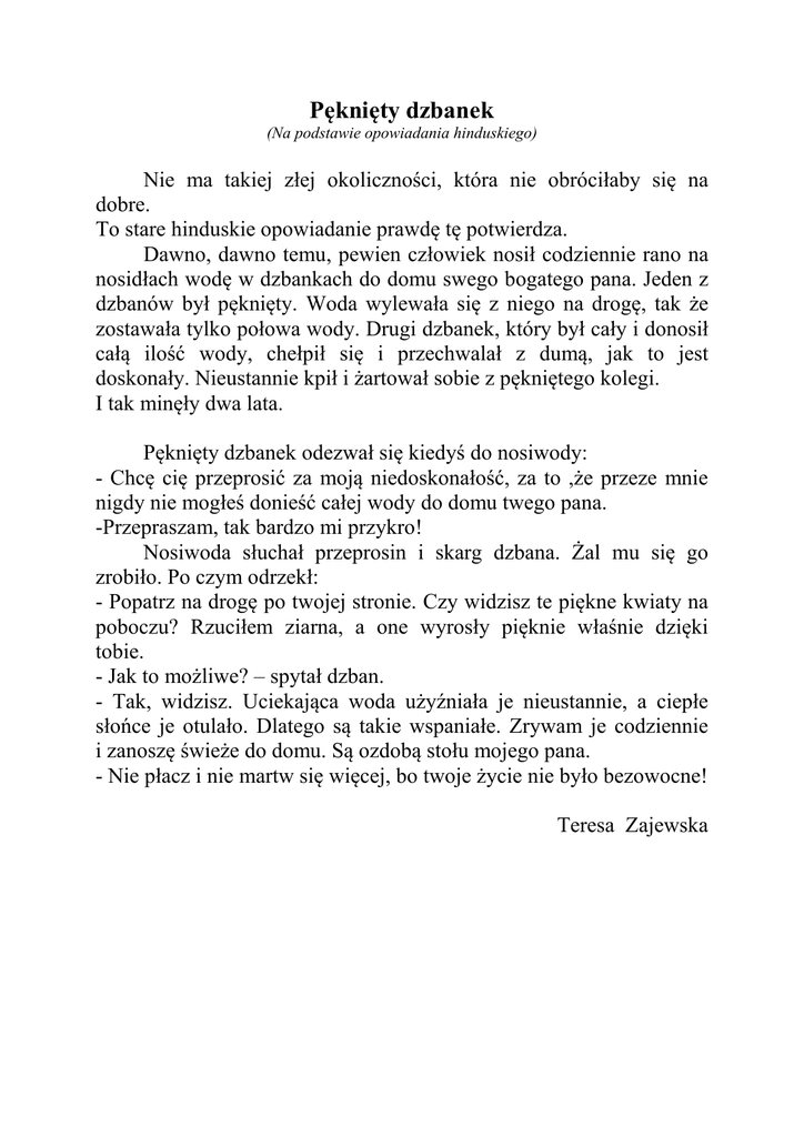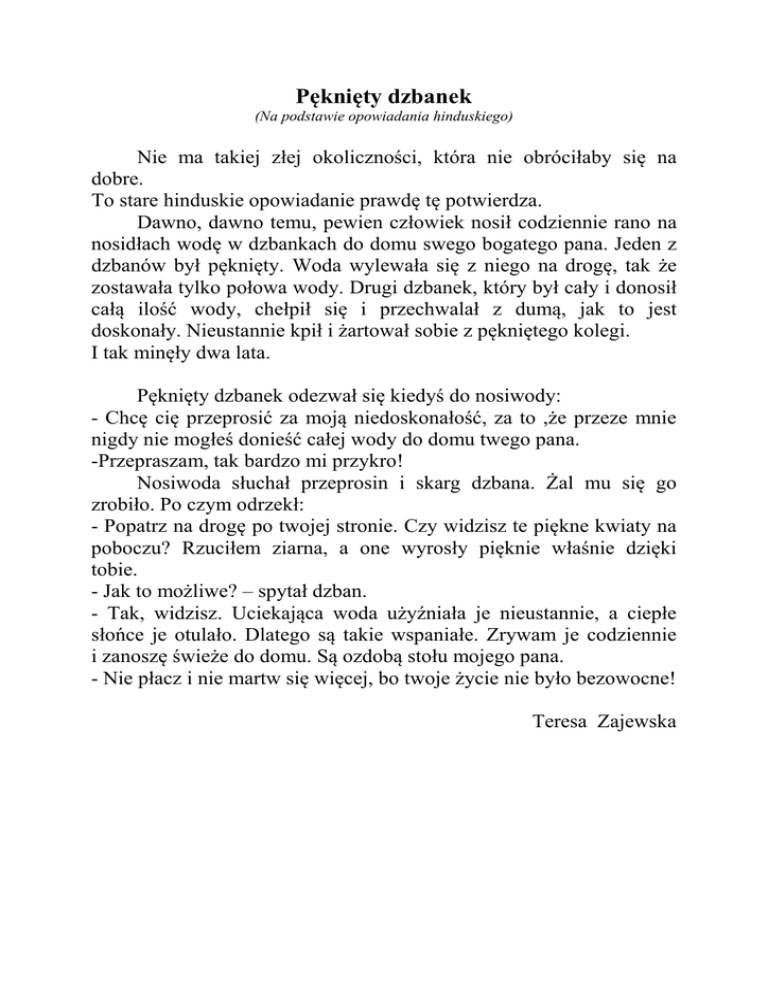 Pęknięty dzbanek (Na podstawie opowiadania hinduskiego) Nie ma takiej złej okoliczności, która nie obróciłaby się na dobre. To stare hinduskie opowiadanie prawdę tę potwierdza. Dawno, dawno temu, pewien człowiek nosił codziennie rano na nosidłach wodę w dzbankach do domu swego bogatego pana. Jeden z dzbanów był pęknięty. Woda wylewała się z niego na drogę, tak że zostawała tylko połowa wody. Drugi dzbanek, który był cały i donosił całą ilość wody, chełpił się i przechwalał z dumą, jak to jest doskonały. Nieustannie kpił i żartował sobie z pękniętego kolegi. I tak minęły dwa lata. Pęknięty dzbanek odezwał się kiedyś do nosiwody: - Chcę cię przeprosić za moją niedoskonałość, za to ,że przeze mnie nigdy nie mogłeś donieść całej wody do domu twego pana. -Przepraszam, tak bardzo mi przykro! Nosiwoda słuchał przeprosin i skarg dzbana. Żal mu się go zrobiło. Po czym odrzekł: - Popatrz na drogę po twojej stronie. Czy widzisz te piękne kwiaty na poboczu? Rzuciłem ziarna, a one wyrosły pięknie właśnie dzięki tobie. - Jak to możliwe? – spytał dzban. - Tak, widzisz. Uciekająca woda użyźniała je nieustannie, a ciepłe słońce je otulało. Dlatego są takie wspaniałe. Zrywam je codziennie i zanoszę świeże do domu. Są ozdobą stołu mojego pana. - Nie płacz i nie martw się więcej, bo twoje życie nie było bezowocne! Teresa Zajewska
