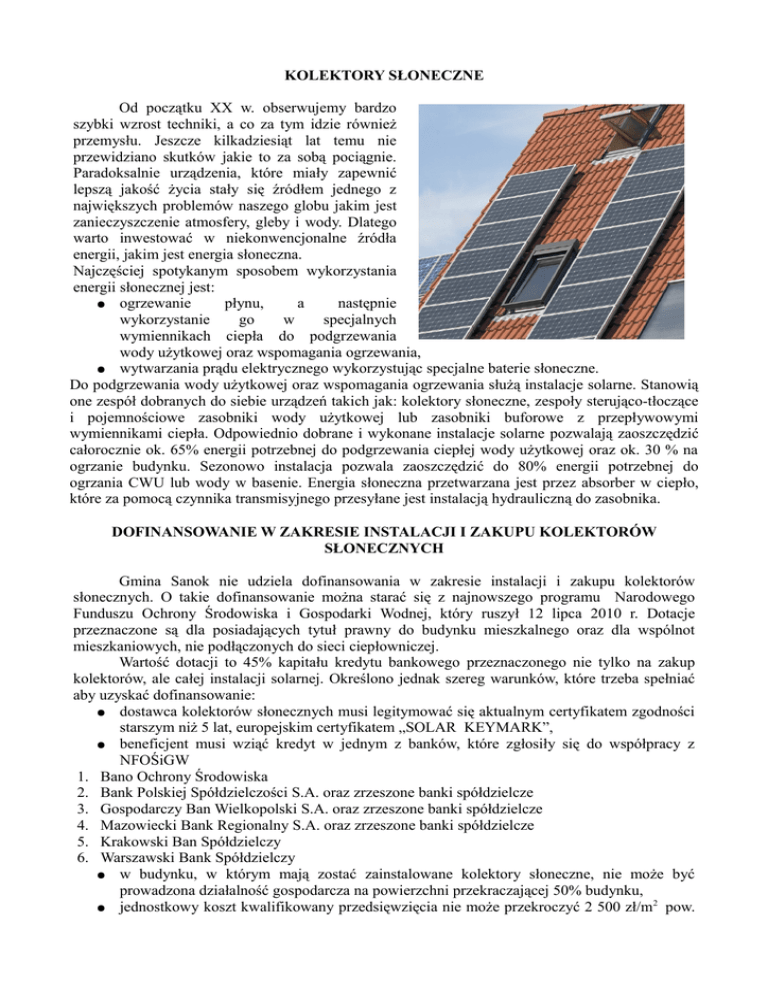 KOLEKTORY SŁONECZNE Od początku XX w. obserwujemy bardzo szybki wzrost techniki, a co za tym idzie również przemysłu. Jeszcze kilkadziesiąt lat temu nie przewidziano skutków jakie to za sobą pociągnie. Paradoksalnie urządzenia, które miały zapewnić lepszą jakość życia stały się źródłem jednego z największych problemów naszego globu jakim jest zanieczyszczenie atmosfery, gleby i wody. Dlatego warto inwestować w niekonwencjonalne źródła energii, jakim jest energia słoneczna. Najczęściej spotykanym sposobem wykorzystania energii słonecznej jest: ● ogrzewanie płynu, a następnie wykorzystanie go w specjalnych wymiennikach ciepła do podgrzewania wody użytkowej oraz wspomagania ogrzewania, ● wytwarzania prądu elektrycznego wykorzystując specjalne baterie słoneczne. Do podgrzewania wody użytkowej oraz wspomagania ogrzewania służą instalacje solarne. Stanowią one zespół dobranych do siebie urządzeń takich jak: kolektory słoneczne, zespoły sterująco-tłoczące i pojemnościowe zasobniki wody użytkowej lub zasobniki buforowe z przepływowymi wymiennikami ciepła. Odpowiednio dobrane i wykonane instalacje solarne pozwalają zaoszczędzić całorocznie ok. 65% energii potrzebnej do podgrzewania ciepłej wody użytkowej oraz ok. 30 % na ogrzanie budynku. Sezonowo instalacja pozwala zaoszczędzić do 80% energii potrzebnej do ogrzania CWU lub wody w basenie. Energia słoneczna przetwarzana jest przez absorber w ciepło, które za pomocą czynnika transmisyjnego przesyłane jest instalacją hydrauliczną do zasobnika. DOFINANSOWANIE W ZAKRESIE INSTALACJI I ZAKUPU KOLEKTORÓW SŁONECZNYCH Gmina Sanok nie udziela dofinansowania w zakresie instalacji i zakupu kolektorów słonecznych. O takie dofinansowanie można starać się z najnowszego programu Narodowego Funduszu Ochrony Środowiska i Gospodarki Wodnej, który ruszył 12 lipca 2010 r. Dotacje przeznaczone są dla posiadających tytuł prawny do budynku mieszkalnego oraz dla wspólnot mieszkaniowych, nie podłączonych do sieci ciepłowniczej. Wartość dotacji to 45% kapitału kredytu bankowego przeznaczonego nie tylko na zakup kolektorów, ale całej instalacji solarnej. Określono jednak szereg warunków, które trzeba spełniać aby uzyskać dofinansowanie: ● dostawca kolektorów słonecznych musi legitymować się aktualnym certyfikatem zgodności starszym niż 5 lat, europejskim certyfikatem „SOLAR KEYMARK”, ● beneficjent musi wziąć kredyt w jednym z banków, które zgłosiły się do współpracy z NFOŚiGW 1. Bano Ochrony Środowiska 2. Bank Polskiej Spółdzielczości S.A. oraz zrzeszone banki spółdzielcze 3. Gospodarczy Ban Wielkopolski S.A. oraz zrzeszone banki spółdzielcze 4. Mazowiecki Bank Regionalny S.A. oraz zrzeszone banki spółdzielcze 5. Krakowski Ban Spółdzielczy 6. Warszawski Bank Spółdzielczy ● w budynku, w którym mają zostać zainstalowane kolektory słoneczne, nie może być prowadzona działalność gospodarcza na powierzchni przekraczającej 50% budynku, 2 ● jednostkowy koszt kwalifikowany przedsięwzięcia nie może przekroczyć 2 500 zł/m pow. ● ● zainstalowanych kolektorów słonecznych budynek nie może być zasilany w energię cieplną w miejskiej sieci cieplnej instalację może wykonać osoba legitymująca się odpowiednimi uprawnieniami. W jaki sposób ubiegać się o dofinansowanie: KROK 1 Należy wybrać odpowiedni zestaw solarny. Warto skonsultować się z odpowiednią firmą instalacyjną, bądź doradcą technicznym sklepu, który pomoże dobrać optymalny system solarny. KROK 2 Należy zgłosić się do odpowiedniego banku w celu wypełnienia wniosku o: udzieleniu kredytu na zakup i montaż instalacji solarnej, dopłatę z NFOŚiGW na spłatę 45% kapitału kredytowego (Należy zabrać ze sobą następujące dokumenty: dowód osobisty, akt notarialny lub inny dokument potwierdzający prawo do nieruchomości, zaświadczenie o zarobkach, a w przypadku rencistów lub emerytów dokumenty potwierdzające prawo do świadczenia. Dokumenty takie jak projekt budowlano techniczny, certyfikaty kolektorów dotyczące zgodności z normami europejskimi oraz certyfikaty Solar Keymark będą przekazane podczas podpisywania umowy przedwstępnej z odpowiednią firmą zajmującą się instalacją kolektorów słonecznych. Należy podpisać umowę z wykonawcą systemu. Wykonawca realizuje cały projekt bezgotówkowo i po zakończeniu inwestycji przekazuje niezbędne dokumenty do otrzymania dopłaty. Aby otrzymać dopłatę musi zostać przeprowadzony odbiór techniczny instalacji przez uprawnionego do tego wykonawcę lub inspektora nadzoru budowlanego. KROK 3 Należy pilnować terminów i poprawności dokumentów. Wszelkie certyfikaty systemu oraz wykonawcy muszą być zgodne z wytycznymi Funduszu i Banku. Termin podpisania umowy z wykonawcą musi być późniejszy niż data złożenia wniosku o kredyt i dopłatę. Termin odbioru instalacji musi być późniejszy niż data zawarcia umowy kredytowej z bankiem. Wytyczne dot. udzielania kredytu na kolektory słoneczne z Banku Ochrony Środowiska znajdują się na stronie internetowej BOŚ: http://www.bosbank.pl/?page=Sloneczny_EkoKredyt Możliwe jest również uzyskanie dofinansowania z EkoFunduszu. Dofinansowanie dotyczy projektów, w których przewiduje się wyłącznie instalację kolektorów słonecznych (płaskich lub próżniowych) wraz z niezbędną instalacją. Wnioski mogą dotyczyć zarówno kolektorów na istniejących budynkach, jak również nowobudowanych. Dopłata do tego rodzaju projektów wynosi 600 zł/m2 powierzchni czynnej kolektora. Dopłata ta nie może być niższa od 50 000 zł co oznacza, że wniosek powinien dotyczyć instalacji wynoszącej co najmniej 80 m2 W jaki sposób ubiegać się o dofinansowanie: Inwestor składa w EkoFunduszu wniosek o dotację. Specjaliści EkoFunduszu sprawdzają stronę techniczną i ekonomiczną wniosku, po czym Zarząd Fundacji podejmuje decyzj
