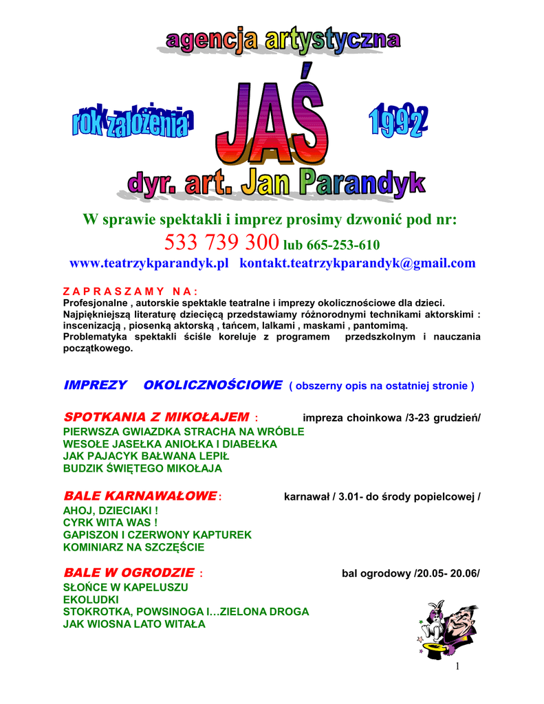 W sprawie spektakli i imprez prosimy dzwonić pod nr: 533 739 300 lub 665-253-610 www.teatrzykparandyk.pl [email protected] ZAPRASZAMY NA: Profesjonalne , autorskie spektakle teatralne i imprezy okolicznościowe dla dzieci. Najpiękniejszą literaturę dziecięcą przedstawiamy różnorodnymi technikami aktorskimi : inscenizacją , piosenką aktorską , tańcem, lalkami , maskami , pantomimą. Problematyka spektakli ściśle koreluje z programem przedszkolnym i nauczania początkowego. IMPREZY OKOLICZNOŚCIOWE ( obszerny opis na ostatniej stronie ) SPOTKANIA Z MIKOŁAJEM : impreza choinkowa /3-23 grudzień/ PIERWSZA GWIAZDKA STRACHA NA WRÓBLE WESOŁE JASEŁKA ANIOŁKA I DIABEŁKA JAK PAJACYK BAŁWANA LEPIŁ BUDZIK ŚWIĘTEGO MIKOŁAJA BALE KARNAWAŁOWE : karnawał / 3.01- do środy popielcowej / AHOJ, DZIECIAKI ! CYRK WITA WAS ! GAPISZON I CZERWONY KAPTUREK KOMINIARZ NA SZCZĘŚCIE BALE W OGRODZIE : bal ogrodowy /20.05- 20.06/ SŁOŃCE W KAPELUSZU EKOLUDKI STOKROTKA, POWSINOGA I…ZIELONA DROGA JAK WIOSNA LATO WITAŁA 1 AKTUALNY REPERTUAR MĄDRY MIŚ PO SZKODZIE Zbyś jest bystrym i rezolutnym misiem, ale kiedy jest sam w domu i się nudzi…No właśnie, wtedy rozum Zbysia zasypia, a Zbyś ma różne „genialne” pomysły : Może pojeździ rowerem po ulicy? A może zajrzy do domowej apteczki, a potem włączy żelazko i wyprasuje tacie koszulę? A może zaprosi do domu pana, którego spotkał na podwórku? Na szczęście ktoś czuwa nad misiem-Aniołek Stróż i dzieci z widowni. Może, zanim bajka się skończy, nauczą Zbysia jak unikać niebezpieczeństw. Spektakl oswaja dzieci z sytuacjami potencjalnie dla nich groźnymi i uczy jak ich unikać. BAJ I BAJKOLUDKI Młoda bohaterka, znudzona oglądaniem telewizji , spotyka Baja(Ducha Teatru).Czarodziej wciąga ją i widzów do zabawy. Zaprasza na scenę czworo dzieci i zamienia je w Akustyka, Maszynistę, Suflera i Rekwizytora. Razem tworzą spektakl oparty na klasyce literatury dziecięcej – tekstach Tuwima i Brzechwy. Dzięki przedstawieniu młodzi widzowie zaglądają w kulisy teatru. Poznają różnorodne techniki aktorskie : pantomimę, inscenizację, piosenkę aktorską, maski, lalki. Dowiadują się, jaką drogę przebywa tekst, zanim stanie się spektaklem. Wspólnie z aktorami tworzą magię teatru. TATO, CO TY NA TO ? Między ojcem a córką dochodzi do kłótni : Julia nie chce iść na urodziny do Lu-ling, Chinki, którą bardzo lubi, ale znajomości z którą wstydzi się przed innymi dziećmi. Emocje sprawiają, że dziewczynka mówi tacie – artyście , jakie przykre są dla niej lekcje śpiewu i gry na pianinie. Kiedy okazuje się, że tata czytał jej pamiętnik Julia buntuje się, ucieka z domu i... przenosi się do czarodziejskiego lasu. Odkrywa w sobie miłość do zwierząt i to, że potrafi im pomóc w potrzebie. Tymczasem dobry duszek lasu, Czarodziejskie Licho, używając miłości, robi wszystko aby ojciec i córka zrozumieli się. Sztuka broni PRAW DZIECKA pokazuje, że ma ono, tak jak dorosły, prawo do swoich marzeń, zainteresowań, sekretów. Mówi o tolerancji; uczy, aby w kontaktach z innymi kierować się sercem, a nie stereotypami i uprzedzeniami. ABY ZMĄDRZAŁY ŻABY. Mała żabka, jak to zwykle w bajkach bywa, chce być królewną. Ale żadna z postaci przysyłanych przez Bajkopisarza, mimo ich usilnych starań, nie potrafi spowodować w niej przemiany. Żabka bowiem odrzuca miłość( np. bezdomnego psa ).Bohaterka powoli odkrywa, że zamieni się w CZŁOWIEKA dopiero wtedy, gdy obdarzy kogoś uczuciem. Ta zabawna, a jednocześnie wzruszająca historia uczy, że w miłości ważniejsze jest dawanie niż branie : kochaj, a będziesz kochany. ZDROWO I WESOŁO Ania całymi godzinami tkwi przed telewizorem, bezmyślnie przełączając kanały. Nie chce jeść nic oprócz chrupek, zapomina wyjść z psem na spacer, ciągle grymasi, dąsa się... Pewnego razu, gdy zmęczona płaczem zasypia, w jej śnie pojawia się doktor Zdrówko. Przy pomocy czworga dzieci z widowni – Dietetyka, Sportowca, Higienisty, i Optymisty, próbuje on wypędzić z Ani obżartucha i smutasa. Tematyka spektaklu to szeroko rozumiana higiena ciała i umysłu. Sztuka promuje zdrowy styl życia : właściwe żywienie, kontakt z przyrodą, higienę, uśmiech i pozytywne myślenie. JAJKO, CZY KURA ? Sędziwy krasnoludek Borówka uważa dzieci za kochane, słodkie istoty, które jednak nie potrafią samodzielnie myśleć. Poziomka, jego uczennica, jest jednak innego zdania. Dlatego proponuje turniej między misiem Gapiszonem a papugą Arą, głównymi bohaterami spektaklu. Aktorzy odgrywają kilka scenek rodzajowych, np.: dziewczynka za dużą sumę sprzedaje swojego pieska. Ara twierdzi, że zrobiła dobry interes, Gapcio , że zdradziła przyjaciela. Kto ma rację? O tym decyduje trzyosobowe, wybrane spośród dzieci jury. Historia ta mówi o tym, że dziecko, jeśli tylko da mu się taką szansę, potrafi być uważnym obserwatorem, podejmować samodzielnie decyzje i dokonywać trafnych wyborów : odpowiadać na pytania, jakie stawia przed nim życie. 3 LEŚNE S. O. S. ! Zwykły, polski las...A w nim niezwykłe stwory : Ekoludek i Nimfa Wodna. Do lasu wjeżdżają samochodem wandale – śmiecą, płoszą zwierzęta, niszczą wszystko wokół. Ekoludek wyjaśnia dzieciom, skąd biorą się takie zachowania( tu seria kabaretowych scenek, opisujących ludzkie wady). W finale spektaklu dzieci wspólnie z aktorami sprzątają las. Spektakl promuje zachowania proekologiczne. CZARODZIEJSKI KONCERT ŻYCZEŃ Dwoje bohaterów znajduje na leśnej polanie czarodziejski kamyk, który umożliwia rozumienie mowy zwierząt. Teraz wraz z dziećmi mają możliwość poznać życie przyrody, język zwierząt, przejawiający się ruchem, dźwiękiem, mową ciała, tańcem. Jednocześnie kamyk umożliwia zwierzętom kontakt z ludźmi. Mogą powiedzieć, co złego spotyka je ze strony ludzi., dlaczego ginie przyroda. Dzieci, wraz z bohaterami zas