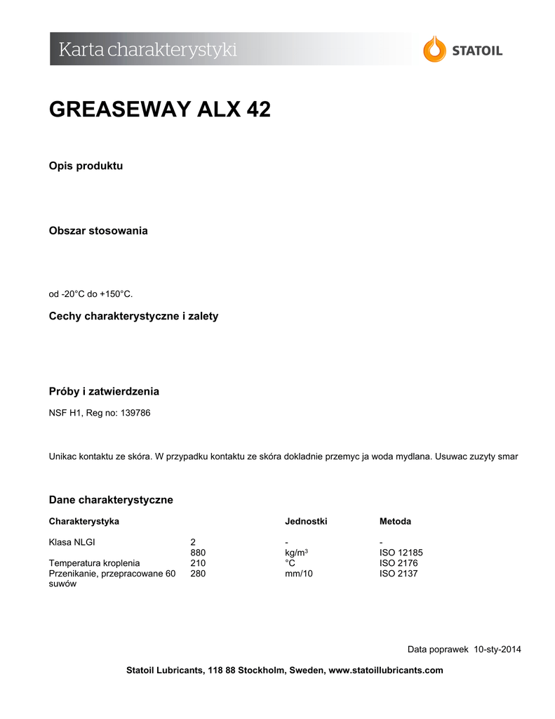 GREASEWAY ALX 42 Opis produktu Obszar stosowania od -20°C do +150°C. Cechy charakterystyczne i zalety Próby i zatwierdzenia NSF H1, Reg no: 139786 Unikac kontaktu ze skóra. W przypadku kontaktu ze skóra dokladnie przemyc ja woda mydlana. Usuwac zuzyty smar Dane charakterystyczne Charakterystyka Klasa NLGI Temperatura kroplenia Przenikanie, przepracowane 60 suwów 2 880 210 280 Jednostki Metoda kg/m3 °C mm/10 ISO 12185 ISO 2176 ISO 2137 Data poprawek 10-sty-2014 Statoil Lubricants, 118 88 Stockholm, Sweden, www.statoillubricants.com