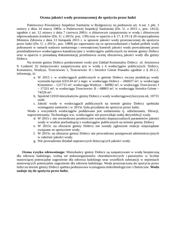 Ocena jakości wody przeznaczonej do spożycia przez ludzi Państwowy Powiatowy Inspektor Sanitarny w Bydgoszczy na podstawie art. 4 ust. 1 pkt. 1 ustawy z dnia 14 marca 1985r. o Państwowej Inspekcji Sanitarnej (Dz. U. z 2015 r., poz. 1412), zgodnie z art. 12 ustawy z dnia 7 czerwca 2001r. o zbiorowym zaopatrzeniu w wodę i zbiorowym odprowadzaniu ścieków (Dz. U. z 2015r. poz. 139) oraz w oparciu o § 17, § 19 i § 20 rozporządzenia Ministra Zdrowia z dnia 13 listopada 2015 r. w sprawie jakości wody przeznaczonej do spożycia przez ludzi (Dz. U. z 2015r., poz. 1989) po zapoznaniu się ze sprawozdaniami z badań próbek wody pobranymi w ramach nadzoru sanitarnego i wewnętrznej kontroli jakości wody prowadzonej przez przedsiębiorstwo wodociągowo-kanalizacyjne z wodociągów publicznych na terenie gminy Dobrcz oraz w oparciu o posiadaną dokumentację przedstawia ocenę obszarową jakości wody dla gminy Dobrcz. Na terenie gminy Dobrcz producentem wody jest Zakład Komunalny Dobrcz ul. Jesionowa 9. Ludność 32 miejscowości zaopatrywana jest w wodę z 6 wodociągów publicznych: Dobrcz, Kotomierz, Wudzyn, Trzeciewiec I, Trzeciewiec II i Strzelce Górne Ponadto zgodnie z § 20.2.2. informuję, iż: a. W 2015 r. w wodociągach publicznych w gminie Dobrcz roczna produkcja wody wynosiła łącznie 633134 m³ z tego: w wodociągu Dobrcz – 266027 m³, w wodociągu Kotomierz – 121715 m³, wodociągu Wudzyn – 84982 m³, w wodociągu Trzeciewiec I – 17321 m³, w wodociągu Trzeciewiec II – 68863 m³, w wodociągu Strzelce Górne – 74226 m³. b. Spośród 11010 mieszkańców gminy Dobrcz z wody wodociągowej korzysta ok. 10731 osób. c. Jakość wody w wodociągach publicznych na terenie gminy Dobrcz spełniała wymagania sanitarne i w 2015r. była przydatna do spożycia przez ludzi. Woda z wszystkich wodociągów poddawana jest uzdatnianiu tj. odżelazianiu, filtracji, napowietrzaniu. Technologia ww. wodociągów nie przewiduje stałej dezynfekcji wody. d. W 2015 r. nie stwierdzono przekroczeń wartości dopuszczalnych parametrów jakości wody w wodzie pochodzącej z wodociągów publicznych na terenie gminy Dobrcz e. W 2015r. na obszarze gminy Dobrcz nie zostały zgłoszone reakcje niepożądane związane ze spożyciem wody. f. W 2015r. na obszarze gminy Dobrcz nie prowadzono postępowań administracyjnych w zakresie jakości wody. g. Nie prowadzono działań naprawczych dotyczących jakości wody. Ocena ryzyka zdrowotnego: Mieszkańcy gminy Dobrcz są zaopatrywani w wodę bezpieczną dla zdrowia ludzkiego, wolną od mikroorganizmów chorobotwórczych i pasożytów w liczbie stanowiącej potencjalne zagrożenie dla zdrowia ludzkiego oraz wszelkich substancji w stężeniach stanowiących potencjalne zagrożenie dla zdrowia ludzkiego. Woda przeznaczona do spożycia przez ludzi na terenie gminy Dobrcz spełnia podstawowe wymagania mikrobiologiczne i chemiczne. Woda nadaje się do spożycia przez ludzi.