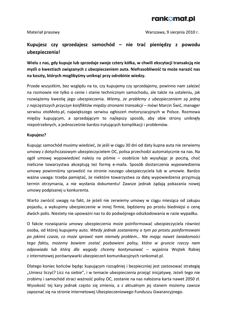 Materiał prasowy Warszawa, 9 sierpnia 2010 r. Kupujesz czy sprzedajesz samochód – nie trać pieniędzy z powodu ubezpieczenia! Wielu z nas, gdy kupuje lub sprzedaje swoje cztery kółka, w chwili ekscytacji transakcją nie myśli o kwestiach związanych z ubezpieczeniem auta. Niefrasobliwość ta może narazić nas na koszty, których moglibyśmy uniknąć przy odrobinie wiedzy. Przede wszystkim, bez względu na to, czy kupujemy czy sprzedajemy, powinno nam zależeć na rozmowie nie tylko o cenie i stanie technicznym samochodu, ale także na ustaleniu, jak rozwiążemy kwestię jego ubezpieczenia. Wiemy, że problemy z ubezpieczeniem są jedną z najczęstszych przyczyn konfliktów między stronami transakcji – mówi Marcin Świć, manager serwisu otoMoto.pl, największego serwisu ogłoszeń motoryzacyjnych w Polsce. Rozmowa między kupującym, a sprzedającym to najlepszy sposób, aby obie strony uniknęły niepotrzebnych, a jednocześnie bardzo irytujących komplikacji i problemów. Kupujesz? Kupując samochód musimy wiedzieć, że jeśli w ciągu 30 dni od daty kupna auta nie zerwiemy umowy z dotychczasowym ubezpieczycielem OC, polisa przechodzi automatycznie na nas. Na ogół umowę wypowiedzieć należy na piśmie – osobiście lub wysyłając je pocztą, choć nieliczne towarzystwa akceptują też formę e-maila. Sposób dostarczenia wypowiedzenia umowy powinniśmy sprawdzić na stronie naszego ubezpieczyciela lub w umowie. Bardzo ważna uwaga: trzeba pamiętać, że niektóre towarzystwa za datę wypowiedzenia przyjmują termin otrzymania, a nie wysłania dokumentu! Zawsze jednak żądają pokazania nowej umowy podpisanej u konkurenta. Warto zwrócić uwagę na fakt, że jeżeli nie zerwiemy umowy w ciągu miesiąca od zakupu pojazdu, a wykupimy ubezpieczenie w innej firmie, będziemy po prostu biedniejsi o cenę dwóch polis. Niestety nie upoważni nas to do podwójnego odszkodowania w razie wypadku. O fakcie rozwiązania umowy ubezpieczenia może poinformować ubezpieczyciela również osoba, od której kupujemy auto. Wtedy jednak zostaniemy o tym po prostu poinformowani po jakimś czasie, co może sprawić nam niemały problem… Nie mając nawet świadomości tego faktu, możemy bowiem zostać pozbawieni polisy, która w gruncie rzeczy nam odpowiada lub którą dla wygody chcemy kontynuować – wyjaśnia Wojtek Rabiej z internetowej porównywarki ubezpieczeń komunikacyjnych rankomat.pl. Dlatego koniec końców będąc kupującym rozsądniej i bezpieczniej jest zastosować strategię „Umiesz liczyć? Licz na siebie”, i w temacie ubezpieczenia przejąć inicjatywę. Jeżeli tego nie zrobimy i samochód straci ważność polisy OC, zostanie na nas nałożona karta nawet 2050 zł. Wysokość tej kary jednak często się zmienia, a z aktualnym jej stanem możemy zawsze zapoznać się na stronie internetowej Ubezpieczeniowego Funduszu Gwarancyjnego. Sprzedajesz? Jeżeli szykujemy się do sprzedaży auta i chcemy odzyskać cenę ubezpieczenia za okres, w którym to kupujący będzie użytkował samochód, musimy to z nim ustalić jeszcze przed podpisaniem umowy. Mamy wtedy dwie możliwości: albo doliczyć kupującemu odpowiednią część ceny ubezpieczenia do ceny auta (jeśli ten wyraźnie oświadcza, że chce przejąć naszą polisę) albo pisemnie wypowiedzieć umowę ubezpieczenia (jeśli nie chce on korzystać z naszej polisy). Gdy kupujący nie chce naszego ubezpieczyciela to my jako sprzedający musimy dostarczyć odpowiednie pismo do ubezpieczyciela w ciągu 30 dni od dnia sprzedaży. Jeśli tak się nie stanie, nasza polisa zostanie przedłużona automatycznie kupującemu, a my stracimy możliwość odebrania pieniędzy. Sprzedając samochód musimy w ciągu 30 dni od sprzedaży poinformować zakład ubezpieczeń o tym fakcie. W większości firm możemy to zrobić listownie lub faksem. To bardzo ważne, bo jeżeli tego nie zrobimy, a osoba, której sprzedaliśmy samochód w tym czasie zdąży spowodować wypadek, to my będziemy obciążeni kosztami. Oczywiście, jeśli udowodnimy ubezpieczycielowi, że w momencie wypadku to nie my byliśmy właścicielami auta, mamy szansę na uniknięcie poniesienia odpowiedzialności za nie swoją szkodę, no ale możemy być pewni, że to oznacza komplikacje, stracony czas i nerwy. Również do chwili powiadomienia towarzystwa ubezpieczeniowego o sprzedaży samochodu ponosimy solidarnie z kupującym odpowiedzialność za płacenie składki (gdy jedna strona zapłaci należność, drugą zwalnia to z konieczności zapłaty, ale odpowiedzialność w razie postępowania sądowego ponoszą już wspólnie). Sprzedając zatem samochód pofatygujmy się już w dniu transakcji do ubezpieczyciela, aby uniknąć nieprzyjemnych sytuacji. Warto wiedzieć, że jeżeli rozłożyliśmy składkę OC na raty, to z chwilą sprzedaży kończy się nasz obowiązek ich płacenia. Przechodzi on na nowego właściciela. A co z AC i innymi ubezpieczeniami? W momencie, gdy sprzedajemy samochód nasze AC wygasa – dla nas oznacza to prawo do otrzymania zwrotu pieniędzy za czas, w którym nie będziemy już właścicielami auta. Nie zostawiajmy ubezpieczycielowi niepotrzebnie naszych pieniędzy i postarajmy się o zwrot! W tym celu należy osobiście udać się do towarzystwa ubezpieczeniowego wraz z wnioskiem o zwrot składki. Takie same zasady dotyczą np. ubezpieczenia NNW oraz pakietów. Jeszcze jedna rada Warto wiedzieć, że wszystkie zasady dotyczące przejęcia ubezpieczenia przy transakcji kupna-sprzedaży zapisane są w umowie ubezpieczeniowej – przypomina Wojtek Rabiej z rankomat.pl. *** Serwis rankomat.pl jest niezależną porównywarką ubezpieczeniową, która w wygodny i prosty sposób pozwala w ciągu kilku minut porównać oferty wielu ubezpieczycieli. Dzięki zastosowanemu mechanizmowi działania i rozwiązaniom technicznym, użytkownicy rankomat.pl mają możliwość dokonania szybkiego wyboru najtańszego bądź najbardziej
