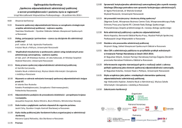 Ogólnopolska Konferencja „Społeczna odpowiedzialność administracji publicznej a wzrost przedsiębiorczości i poziomu życia w regionach” 12:00 Sprawność instytucjonalna administracji samorządowej jako czynnik rozwoju lokalnego (Dlaczego potrzebna nam sprawnie funkcjonująca administracja?). dr Agata Pierścieniak, dr Mariola Grzebyk Wydział Ekonomii, Uniwersytet Rzeszowski 12:15 Jak prowadzić merytoryczny i skuteczny dialog społeczny? Urząd Marszałkowski Województwa Podkarpackiego – 26 października 2016 r. 9:00 Otwarcie konferencji 9:20 Znaczenie społecznej odpowiedzialności biznesu w zarządzaniu strategicznym urzędów administracji publicznej – wybrane aspekty. Stanisław Wasilewski – Dyrektor Oddziału Zakładu Ubezpieczeń Społecznych w Rzeszowie 9:35 Dialog, partycypacja i partnerstwo – szansa czy obciążenie dla administracji publicznej? prof. nadzw. dr hab. Agnieszka Pawłowska Instytut Nauk o Polityce, Uniwersytet Rzeszowski 9:55 Współudział mieszkańców w podnoszeniu jakości usług świadczonych przez administrację samorządową - wybrane aspekty. dr hab. prof. UR Wiesława Kuźniar, dr Lidia Kaliszczak, dr Wiesław Szopiński Wydział Ekonomii, Uniwersytet Rzeszowski 10:15 Ramy prawne społecznej odpowiedzialności administracji publicznej. dr Kamilla Kurczewska, Katedra Nauk o Administracji, Wyższa Szkoła Informatyki i Zarządzania z siedzibą w Rzeszowie 10:30 Wyzwania w zakresie wdrażania koncepcji społecznej odpowiedzialności stojące przed JST. dr Jolanta Stec-Rusiecka Katedra Przedsiębiorczości, Zarządzania i Ekoinnowacyjności, Politechnika Rzeszowska 10:45 Odpowiedzialne podejście do prowadzenia działalności - perspektywa krajowa i europejska. Jacqueline Kacprzak, Radca Ministra, Biuro Ministra, Ministerstwo Rozwoju 11:05 Stała troska o pogłębianie zaufania obywateli do organów państwa. Jacek Cichy, Dyrektor Urzędu Kontroli Skarbowej w Rzeszowie 11:20 Etyka służby publicznej jako fundament kultury organizacyjnej w administracji skarbowej. Marzena Cypryś Rałowska, Izba Skarbowa w Rzeszowie 11:35 Przerwa Zbigniew Żurek, Wiceprezes Business Centre Club, Wiceprzewodniczący Rady Ochrony Pracy przy Sejmie RP, Członek Rady Dialogu Społecznego Przewodniczący Zespołu problemowego ds. rozwoju dialogu społecznego 12:30 Rola administracji publicznej a społeczna odpowiedzialność. Maria Kopacka, Kierownik Oddział Rynku Pracy, Wydział Polityki Społecznej Podkarpacki Urząd Wojewódzki w Rzeszowie 12:40 Służebna rola pracownika administracji publicznej. Wojciech Dyląg, Zakład Ubezpieczeń Społecznych Oddział w Rzeszowie 12:55 Idee CSR a administracja publiczna na przykładzie praktyk wdrożonych w Instytucie Pamięci Narodowej w latach 2013-2014. dr Bogusław Wójcik, Instytut Pamięci Narodowej Komisja Ścigania Zbrodni przeciwko Narodowi Polskiemu Oddział w Rzeszowie 13:20 Informowanie organów stanowiących gmin o realizacji zadań z zakresu polityki społecznej jako element społecznej odpowiedzialności samorządu. dr Bogusław Kotarba, Instytut Nauk o Polityce, Uniwersytet Rzeszowski 13:35 Etyka urzędnicza jako jeden z niezbędnych elementów społecznej odpowiedzialności administracji publicznej. mgr Aleksandra Kędzior, Katedra Nauk o Administracji, Wyższa Szkoła Informatyki i Zarządzania z siedzibą w Rzeszowie 13:50 Zakończenie konferencji Organizator Patronat honorowy Partnerzy