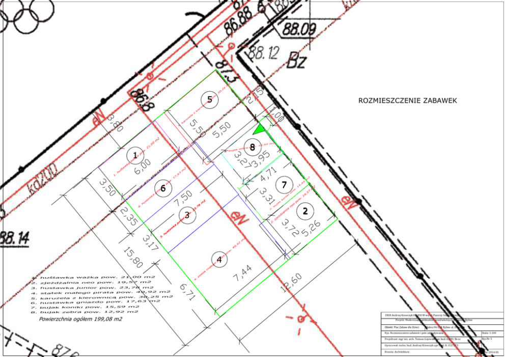 2 m . w o p 3 ,2 0 5 5 5 1 1 . h a śt u ka w a w a żk . ow p 2 ,0 1 0 . 6 h e la z ROZMIESZCZENIE ZABAWEK 2 m 8 . pow zebra ujak b . 8 6 a k w a t s u . z ru a k ą ic n w o r ie k o zd ia n g o p . w 1 7 ,6 3 12,9 2 2 m 2 m 7 8 7 3, 2 2 .. ow po p i ik n o k 2 m 7 . ja u b 3 3 . a k w a t s hu 1. huśtawka ważka pow. 21,00 m2 2. zjeżdżalnia neo pow. 19,57 m2 r or io ni un jju 2 . 4 k te a st o g łe a m 4 a ir p ta o p . w 4 9 ,9 2 . 2 m . w o p k ża d eż j z ia ln n eo 1 ,5 5 . w o p 9 7 ,5 9 1 2 m 2 2 m 3. hustawka junior pow. 23,78 m2 49,92 m2 4. statek małego pirata pow. 30,25 m2 . pow 5. karuzela z kierownicą 3 m2 17,6 . pow zdo gnia 6. hustawka 7. bujak koniki pow. 15,59 m2 8. bujak zebra pow. 12,92 m2 ZRIB Andrzej Krawczyk 01-390 W-wa ul. Puszczy Solskiej 1m20 Powierzchnia ogółem 199,08 m2 Projekt: Modernizacja oddziałów przedszkolnych w Gminie Rybno Obiekt: Plac Zabaw dla Dzieci Adres:94-514 Rybno ul. Długa11 Rys. Rozmieszczenie zabawek i pole oddzaływania Skala: 1:100 Projektant: mgr inż. arch. Tomasz Gajewski upr. bud. 62/91 Sk-ce Rys.Nr 3 Opracował: techn. bud. Andrzej Krawczyk upr. bud. St 1527/73 Branża: Architektura Data: 2014-05