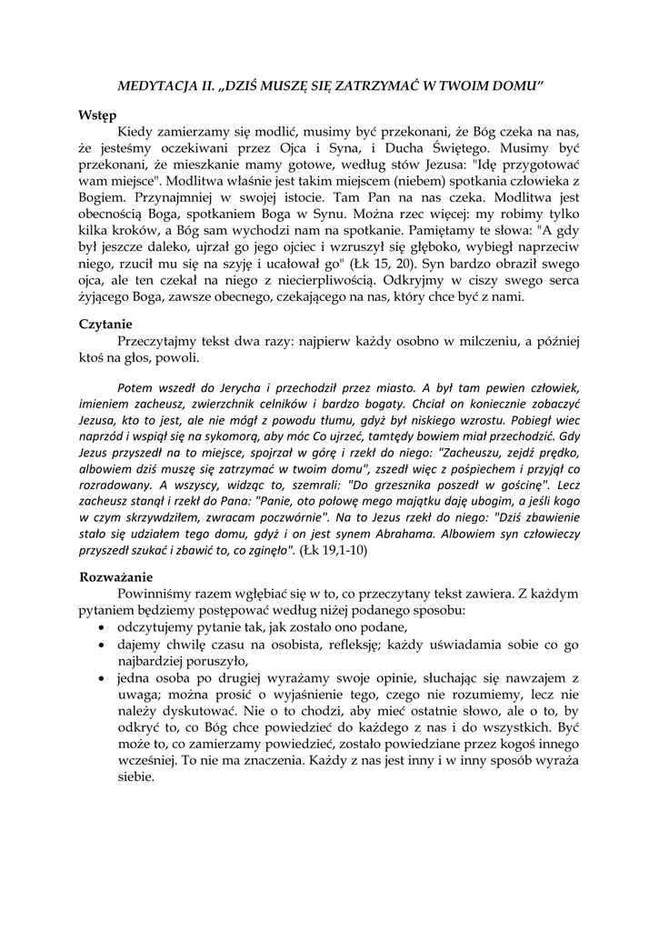 MEDYTACJA II. „DZIŚ MUSZĘ SIĘ ZATRZYMAĆ W TWOIM DOMU” Wstęp Kiedy zamierzamy się modlić, musimy być przekonani, że Bóg czeka na nas, że jesteśmy oczekiwani przez Ojca i Syna, i Ducha Świętego. Musimy być przekonani, że mieszkanie mamy gotowe, według stów Jezusa: "Idę przygotować wam miejsce". Modlitwa właśnie jest takim miejscem (niebem) spotkania człowieka z Bogiem. Przynajmniej w swojej istocie. Tam Pan na nas czeka. Modlitwa jest obecnością Boga, spotkaniem Boga w Synu. Można rzec więcej: my robimy tylko kilka kroków, a Bóg sam wychodzi nam na spotkanie. Pamiętamy te słowa: "A gdy był jeszcze daleko, ujrzał go jego ojciec i wzruszył się głęboko, wybiegł naprzeciw niego, rzucił mu się na szyję i ucałował go" (Łk 15, 20). Syn bardzo obraził swego ojca, ale ten czekał na niego z niecierpliwością. Odkryjmy w ciszy swego serca żyjącego Boga, zawsze obecnego, czekającego na nas, który chce być z nami. Czytanie Przeczytajmy tekst dwa razy: najpierw każdy osobno w milczeniu, a później ktoś na głos, powoli. Potem wszedł do Jerycha i przechodził przez miasto. A był tam pewien człowiek, imieniem zacheusz, zwierzchnik celników i bardzo bogaty. Chciał on koniecznie zobaczyć Jezusa, kto to jest, ale nie mógł z powodu tłumu, gdyż był niskiego wzrostu. Pobiegł wiec naprzód i wspiął się na sykomorą, aby móc Co ujrzeć, tamtędy bowiem miał przechodzić. Gdy Jezus przyszedł na to miejsce, spojrzał w górę i rzekł do niego: "Zacheuszu, zejdź prędko, albowiem dziś muszę się zatrzymać w twoim domu", zszedł więc z pośpiechem i przyjął co rozradowany. A wszyscy, widząc to, szemrali: "Do grzesznika poszedł w gościnę". Lecz zacheusz stanął i rzekł do Pana: "Panie, oto połowę mego majątku daję ubogim, a jeśli kogo w czym skrzywdziłem, zwracam poczwórnie". Na to Jezus rzekł do niego: "Dziś zbawienie stało się udziałem tego domu, gdyż i on jest synem Abrahama. Albowiem syn człowieczy przyszedł szukać i zbawić to, co zginęło". (Łk 19,1-10) Rozważanie Powinniśmy razem wgłębiać się w to, co przeczytany tekst zawiera. Z każdym pytaniem będziemy postępować według niżej podanego sposobu: • odczytujemy pytanie tak, jak zostało ono podane, • dajemy chwilę czasu na osobista, refleksję; każdy uświadamia sobie co go najbardziej poruszyło, • jedna osoba po drugiej wyrażamy swoje opinie, słuchając się nawzajem z uwaga; można prosić o wyjaśnienie tego, czego nie rozumiemy, lecz nie należy dyskutować. Nie o to chodzi, aby mieć ostatnie słowo, ale o to, by odkryć to, co Bóg chce powiedzieć do każdego z nas i do wszystkich. Być może to, co zamierzamy powiedzieć, zostało powiedziane przez kogoś innego wcześniej. To nie ma znaczenia. Każdy z nas jest inny i w inny sposób wyraża siebie. 1. Spróbujmy spojrzeć w serce Zacheusza, który był wielkim grzesznikiem. Spróbujmy postawić się w jego sytuacji, spróbujmy zrozumieć jego postawę wobec Jezusa i zobaczyć, czy choć trochę przypomina on nas. Co mnie najbardziej uderzyło w Zacheuszu: jego zachowanie, uczucia, czy jego słowa? Co myślę o ludziach, którzy nie pozwalali Zacheuszowi zobaczyć Jezusa i skrytykowali Pana za to, że poszedł do domu grzesznika? 2. Teraz rozważmy słowa i gesty Jezusa. Ten punkt jest bardzo ważny, ponieważ powinniśmy naśladować Jezusa w naszym codziennym życiu. Jak zaś będziemy to czynić, jeśli Go nie poznamy? Właśnie przez wymianę naszych poglądów, refleksji, odnośnie tego tekstu, możemy odkrywać miłość Jezusa żyjącego, który jest naszym przyjacielem. Co wywiera na mnie największe wrażenie w słowach i gestach Jezusa? 3. Ewangelia to żywa opowieść. Jezus jest Bogiem żywym, Bogiem zawsze obecnym, który mówi do nas. Jezus mówi do nas w tej chwili, tak jak mówił do Zacheusza. Słuchajmy Go w ciszy naszego serca. On mówi do nas: Filipie, Anno (umieśćcie tutaj swoje imię), zejdź szybko, ponieważ dziś muszę zatrzymać się w twoim domu. Skąd mam zejść na dół, aby Jezus mógł przyjść i zostać w moim domu? Mam odejść od obojętności, z jaka odnoszę się do innych? Od lenistwa w spełnianiu swoich obowiązków? Co czuję, kiedy dowiaduje się, że Jezus chce zostać ze mna? Jak Mu odpowiadam? 4. Ewangelia stawia wymagania. Musimy być dla innych tym, kim był Jezus dla ludzi, tym, kim Jezus jest dzisiaj dla mnie. Musimy użyczyć Mu naszych ust, serc, rak, całych siebie, abyśmy stali się tymi, przez których On zbliża się do innych. Oto czego On sobie życzy. Kto spośród tych, którzy mnie otaczają oczekuje ode mnie, tak jak Zacheusz! oczekiwał od Jezusa, że zatrzymam się, podniosę wzrok i popatrzę,, pokocham, zaproszę, do siebie; innymi słowy: że obdarzę przyjaźnią? 5. Przygotowujemy odpowiedź. Kiedy skończy się czas refleksji, pozostawiamy chwilę ciszy, aby każdy mógł odpowiedzieć" na pytanie: co z tego wszystkiego, co zostało dotychczas przemyślane, z tego wszystkiego co czułem, usłyszałem, zrozumiałem, co najbardziej mnie poruszyło? Po krótkiej chwili ciszy każdy odpowiada. Odpowiadamy Jezusowi naszą modlitwa. Każdy z nas układa modlitwę, kierując ją bezpośrednio do Jezusa, który jest tutaj obecny, który dziś do mnie przemówił i który czeka na moją odpowiedź. Słuchajmy z uwagą modlitw innych, bo być może wypowiedzą oni coś, czego ja też bym chciał. Wtedy mogę to jeszcze raz powtórzyć. 6. Zakończenie. Jesteśmy uspokojeni i wyciszeni, Jezus jest wśród nas obecny. Możemy włączyć cichą muzykę. Skoro Zacheusz był radosny i szczęśliwy z obecności Jezusa w swoim domu, i nawet wyprawił ucztę, my również możemy przygotować przyjęcie.