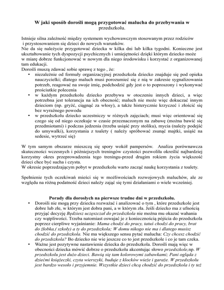 W jaki sposób dorośli mogą przygotować malucha do przebywania w przedszkolu. Istnieje silna zależność między systemem wychowawczym stosowanym przez rodziców i przystosowaniem się dzieci do nowych warunków. Nie da się należycie przygotować dziecka w kilka dni lub kilka tygodni. Konieczne jest ukształtowanie tych dyspozycji psychicznych i umiejętności dzięki którym dziecko może w miarę dobrze funkcjonować w nowym dla niego środowisku i korzystać z organizowanej tam edukacji. Dorośli muszą zdawać sobie sprawę z tego , że: • niezależnie od formuły organizacyjnej przedszkola dziecko znajduje się pod opieka nauczycielki; dlatego maluch musi porozumieć się z nią w zakresie sygnalizowania potrzeb, reagować na swoje imię, podchodzić gdy jest o to poproszony i wykonywać prościutkie polecenia • w każdym przedszkolu dziecko przebywa w otoczeniu innych dzieci, a więc potrzebna jest tolerancja na ich obecność; maluch nie może więc dokuczać innym dzieciom (np. gryźć, ciągnąć za włosy), a także histerycznie krzyczeć i złościć się bez wyraźnego powodu • w przedszkolu dziecko uczestniczy w różnych zajęciach; musi więc orientować się czego się od niego oczekuje w czasie przeznaczonym na zabawę (można bawić się przedmiotami) i podczas jedzenia (trzeba usiąść przy stoliku), mycia (należy podejść do umywalki), korzystania z toalety ( należy spróbować zsunąć majtki, usiąść na sedesie, wytrzeć się) W tym samym obszarze mieszczą się spory wokół pampersów. Analiza porównawcza skuteczności wczesnych i późniejszych treningów czystości pozwoliła określić najbardziej korzystny okres przeprowadzenia tego treningu-przed drugim rokiem życia większość dzieci chce być sucha i czysta. W okresie poprzedzającym pobyt w przedszkolu warto zacząć naukę korzystania z toalety. Spełnienie tych oczekiwań mieści się w możliwościach rozwojowych maluchów, ale ze względu na różną podatność dzieci należy zająć się tymi działaniami o wiele wcześniej. • • Porady dla dorosłych na pierwsze trudne dni w przedszkolu. Dorośli nie mogą przy dziecku rozważać i analizować o tym , które przedszkole jest dobre lub złe, w którym jest dobra pani, a w którym zła. Jeśli dziecko ma z ufnością przyjąć decyzję Będziesz uczęszczał do przedszkola nie można mu okazać wahania czy wątpliwości. Trzeba natomiast oswajać je z koniecznością pójścia do przedszkola poprzez cierpliwe wyjaśnianie: Mama chodzi do pracy, tatuś chodzi do pracy, brat do żłobka,( szkoły) a ty do przedszkola; W domu nikogo nie ma i dlatego musisz chodzić do przedszkola. Nie ma większego sensu pytać malucha: Czy chcesz chodzić do przedszkola? Bo dziecko nie wie jeszcze co to jest przedszkole i co je tam czeka. Ważne jest pozytywne nastawienie dziecka do przedszkola. Dorośli mają więc w obecności dziecka mówić dobrze o przedszkolu akcentując słowo przedszkole,np. W przedszkolu jest dużo dzieci. Bawią się tam kolorowymi zabawkami; Pani ogląda z dziećmi książeczki, czyta wierszyki, buduje z klocków wieże i garaże. W przedszkolu jest bardzo wesoło i przyjemnie. Wszystkie dzieci chcą chodzić do przedszkola i ty też • • • • tam będziesz chodził. Nie może być tak , że dorośli nie radząc sobie z dzieckiem straszą przedszkolem czy nauczycielką. W pierwszych dniach pobytu dziecka w przedszkolu należy szczególnie zadbać o ubranie dziecka. Ma być wygodne (nie za ciasne), niewymagające zapinania guzików lub pasków przyspodniach, zasuwania suwaków, sznurowania butów na kokardki. Nie są to drobiazgi, bo nakładanie i zdejmowanie ubrania może skutecznie pomagać lub przeszkadzać dziecku w samodzielnym funkcjonowaniu. Nie sposób przecenić roli wspólnego z dzieckiem przygotowania rzeczy, które ma zabrać do przedszkola: piżama, kapcie,ulubiona maskotka, która pomoże mu przetrwać ten trudny czas. Chodzi o towarzyszące temu rozmowy-oswajają dziecko z myślą, że jutro pójdzie do przedszkola i nic złego mu się nie stanie. W trakcie tej rozmowy trzeba powiedzieć dziecku, kto je zaprowadzi do przedszkola i kto odbierze Trzeba unikać przyprowadzania dziecka do przedszkola w ostatniej chwili. Zdenerwowanie towarzyszące pośpiechowi sprawia, że dorośli zamiast uśmiechać się do dziecka napominają: Szybciej! Nie marudź! Nerwowo zdejmują ubranie z dziecka i układają je w szafce, a potem dziwią się i narzekają, że maluch nie podejmuje samodzielnie takich działań. Wszystko to wprowadza niepokój , który udziela się dziecku. Pożegnanie z dzieckiem ma być czułe, ale krótkie. Nie należy tez pytać dziecka: Czy mogę już iść? Natomiast trzeba zapewnić , że się po nie przyjdzie. Ponieważ dziecko nie ma poczucia czasu informacje typu ; Zaraz po ciebie przyjdę; Tylko chwilkę pobędziesz i zaraz wrócę...nie mają sensu. Lepiej przytulić dziecko, zapewnić Przyjdę po ciebie bo cię kocham. Najlepiej określić wydarzenie, po którym będzie mogło wrócić do domu: Przyjdę po ciebie po leżakowaniu; Jak zjesz podwieczorek będę na ciebie czekała w szatni. Bardzo ważne jest dotrzymywanie słowa. Daje ono dzieciom poczucie bezpieczeństwa i pewność, że rodzic przyjdzie. W trudnych dniach adaptacyjnych należy dziecku okazać więcej zainteresowania, miłości i czułości. Należy przytulać i chwalić. Nie należy jednak nagradzać poprzez kupowanie kolejnej zabawki. Trzymając dziecko na kolanach lepiej zapytać o jego samopoczucie: Co robiłeś dziś w przedszkolu? Z kim się bawiłeś? Jak się nazywa twój kolega? Lepiej nie zadawać pytań: Co dzisiaj jadłeś? Czy zjadłeś wszystko? Czy pani cię karmiła? Te pytania są ważne dla rodziców, nie dziecka- na nie odpowiada nauczycielka. Raz podjęta decyzja powinna być konsekwentnie realizowana, a trudne dni adaptacyjne trzeba zwyczajnie przetrzymać. Gdy teraz rodzice ulegną dziecko zapami