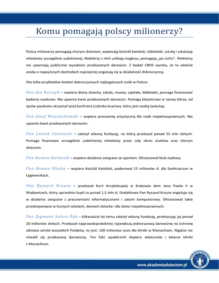 Komu pomagają polscy milionerzy? Polscy milionerzy pomagają chorym dzieciom, wspierają Kościół Katolicki, biblioteki, sztukę i edukację młodzieży szczególnie uzdolnionej. Niektórzy z nich unikają rozgłosu, pomagają „po cichu”. Niektórzy nie ujawniają publicznie wysokości przekazanych darowizn. Z badao CBOS wynika, że to właśnie osoby o najwyższych dochodach najczęściej angażują się w działalnośd dobroczynną. Oto kilka przykładów działao dobroczynnych najbogatszych osób w Polsce: Pan Jan Kulczyk – wspiera domy dziecka, szkoły, muzea, szpitale, biblioteki, pomaga finansowad badania naukowe. Nie ujawnia kwot przekazanych darowizn. Pomaga klasztorowi w Jasnej Górze, od ojców paulinów otrzymał tytuł konfratra (członka bractwa, który jest osobą świecką). Pan Józef Wojciechowski – wspiera pracownię artystyczną dla osób niepełnosprawnych. Nie ujawnia kwot przekazanych darowizn. Pan Leszek Czarnecki – założył własną fundację, na którą przekazał ponad 55 mln złotych. Pomaga finansowo szczególnie uzdolnionej młodzieży przez cały okres studiów oraz chorym dzieciom. Pan Roman Karkosik – wspiera działania związane ze sportem. Sfinansował klub żużlowy. Pan Roman Kluska – wspiera Kościół Katolicki, podarował 15 milionów zł. dla Sanktuarium w Łagiewnikach. Pan Ryszard Krauze – przekazał Kurii Arcybiskupiej w Krakowie dom Jana Pawła II w Wadowicach, który uprzednio kupił za ponad 1,5 mln zł. Dodatkowo Pan Ryszard Krauze angażuje się w działania związane z pracowniami informatycznymi i salami komputerowy. Sfinansował takie przedsięwzięcia w licznych szkołach, domach dziecka i dla dzieci niepełnosprawnych. Pan Zygmunt Solorz-Żak – kilkanaście lat temu założył własną fundację, przekazując jej ponad 20 milionów złotych. Przekazał najprawdopodobniej największą jednorazową darowiznę na ochronę zdrowia wśród wszystkich Polaków, to jest: 100 milionów euro dla kliniki w Monachium. Nigdzie nie chwalił się przekazaną darowiznę. Ten fakt upublicznili dopiero właściciele i lekarze kliniki z Monachium. Pani Dominika Kulczyk – Lubomirska (córka Jana Kulczyka) – prowadzi fundację zajmującą się ekologią i ochroną środowiska. Pani Grażyna Kulczyk – pomaga artystom i promuje ich sztukę. Jest mecenasem i sponsorem działao artystycznych. Stworzyła galerię Stary Browar w Poznaniu. Panie Bożena Walter i Aldona Wejchert (żona i córka Jana Wejcherta) – Pani Bożena kieruje pracami Fundacji złożonej przez firmę należącą do jej zmarłego męża. Pomaga ona ciężko chorym dzieciom, finansuje turnusy rehabilitacyjne, pomaga niepełnosprawnym, szpitalom, domom dziecka osobom starszym i samotnym. Obie Panie angażują się w działalnośd społeczną np. poprzez organizacje balów dobroczynnych. Pani Bożena jest współinicjatorem Nagrody Imienia Jana Wejcherta, którą Polska Rada Biznesu przyznaje osobom zasłużonym na polu ekonomicznym i społecznym. Państwo Hanna i Jarosław Przyborowscy – założyli swoją fundację. Pomagają niepełnosprawnym, samotnym matkom oraz osobom w trudnej sytuacji życiowej np. rodzinom wielodzietnym lub osobom starszym.