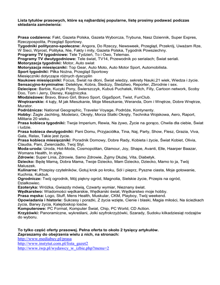 Lista tytułów prasowych, które są najbardziej popularne, listę prosimy podawać podczas składania zamówienia: Prasa codzienna: Fakt, Gazeta Polska, Gazeta Wyborcza, Trybuna, Nasz Dziennik, Super Expres, Rzeczpospolita, Przegląd Sportowy. Tygodniki polityczno-społeczne: Angora, Do Rzeczy, Newsweek, Przegląd, Przekrój, Uważam Rze, W Sieci, Wprost, Polityka, Nie, Fakty i mity, Gazeta Polska, Tygodnik Powszechny. Programy TV tygodniowe: Tele Tydzień, To i Owo, Telemax. Programy TV dwutygodniowe: Tele świat, TV14, Przewodnik po serialach; Świat seriali. Motoryzacja tygodniki: Motor, Auto swiat Motoryzacja miesięczniki: Top Gear, Auto Moto, Auto Motor Sport, Automobilista. Sport tygodniki: Piłka Nożna, Przegląd Sportowy Miesięczniki dotyczące różnych dyscyplin Naukowe miesięczniki: Focus, Świat na dłoni, Świat wiedzy, sekrety Nauki,21 wiek, Wiedza i życie. Sensacyjno-kryminalne: Detektyw, Kobra, Śledczy, Śledztwo, Reporter, Zbrodnie i sex. Dziecięce: Barbie, Kucyki Pony, Świerszczyk, Kubuś Puchatek, Witch, Filly, Cartoon network, Scoby Doo, Tom i Jerry, Disney, Księżniczka. Młodzieżowe: Bravo, Bravo Girl, Bravo Sport, GigaSport, Twist, FunClub. Wnętrzarskie: 4 kąty, M jak Mieszkanie, Moje Mieszkanie, Weranda, Dom i Wnętrze, Dobre Wnętrze, Murator. Podróżnicze: National Geographic, Traveler Voyage, Podróże, Kontynenty. Hobby: Żagle Jachting, Modelarz, Okręty, Morza Statki Okręty, Technika Wojskowa, Aero, Raport, Militaria 20 wieku. Prasa kobieca tygodniki: Twoje Imperium, Rewia, Na żywo, Życie na gorąco, Chwila dla ciebie, Świat i ludzie. Prasa kobieca dwutygodniki: Pani Domu, Przyjaciółka, Tina, Naj, Party, Show, Flesz, Grazia, Viva, Gala, Relax, Takie jest życie. Prasa kobieca miesięczniki: Poradnik Domowy, Dobre Rady, Kobieta i życie, Świat Kobiet, Olivia, Claudia, Pani, Zwierciadlo, Twoj Styl. Moda-uroda: Uroda, Hot-Moda, Cosmopolitan, Glamour, Joy, Shape, Avanti, Elle, Haarper Baazar, Womans Health, In style. Zdrowie: Super Linia, Zdrowie, Samo Zdrowie, Żyjmy Dłużej, Vita, Diabetyk. Dziecko: Będę Mamą, Dobra Mama, Twoje Dziecko, Mam Dziecko, Dziecko, Mamo to ja, Twój Maluszek. Kulinarne: Przepisy czytelników, Gotuj krok po kroku, Sól i pieprz, Pyszne ciasta, Moje gotowanie, Kuchnia, Kukbuk. Ogrodnicze: Twój ogrodnik, Mój piękny ogród, Magnolia, Sielskie życie, Przepis na ogród, Działkowiec. Ezoteryka: Wróżka, Gwiazdy mówią, Czwarty wymiar, Nieznany świat. Wędkarstwo: Wiadomości wędkarskie, Wędkarski świat, Wędkarstwo moje hobby. Prasa męska: Logo, Stuff, Mens Health, Muskular, CKM, Playboy, Twój weekend. Opowiadania i historie: Sukcesy i porażki, Z życia wzięte, Cienie i blaski, Magia miłości, Na ścieżkach życia, Barwy życia, Kalejdoskop losów. Komputerowe: PC Format, Komputer Świat, Chip, PC World, CD Action. Krzyżówki: Panoramiczne, wykreślani, Jolki szyfrokrzyżówki, Szarady, Sudoku kilkadziesiąt rodzajów do wyboru. To tylko część oferty prasowej. Pełna oferta to około 2 tysięcy artykułów. Zapraszamy do obejrzenia wielu z nich, na stronach: http://www.mediabuy.pl/prasa http://www.instytut.com.pl/lista_gazet2 http://www.iwp.pl/wydawcy_w_izbie.php?menu=2