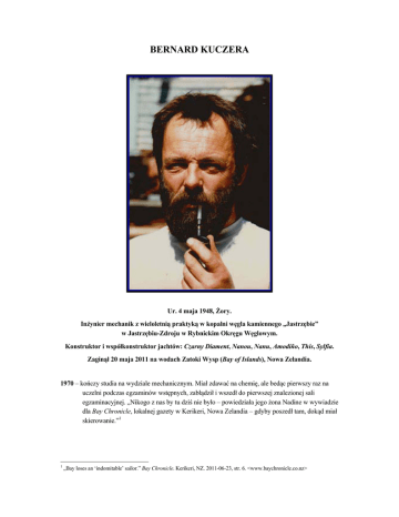 BERNARD KUCZERA Ur. 4 maja 1948, Żory. Inżynier mechanik z wieloletnią praktyką w kopalni węgla kamiennego „Jastrzębie” w Jastrzębiu-Zdroju w Rybnickim Okręgu Węglowym. Konstruktor i współkonstruktor jachtów: Czarny Diament, Nanou, Nanu, Amodiño, This, Sylfia. Zaginął 20 maja 2011 na wodach Zatoki Wysp (Bay of Islands), Nowa Zelandia. 1970 – kończy studia na wydziale mechanicznym. Miał zdawać na chemię, ale bedąc pierwszy raz na uczelni podczas egzaminów wstępnych, zabłądził i wszedł do pierwszej znalezionej sali egzaminacyjnej. „Nikogo z nas by tu dziś nie było – powiedziała jego żona Nadine w wywiadzie dla Bay Chronicle, lokalnej gazety w Kerikeri, Nowa Zelandia – gdyby poszedł tam, dokąd miał skierowanie.”1 1 „Bay loses an ‘indomitable’ sailor.” Bay Chronicle. Kerikeri, NZ. 2011-06-23, str. 6. <www.baychronicle.co.nz> WHO IS WHO: Bernard Kuczera www. ZeglujmyRazem.com 2 1971-1984 – CZARNY DIAMENT 1971-1978 – powstaje Czarny Diament, 16-metrowy stalowy kecz budowany na terenie Kopalni Moszczenica (dzisiejsza Jastrzębska Spółka Węglowa S.A.) w Jastrzębiu Zdrój. Budowała go maszoperia żeglarska założona przez kilku członków kopalnianego klubu żeglarskiego „Delfin”; część źródeł podaje, że była to pierwsza taka maszoperia w PRL. Jednym z maszopów2 jest Bernard Kuczera. Jacht, jako nowa konstrukcja o nazwie Rigel, został zaprojektowany przez szczecińskiego konstruktora Kazimierza Michalskiego. Aleksander Kaszowski, Zbigniew Urbanyi - Polskie jachty na oceanach. Gdańsk : Wyd. Morskie, 1986, str. 122. Inicjatorem budowy jachtu i głównym maszopem był Jerzy Radomski, praktycznie jedyny kapitan Czarnego Diamenta, który pływał na nim nieprzerwanie przez 32 lata – wrócił do Szczecina 27 czerwca 2010, zostawiając za rufą ok. 240 000 Mm. Za rejs ten kpt. Radomski został uhonorowany wieloma nagrodami, w tym dwukrotnie (1995, 2010) Srebrnym Sekstantem i nagrodą „Kolos 2010”3. 2 maszop – rybak bedący członkiem maszoperii. [Słownik języka polskiego. T. 4, L-Nić (red. Witold Doroszewski). Warszawa : Wiedza Powszechna, 1962.] maszoperia – sezonowy związek rybaków kaszubskich oparty na zasadzie wspólnego połowu i podziału ryb; o podziale zysków decyduje wkład w postaci pracy, sprzetu, statku itp. <nm. Maskopei = spółka handlowa z hol. maatschappij = towarzystwo> (ibidem) Współcześnie nazwy maszoperia używają czasem także mniej lub bardziej formalne kluby żeglarskie. Członkowie takiej żeglarskiej maszoperii składają się na wyposażenie i przygotowanie do żeglugi jachtu, na którym następnie pływają. <http://pl.wikipedia.org/wiki/Maszoperia> 3 Kolosy – polskie nagrody podróżnicze przyznawane corocznie od 2000 roku za dokonania w kategoriach: podróże, alpinizm, żeglarstwo, speleologia, wyczyn roku oraz („Super Kolos”) za całokształt osiagnięć lub za wybitne dokonanie zespołowe. www. ZeglujmyRazem.com WHO IS WHO: Bernard Kuczera 3 Kpt. Jerzy Radomski: Jacht „Czarny Diament” został zaprojektowany na moje specjalne życzenie. Kaziu Michalski miał rysunek roboczy jachtu stalowego 12 metrów. W 1970 roku zorganizowałem I Górniczy Rejs Na Wyspy Kanaryjskie na jachcie „Chrobry” o dł. 16,10 m. Był to piękny jacht drewniany4. W drodze powrotnej zatrzymaliśmy się w Dover. Z naszym słynnym żeglarzem kpt. Heniem Jaskułą odwiedziliśmy bar w Yacht Clubie. Właśnie tam odbywała się poważna narada Komitetu Wokółziemskich Regat Whitbread. Jako pierwsi otrzymaliśmy zaproszenie na regaty. Heniu Jaskuła marzył o takich regatach. Zaczęliśmy poważnie myśleć o budowie solidnego jachtu. Ja wcześniej zacząłem budować jacht „Agat”5 Zbigniewa Milewskiego. Niestety – ten jacht nie nadawał się na takie regaty. W tym czasie byłem Komandorem Górniczego Yacht Clubu w Jastrzębiu Zdroju. Po powrocie z rejsu zacząłem szukać możliwości wybudowania jachtu 16-metrowego przy pomocy kopalni. Miałem swoje rysunki (plany), oczywiście zerżnięte z wielu konstrukcji. Niestety takiej dokumentacji nikt w Polsce by nie zatwierdził. Dyrektor mojej Kopalni powiedział mi coś ważnego: – Jurek, ty dziś – komandor, ja – dyrektor, a co będzie jutro w tym kraju – nic nie wiadomo. Za kopalnią jest miejsce w opuszczonym hangarze. Możesz tam budować jacht. Myślałem, że budowa potrwa najwyżej 3 lata. Niestety, trwała 7 lat. Heniu w tym czasie odbył rejs wokół Ameryki Południowej na „Eurosie”, a następnie na jachcie „Dar Przemyśla” wyruszył w słynny rejs non stop dookoła świata. Maszopów było wielu, ostatecznie pięciu. Ale w rejs wypłynąłem tylko z Bernardem. Bernard wszedł do maszoperii w ostatniej fazie. Jego udział to zamontowanie silnika, wspólnie też położyliśmy pokład z teaku. Oczywiś‐ cie wniósł wkład finan‐ sowy. 4 s/y Chrobry - rok bud. nieustalony, jako poniemiecki wrak odnaleziony w 1948; dwumasztowy drewniany jacht pełnomorski. Dł. (bez bukszprytu) 16,10 m (53 ft.), szer. 4,08 m (13.4 ft.), pow. ożagl. 137 m kw. (1475 sq. ft.), typ ożagl. – jol; maks. liczba załogi – 11 osób; nr na żaglu – PZ-7. (Wachowiak, Mario. „Trzebieska Flotylla. Rzecz o jachtach Ośrodka na tle jego 29-letniej historii”. W: Konferencja Popularno - Naukowa Trzebieski Manewr 1987. Trzebież, Biblioteczka Centralnego Ośrodka Żeglarstwa PZŻ im. Andrzeja Benesza, 1987.) 5 Agat – jednomasztowy jacht sklejkowy (konstrukcja: Zbigniew Milewski, 1962). Został zbudowany na bazie jachtu Ametyst, jednak jest od niego nieco większy. Doskonale sprawdza się w warunkach rejsów zatokowych, ale wg konstruktora nadaje się do pełnomorskich rejsów bez ograniczeń i spełnia wszystkie wymagania dla jachtów oceanicznych. Dł. 10,05 m (33 ft.), szer. 2,50 m (8.2 ft.), zanurzenie maks. 175 cm (5.75 ft.), pow. ożagl. 32 m kw. (345 sq. ft.); silnik stacjonarny, zbiornik wody – 200 l (53 gal.), zbiornik pa