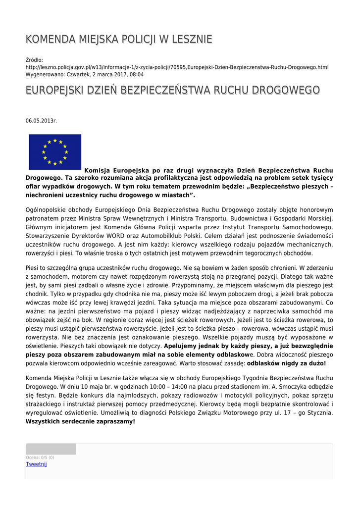 KOMENDA MIEJSKA POLICJI W LESZNIE Źródło: http://leszno.policja.gov.pl/w13/informacje-1/z-zycia-policji/70595,Europejski-Dzien-Bezpieczenstwa-Ruchu-Drogowego.html Wygenerowano: Czwartek, 2 marca 2017, 08:04 EUROPEJSKI DZIEŃ BEZPIECZEŃSTWA RUCHU DROGOWEGO 06.05.2013r. Komisja Europejska po raz drugi wyznaczyła Dzień Bezpieczeństwa Ruchu Drogowego. Ta szeroko rozumiana akcja profilaktyczna jest odpowiedzią na problem setek tysięcy ofiar wypadków drogowych. W tym roku tematem przewodnim będzie: „Bezpieczeństwo pieszych – niechronieni uczestnicy ruchu drogowego w miastach”. Ogólnopolskie obchody Europejskiego Dnia Bezpieczeństwa Ruchu Drogowego zostały objęte honorowym patronatem przez Ministra Spraw Wewnętrznych i Ministra Transportu, Budownictwa i Gospodarki Morskiej. Głównym inicjatorem jest Komenda Główna Policji wsparta przez Instytut Transportu Samochodowego, Stowarzyszenie Dyrektorów WORD oraz Automobilklub Polski. Celem działań jest podnoszenie świadomości uczestników ruchu drogowego. A jest nim każdy: kierowcy wszelkiego rodzaju pojazdów mechanicznych, rowerzyści i piesi. To właśnie troska o tych ostatnich jest motywem przewodnim tegorocznych obchodów. Piesi to szczególna grupa uczestników ruchu drogowego. Nie są bowiem w żaden sposób chronieni. W zderzeniu z samochodem, motorem czy nawet rozpędzonym rowerzystą stoją na przegranej pozycji. Dlatego tak ważne jest, by sami piesi zadbali o własne życie i zdrowie. Przypominamy, że miejscem właściwym dla pieszego jest chodnik. Tylko w przypadku gdy chodnika nie ma, pieszy może iść lewym poboczem drogi, a jeżeli brak pobocza wówczas może iść przy lewej krawędzi jezdni. Taka sytuacja ma miejsce poza obszarami zabudowanymi. Co ważne: na jezdni pierwszeństwo ma pojazd i pieszy widząc nadjeżdżający z naprzeciwka samochód ma obowiązek zejść na bok. W regionie coraz więcej jest ścieżek rowerowych. Jeżeli jest to ścieżka rowerowa, to pieszy musi ustąpić pierwszeństwa rowerzyście. Jeżeli jest to ścieżka pieszo – rowerowa, wówczas ustąpić musi rowerzysta. Nie bez znaczenia jest oznakowanie pieszego. Wszelkie pojazdy muszą być wyposażone w oświetlenie. Pieszych taki obowiązek nie dotyczy. Apelujemy jednak by każdy pieszy, a już bezwzględnie pieszy poza obszarem zabudowanym miał na sobie elementy odblaskowe. Dobra widoczność pieszego pozwala kierowcom odpowiednio wcześnie zareagować. Warto stosować zasadę: odblasków nigdy za dużo! Komenda Miejska Policji w Lesznie także włącza się w obchody Europejskiego Tygodnia Bezpieczeństwa Ruchu Drogowego. W dniu 10 maja br. w godzinach 10:00 – 14:00 na placu przed stadionem im. A. Smoczyka odbędzie się festyn. Będzie konkurs dla najmłodszych, pokazy radiowozów i motocykli policyjnych, pokaz sprzętu strażackiego i instruktaż pierwszej pomocy przedmedycznej. Kierowcy będą mogli bezpłatnie skontrolować i wyregulować oświetlenie. Umożliwią to diagności Polskiego Związku Motorowego przy ul. 17 – go Stycznia. Wszystkich serdecznie zapraszamy! Ocena: 0/5 (0) Tweetnij