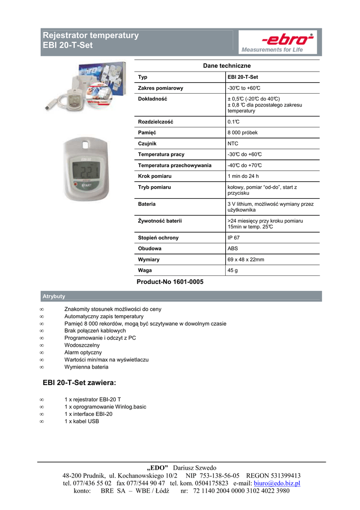 Rejestrator temperatury EBI 20-T-Set Dane techniczne Typ EBI 20-T-Set Zakres pomiarowy -30°C to +60°C Dokładność ± 0,5°C (-20°C do 40°C) ± 0,8 °C dla pozostałego zakresu temperatury Rozdzielczość 0.1°C Pamięć 8 000 próbek Czujnik NTC Temperatura pracy -30°C do +60°C Temperatura przechowywania -40°C do +70°C Krok pomiaru 1 min do 24 h Tryb pomiaru kołowy, pomiar “od-do”, start z przycisku Bateria 3 V lithium, moŜliwość wymiany przez uŜytkownika śywotność baterii >24 miesięcy przy kroku pomiaru 15min w temp. 25°C Stopień ochrony IP 67 Obudowa ABS Wymiary 69 x 48 x 22mm Waga 45 g Product-No 1601-0005 Atrybuty • • • • • • • • • Znakomity stosunek moŜliwości do ceny Automatyczny zapis temperatury Pamięć 8 000 rekordów, mogą być sczytywane w dowolnym czasie Brak połączeń kablowych Programowanie i odczyt z PC Wodoszczelny Alarm optyczny Wartości min/max na wyświetlaczu Wymienna bateria EBI 20-T-Set zawiera: • • • • 1 x rejestrator EBI-20 T 1 x oprogramowanie Winlog.basic 1 x interface EBI-20 1 x kabel USB „EDO” Dariusz Szwedo 48-200 Prudnik, ul. Kochanowskiego 10/2 NIP 753-138-56-05 REGON 531399413 tel. 077/436 55 02 fax 077/544 90 47 tel. kom. 0504175823 e-mail: [email protected] konto: BRE SA – WBE / Łódź nr: 72 1140 2004 0000 3102 4022 3980