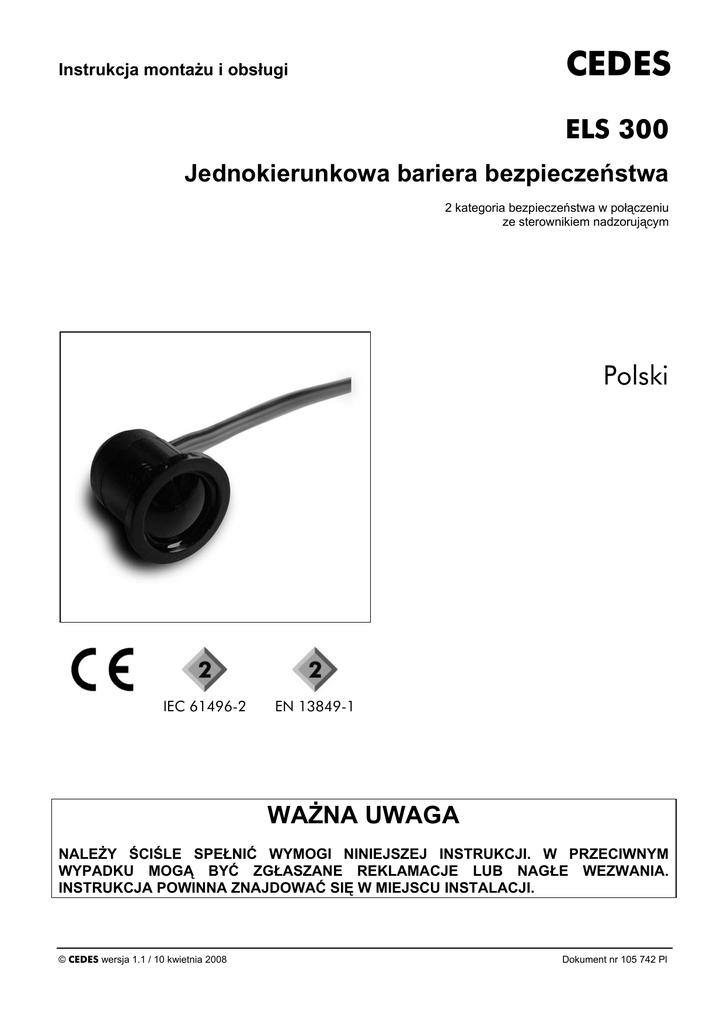 CEDES Instrukcja montażu i obsługi ELS 300 Jednokierunkowa bariera bezpieczeństwa 2 kategoria bezpieczeństwa w połączeniu ze sterownikiem nadzorującym English Polski IEC 61496-2 EN 13849-1 WAŻNA UWAGA NALEŻY ŚCIŚLE SPEŁNIĆ WYMOGI NINIEJSZEJ INSTRUKCJI. W PRZECIWNYM WYPADKU MOGĄ BYĆ ZGŁASZANE REKLAMACJE LUB NAGŁE WEZWANIA. INSTRUKCJA POWINNA ZNAJDOWAĆ SIĘ W MIEJSCU INSTALACJI. © CEDES wersja 1.1 / 10 kwietnia 2008 Dokument nr 105 742 Pl ELS 300 Instrukcja montażu i obsługi WAŻNA INFORMACJA ELS 300 MOŻE BYĆ INSTALOWANA TYLKO PRZEZ OSOBY UPOWAŻNIONE I W PEŁNI PRZESZKOLONE! ELS 300 MOŻE PEŁNIĆ FUNKCJĘ URZĄDZENIA BEZPIECZEŃSTWA TYLKO WTEDY, GDY ZOSTANĄ ŚCIŚLE SPEŁNIONE WSZYSTKIE ZALECENIA OKREŚLONE W NINIEJSZEJ INSTRUKCJI I WYMIENIONYCH W NIEJ DOKUMENTACH. DODATKOWO, INSTALATOR POWINIEN SPEŁNIĆ WSZYSTKIE KRAJOWE WYMOGI OKREŚLONE W PRZEPISACH PRAWA I NORMACH. JEŚLI KTÓREKOLWIEK Z TYCH ZALECEŃ NIE ZOSTANIE ŚCIŚLE SPEŁNIONE, MOŻE TO BYĆ PRZYCZYNĄ POWAŻNEGO KALECTWA LUB ŚMIERCI. INSTALATOR LUB INTEGRATOR SYSTEMU JEST CAŁKOWICIE ODPOWIEDZIALNY ZA BEZPIECZNĄ INTEGRACJĘ TEGO CZUJNIKA. PROJEKTANT I/LUB INSTALATOR I/LUB KUPUJĄCY JEST WYŁĄCZNIE ODPOWIEDZIALNY ZA ZAGWARANTOWANIE ABY TEN PRODUKT ZOSTAŁ ZASTOSOWANY ZGODNIE ZE WSZYSTKIMI ODPOWIEDNIMI PRZEPISAMI I NORMAMI W CELU ZAPEWNIENIA BEZPIECZNEGO DZIAŁANIA CAŁEJ APLIKACJI. SZCZEGÓLNĄ TROSKĄ NALEŻY OTOCZYĆ MIEJSCA W KTÓRYCH DZIECI I/LUB OSOBY STARSZE LUB NIEPEŁNOSPRAWNE MUSZĄ BYĆ CHRONIONE PRZED NIEBEZPIECZNYMI DRZWIAMI LUB BRAMAMI. KAŻDA MODYFIKACJA URZĄDZENIA WYKONANA PRZEZ KUPUJĄCEGO, INSTALATORA LUB UŻYTKOWNIKA MOŻE SPOWODOWAĆ NIEBEZPIECZNE WARUNKI PRACY. FIRMA CEDES NIE PONOSI ŻADNEJ ODPOWIEDZIALNOŚCI GWARANCYJNEJ W PRZYPADKU TAKICH DZIAŁAŃ. PRAWNEJ LUB NIE WOLNO STOSOWAĆ TEGO PRODUKTU W OTOCZENIU WYBUCHOWYM, W ŚRODOWISKU RADIOAKTYWNYM LUB W APLIKACJACH MEDYCZNYCH! DO TAKICH APLIKACJI NALEŻY STOSOWAĆ TYLKO PRZEZNACZONE DO TEGO ATESTOWANE URZĄDZENIA BEZPIECZESTWA, W PRZECIWNYM WYPADKU MOŻE BYĆ TO PRZYCZYNĄ ŚMIERCI LUB KALECTWA ALBO STRAT MATERIALNYCH! Ex 2 www.cedes.com © CEDES / kwiecień 2008 ELS 300 Instrukcja montażu i obsługi Spis treści 1. 1. Wprowadzenie ................................................3 2. Właściwości ELS 300 .....................................3 3. Zastosowania ..................................................3 4. Wymiary...........................................................4 5. Instalacja .........................................................4 5.1. Schemat podłączeń ......................................5 5.2. Testowanie w aplikacjach 2 kategorii ...........5 5.3. Instalacja 2 lub więcej barier podczerwieni ..6 5.4. Przebiegi czasowe........................................6 6. Zastosowanie zwrotnic Y-Switch..................7 6.1. Prąd wyjścia sygnałowego ...........................7 6.2. Charakterystyki wyjść przy użyciu Y-switch .7 7. Akcesoria.........................................................8 8. Usuwanie usterek ...........................................9 9. Dane techniczne .............................................9 10. Dane katalogowe ..........................................10 11. Certyfikaty .....................................................11 11.1. Deklaracja zgodności CE ...........................11 Wprowadzenie ELS 300 jest jednokierunkową barierą podczerwieni bezpieczeństwa i jest atestowana jako aktywne optoelektroniczne urządzenie ochronne (AOPD) typu 2 wg IEC 61496-2: 2006. Składa się z nadajnika (Tx) i odbiornika (Rx), który zawiera wbudowany sterownik z wyjściem PNP lub NPN aktywowanym wiązką świetlną lub jej brakiem. Mechanizm „zatrzaskowy” umożliwia szybkie mocowanie w otworze montażowym o średnicy nawet 12,5 mm. Zielony LED na tyle Tx sygnalizuje obecność zasilania. Zielony LED na tyle Rx sygnalizuje status wyjścia. Urządzenie jest szczelne i całkowicie zabezpieczone przed wilgocią i kurzem zgodnie ze stopniem ochrony IP65. Niezawodne działanie nie jest zakłócone nawet bezpośrednim wpływem promieni słonecznych o wartości do 100,000 luksów. 2. Właściwości ELS 300 • • • • • • • • • • • • • 3. Czujnik typu 2 odpowiedni do aplikacji w 2 kategorii Łatwy montaż Kompaktowa konstrukcja Wysoka wydajność Niezwykle opłacalna Nie wymaga sterownika Prosta instalacja i montaż Do aplikacji wewnętrznych i zewnętrznych Niewrażliwa na światło otoczenia Doskonała pewność działania nawet w trudnych warunkach Natychmiastowe działanie Wyjście PNP lub NPN, dostępność aktywacji na wiązkę świetlną lub jej brak Możliwość łączenia wielu czujników w sieć Zastosowania Rodzina barier jednokierunkowych ELS 300 obejmuje różne typy czujników do automatycznych drzwi przesuwnych, drzwi windowych, ruchomych schodów, ruchomych chodników, bram wjazdowych i podobnych aplikacji. Prosimy o zapoznanie się z odpowiednimi normami krajowymi dot. danej aplikacji. ELS 300 może być także zastosowana jako bariera podczerwieni bezpieczeństwa w automatyce przemysłowej. W takich aplikacjach kombinacja ELS 300 z nadzorującą jednostką sterującą (np. programowalny sterownik logiczny, PLC) może osiągnąć 2 kategorię bezpieczeństwa wg EN 954-1 lub może osiągnąć poziom zapewnienia bezpieczeństwa C wg EN 13849-1:2006. © CEDES / kwiecień 2008 www.cedes.com 3 ELS 300 4. Instrukcja montażu i obsługi 5. Wymiary • Są dostępne różne typy czujników ELS 300, które są zaprojektowane dla różnych aplikacji. Wersja Tx dla aplikacji wymagających dalekiego zasięgu (typ L) posiada dłuższą obudowę niż inne typy. Wymiary obudowy Rx są takie same dla wszystkich dla wszystkich typów ELS 300. Więcej informacji nt. różnych typów i konfiguracji znajduje się na str. 10 Dane katalogowe. Skrót Opis NA Wąski kąt optyczny S Krótki zasięg N Standardowy zasięg L Daleki zasięg Instalacja • • Przed rozpo