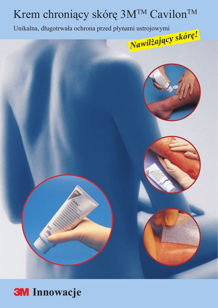 Krem chroniący skórę 3MTM CavilonTM Unikalna, długotrwała ochrona przed płynami ustrojowymi ę! r ó k s y c awilżają N Innowacje Krem chroniący skórę 3MTM CavilonTM Unikalna, długotrwała ochrona przed płynami ustrojowymi Wskazania do użycia • jako zabezpieczenie przed podrażnieniem skóry płynami ustrojowymi • zapobieganie uszkodzeniu skóry związanemu z nietrzymaniem moczu • jako nawilżanie znacznie wysuszonej skóry • jako ochrona dla otartej, spękanej skóry Używanie kremu chroniącego skórę 3M™ Cavilon przynosi wiele korzyści: • Opłacalność - niewielka ilość wystarcza na długi czas • Odporność na zmywanie - nie potrzeba częstych powtórnych aplikacji • Utrzymuje oddychającą barierę ochronną skóry - pomaga chronić skórę przed zanieczyszczeniem z zewnątrz • Nie zatyka, nie wpływa na absorpcję pieluch • Nie zmniejsza przylepności przylepców i opatrunków samoprzylepnych • Właściwe, odpowiednie dla skóry PH, utrzymuje naturalną funkcję skóry • Dostarcza wilgoć skórze i spowalnia oddawanie wody ze skóry • Działa jak środek odżywczy i regenerujący utrzymuje skórę miękką, gładką, elastyczną. • Hypoalergiczny Techniki aplikacji 2. Nałóż niewielką ilość kremu chroniącego skórę 3MTM Cavilon i delkatnie rozprowadź go na skórze. 1. Stosuj na czystą, suchą skórę. 30 3. Krem chroniący skórę 3MTM Cavilon powinien być stosowany na suchą skórę codziennie, Należy ponownie nałożyć krem w przypadku co trzeciego epizodu popuszczenia moczu. secondes 1 Bardzo ważne: Nakładaj umiarkowaną ilość. Jeśli pojawia się odczucie „tłustej skóry”, to nałożono za dużo kremu. 2 Informacje dla zamawiających krem chroniący skórę 3MTM Cavilon Nr katalogowy Opis Op. jedn. Op. handlowe 3391E Krem chroniący skórę Cavilon 28 g/tubkę 12 tabletek 3392E Krem chroniący skórę Cavilon 30 secondes 92 g/tubkę 12 tabletek 3392S Krem chroniący skórę Cavilon 2 g/saszetkę. 20s./pudełko 12 pudełek 3M Poland Sp. z o.o. Dział Medyczny Al. Katowicka 117, Kajetany 05-830 Nadarzyn tel./fax (0xx22) 739 60 00/01 © 3M Health Care Limited 2003 3M i Cavilon są znakami handlowymi firmy 3M EF 519 03 03 01 VA/Graphix/0103 W celu uzyskania dalszych informacji prosimy zajrzeć na stronę www.3M.com