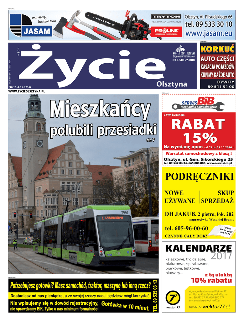 REKLAMA nr 20 (191 ) 2016 ISSN 1734-7076 NOWE Życie REKLAMA (18.10.-2.11. 2016) www.zycieolsztyna.pl REKLAMA NAKŁAD 25 000 Olsztyna REKLAMA 2 “Nowe Życie Olsztyna” nr 20 (191) 2016 z olsztyna Remont trasy kolejowej Olsztyn – Toruń – Poznań Linia kolejowa nr 353 (Poznań Wschód – Skandawa) ma zostać zmodernizowana. W samym województwie warmińsko-mazurskim na tę inwestycję zostanie wydanych około 50 mln złotych. To uatrakcyjni podróż pociągiem z Olsztyna do Torunia i Poznania. PKP podpisało umowę na remont nowych odcinków tras kolejowych. Wśród nich jest modernizacja 12 przejazdów kolejowo-drogowych, z czego 4 na odcinku Stare Jabłonki – Olsztyn. Do tego Polskie Linie Kolejowe mają wyremontować 33 kilometry torów i 10 obiektów inżynieryjnych na trasie między Ostrowite a Jamielnikiem. Rozpoczęcie inwestycji na odcinku Jabłonowo Pomorskie – Iława – Olsztyn – Korsze zaplanowano na październik bieżącego roku. Remont powinien zakończyć się we wrześniu 2017 roku. Na zmodernizowanych przejazdach ma być położona nowa nawierzchnia oraz zostać zainstalowana nowoczesna sygnalizacja przejazdowa. Ma to zapewnić większy poziom bezpieczeństwa w ruchu kolejowym i drogowym. Zdaniem kolejarzy, komfort jazdy ulegnie znacznej poprawie. Pociągi osobowe będą mogły rozwijać prędkość do 120 km/h, natomiast towarowe do 100 km/h. To z kolei umożliwi zwiększenie przepustowości na trasie. Podczas prac mają zostać gruntownie zmodernizowane perony na stacjach Olsztyn Zachodni i Naterki. Oba dworce zyskają wyższe platformy, przystosowane do potrzeb osób niepełnosprawnych, wyposażone w nawierzchnię antypoślizgową, nowe wiaty, tablice informacyjne, ławki oraz oświetlenie. Osoby niewidome będą mogły skorzystać z informacji napisanych językiem Braille’a. Wyrok ws. korupcji w urzędzie marszałkowskim Sąd Rejonowy w Olsztynie wydał wyroki w zawieszeniu wobec byłego dyrektora jednego z departamentów Urzędu Marszałkowskiego w Olsztynie i dwóch biznesmenów. Wszyscy byli oskarżeni w sprawie korupcji dotyczącej zamówień publicznych. Na całą trójkę sąd nałożył też grzywny. Akt oskarżenia w tej sprawie prokuratura przesłała do sądu Rejonowego w Olsztynie w czerwcu. Akt zawierał 16 zarzutów przedstawionych ośmiu osobom. Najwięcej dotyczyło przedsiębiorcy Władysława B. Zarzucono mu m.in., że działając wspólnie i w porozumieniu z innym biznesmenem Tadeuszem Z. udzielił Igorowi H., dyrektorowi jednego z departamentów Urzędu Marszałkowskiego w Olsztynie, korzyści majątkowej w łącznej kwocie co najmniej 20 tys. zł. Miało to związek z realizacją kampanii medialno-wizerunkowej dotyczącej imprez promujących żywność naturalną, tradycyjną, regionalną i lokalną. REKLAMA Wszyscy trzej oskarżeni złożyli wnioski o wydanie wyroku skazującego bez przeprowadzenia rozprawy. Sąd Rejonowy w Olsztynie na posiedzeniu rozpatrzył te wnioski i jeszcze tego samego dnia wydał wyroki skazujące. Władysławowi B. wymierzył karę 1 roku i 8 miesięcy więzienia w zawieszeniu na 3 lata. Ma też zapłacić grzywnę w wysokości 10 tys. zł. Igor H. został skazany na 1 roku i 6 miesięcy pozbawienia wolności w zawieszeniu na 3 lata oraz zapłatę 10 tys. zł grzywny. Sąd orzekł wobec niego również przepadek na rzecz Skarbu Państwa 20 tys. zł osiągniętych z przestępstwa. Najlżejszy wyrok, bo tylko 8 miesięcy więzienia w zawieszeniu na 2 lata oraz tysiąc złotych grzywny dostał Tadeusz Z. Pieniądze na Łynostradę. Będzie dłuższa Ponad 3,6 mln zł – to koszt budowy pierwszego odcinka nowej trasy spacerowej i rowerowej. Docelowo połączy Brzeziny z Lasem Miejskim. Łynostrada to zwycięski projekt ubiegłorocznej edycji Olsztyńskiego Budżetu Obywatelskiego. Zgłosiły ją Stowarzyszenie Wizja Lokalna oraz Forum Rozwoju Olsztyna. W założeniu miała stanowić trasę spacerową dla pieszych i rowerzystów, która połączy park Centralny z osiedlem Mleczna. Pierwotna wartość projektu to 1 mln zł. Inwestycja miała być realizowana w tym roku, ale ratuszowi urzędnicy uznali, że Łynostrada powinna być jeszcze dłuższa. Dlatego milion złotych z OBO to za mało. Miasto zdecydowało, że sięgnie po potrzebne pieniądze z funduszy europejskich. W tej sytuacji wyliczono, że budowa pierwszego odcinka Łynostrady będzie ostatecznie kosztować ponad 3,6 mln zł. Te pieniądze są już pewne. Pozyskane zostaną z projektu Eko-mobilności. Z tego samego powstaną nowe ulice Pieniężnego i Partyzantów. Wszystkie te przedsięwzięcia będą mogły się zacząć w przyszłym roku. Ratusz planuje rozbudować Łynostradę o dwa kolejne odcinki. Jeden od ul. Tuwima do mostku na Brzezinach, drugi od parku Podzamcze do Lasu Miejskiego. Ich realizacja to koszt po- NOWE Życie Wydawca: Agencja Reklamowo-Wydawnicza INNA PERSPEKTYWA” Paweł Lik, “ redaktor naczelny: Leszek Lik, [email protected]; redaktor wydania bezpłatnego: Paweł Lik, dziennikarze: Andrzej Zb. Brzozowski, Cezary Kapłon, Jacek Panas, Jerzy Pantak, Mirosław Rogalski, Olga Ropiak, Mariusz Wadas; rysunki: Zbigniew Piszczako; okładka: Paweł Lik Biuro promocji i reklamy: tel. 505 129 273; (r) – materiał reklamowy lub powierzony, ar- archiwum redakcji. Redakcja nie odpowiada za treœæ i formê powierzonych materia³ów, zastrzega sobie prawo adiustacji powierzonych tekstów. Druk: Grupa WM Sp. z o.o. Olsztyna Nakład 25 000 nad 4,6 mln zł. Pieniądze na ich budowę będą dzielone w innym konkursie unijnym. Czarne chmury nad Szymanami Z końcem października z lotniska Olsztyn-Mazury przestanie latać SprintAir. Zimą i wiosną z portu lotniczego samoloty będą kursować jedynie do Londynu. Dopiero z nadejściem lata Wizz Air uruchomi połączenie do Oslo. Najmłodsze lotnisko w Polsce radzi sobie lepiej, niż zakładały jego władze. Ostatnio ze stolicy Anglii przyleciał 30-tysięczny pasażer. Oznacza to, że warmi