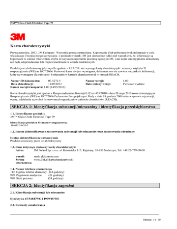 3M™ Glass Cloth Electrical Tape 79 Karta charakterystyki Prawa autorskie, 2013, 3M Company Wszystkie prawa zastrzeżone. Kopiowanie i/lub pobieranie tych informacji w celu właściwego i bezpiecznego korzystania z produktów marki 3M jest dozwolone tylko pod warunkiem, że: informacje są kopiowane w całości i bez zmian, chyba że uzyskano uprzednio pisemną zgodę od 3M, i ani kopie ani oryginalne dokumenty nie będą odsprzedawane lub rozpowszechniane w celach zarobkowych. Produkt jest zdefiniowany jako wyrób zgodnie z REACH i nie wymaga karty charakterytyki na mocy artykułu 31 rozporządzenia (WE) nr 1907/2006. Ponieważ karta nie jest wymagana, dokument ten nie zawiera wszystkich informacji, które są wymagane dla substancji i mieszanin w kartach charakterystyki w ramach REACH. 07-5272-5 Numer ID dokumentu: 14/05/2013 Data aktualizacji: Numer wersji transportu: 1.00 (14/05/2013) Numer wersji: Data zmiany wersji: 1.00 Pierwsze wydanie Karta charakterystyki jest zgodna z Rozporządzeniem Komisji (UE) nr 453/2010 z dnia 20 maja 2010 roku zmieniającym Rozporządzenie (WE) nr 1907/2006 Parlamentu Europejskiego i Rady z dnia 18 grudnia 2006 roku w sprawie rejestracji, oceny, udzielania zazwoleń i stosowanych ograniczeń w zakresie chemikaliów (REACH). SEKCJA 1: Identyfikacja substancji/mieszaniny i identyfikacja przedsiębiorstwa 1.1. Identyfikator produktu 3M™ Glass Cloth Electrical Tape 79 Identyfikacja produktu 3M (numer magazynowy) 80-6112-1431-5 1.2. Istotne zidentyfikowane zastosowania substancji lub mieszaniny oraz zastosowania odradzane Istotne zidentyfikowane zastosowania Produkt stosowany przez dział elektryczny 1.3. Dane dotyczące dostawcy karty charakterystyki 3M Poland Sp. z o.o. al. Katowicka 117, Kajetany, 05-830 Nadarzyn; Tel: +48 22-739-60-00 Adres: [email protected] e-mail: www.3M.pl/kartycharakterystyki Strona internetowa: 1.4. Numer telefonu alarmowego 112 Ogólny telefon alarmowy (24 godziny) 999 Pogotowie medyczne (24 godziny) 998 Straż pożarna (24 godziny) SEKCJA 2: Identyfikacja zagrożeń 2.1. Klasyfikacja substancji lub mieszaniny Dyrektywa 67/548/EWG i 1999/45/WE 2.2. Elementy oznakowania __________________________________________________________________________________________ Strona: 1 z 10 3M™ Glass Cloth Electrical Tape 79 Dyrektywa 67/548/EWG i 1999/45/WE Symbole Nie dotyczy. Zawiera: Nie dotyczy. Zwroty wskazujące rodzaj zagrożenia: Nie dotyczy. Zwroty określające warunki bezpiecznego stosowania: Nie dotyczy. 2.3. Inne zagrożenia Nieznane SEKCJA 3: Skład/informacja o składnikach Nazwa substancji Włókno szklane Nr CAS 65997-17-3 Nr WE Stężenie % EINECS 266- 60 - 80 046-0 Klasyfikacja Substancja o ustalonym NDS w środowisku pracy. Klej akrylowy 25134-51-4 Brak 25 - 40 Substancja niesklasyfikowana jako niebezpieczna Skrobia, PVA, smary Mieszanina Brak 0,5 - 2,6 Substancja niesklasyfikowana jako niebezpieczna Polimer etylenu i octanu winylu 24937-78-8 Brak 1- 2 Substancja niesklasyfikowana jako niebezpieczna Wykaz zwrotów R i H, wskazujących kategorię niebezpieczeństwa, które zamieszczono w punkcie 3 karty charakterystyki oraz ich pełne brzmienie zamieszczono w punkcie 16 niniejszej karty. W celu uzyskania informacji o zastosowanych notach należy zapoznać się z informacjami zawartymi w sekcji 15. Informacje dotyczące najwyższych dopuszczalnych stężeń i substancji PBT i vPvB znajdują się w sekcji 8 i 12 karty charakterystyki. SEKCJA 4: Środki pierwszej pomocy 4.1. Opis środków pierwszej pomocy Drogi oddechowe Nie przewiduje się konieczności udzielania pierwszej pomocy. Kontakt ze skórą Umyć wodą z mydłem. Jeżeli objawy narażenia wystąpią, skontaktować się z lekarzem. Kontakt z oczami Wypłukać dużą ilością wody. Usunąć szkła kontaktowe. Nadal płukać. Jeżeli objawy nie ustępują, skontaktować się z lekarzem. Droga pokarmowa Nie przewiduje się konieczności udzielania pierwszej pomocy. 4.2. Najważniejsze ostre i opóźnione objawy oraz skutki narażenia Patrz Sekcja 11.1 Informacje dotyczące skutków toksykologicznych __________________________________________________________________________________________ Strona: 2 z 10 3M™ Glass Cloth Electrical Tape 79 4.3. Wskazania dotyczące wszelkiej natychmiastowej pomocy lekarskiej i szczególnego postępowania z poszkodowanym Nie dotyczy SEKCJA 5: Postępowanie w przypadku pożaru 5.1. Środki gaśnicze Materiał nie pali się. W przypadku pożaru: Użyć dwutleneku węgla lub suchej chemicznej gaśnicy do gaszenia. 5.2. Szczególne zagrożenia związane z substancją lub mieszaniną Żadne dla tego produktu. 5.3. Informacje dla straży pożarnej Produkt nie wykazuje właściwości palnych lub wybuchowych. SEKCJA 6: Postępowanie w przypadku niezamierzonego uwolnienia do środowiska 6.1. Indywidualne środki ostrożności, wyposażenie ochronne i procedury w sytuacjach awaryjnych Nie dotyczy 6.2. Środki ostrożności w zakresie ochrony środowiska Nie dotyczy 6.3. Metody i materiały zapobiegające rozprzestrzenianiu się skażenia i służące do usuwania skażenia Nie dotyczy 6.4. Odniesienia do innych sekcji W celu uzyskania dodatkowych informacji zapoznać się z sekcją 8 i 13. SEKCJA 7: Postępowanie z substancjami i mieszaninami oraz ich magazynowanie 7.1. Środki ostrożności dotyczące bezpiecznego postępowania Przy prawidłowym postępowaniu i przechowywaniu produktu nie są uwalniane związki stwarzajace zagrożenie dla zdrowia. Nie używać w zamkniętych pomieszczeniach lub w pomieszczeniach o małym ruchu powietrza. 7.2. Warunki bezpiecznego magazynowania, łącznie z informacjami dotyczącymi wszelkich wzajemnych niezgodności Nie dotyczy 7.3. Szczególne zastosowanie(-a) końcowe Zapoznać się z informacjami, w sekcjach 7.1 i 7.2, dotyczącymi bezpiecznego postępowania i warunków magazynowania produktu. Zapoznać się z informacjami w sekcji 8 dotyczącymi kontroli narażenia i środków ochrony indywidualnej. SEKCJA 8