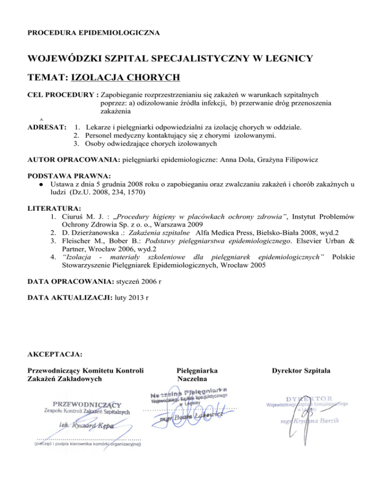 PROCEDURA EPIDEMIOLOGICZNA WOJEWÓDZKI SZPITAL SPECJALISTYCZNY W LEGNICY TEMAT: IZOLACJA CHORYCH CEL PROCEDURY : Zapobieganie rozprzestrzenianiu się zakażeń w warunkach szpitalnych poprzez: a) odizolowanie źródła infekcji, b) przerwanie dróg przenoszenia zakażenia ADRESAT: 1. Lekarze i pielęgniarki odpowiedzialni za izolację chorych w oddziale. 2. Personel medyczny kontaktujący się z chorymi izolowanymi. 3. Osoby odwiedzające chorych izolowanych AUTOR OPRACOWANIA: pielęgniarki epidemiologiczne: Anna Dola, Grażyna Filipowicz PODSTAWA PRAWNA: Ustawa z dnia 5 grudnia 2008 roku o zapobieganiu oraz zwalczaniu zakażeń i chorób zakaźnych u ludzi (Dz.U. 2008, 234, 1570) LITERATURA: 1. Ciuruś M. J. : „Procedury higieny w placówkach ochrony zdrowia”, Instytut Problemów Ochrony Zdrowia Sp. z o. o., Warszawa 2009 2. D. Dzierżanowska .: Zakażenia szpitalne Alfa Medica Press, Bielsko-Biała 2008, wyd.2 3. Fleischer M., Bober B.: Podstawy pielęgniarstwa epidemiologicznego. Elsevier Urban & Partner, Wrocław 2006, wyd.2 4. “Izolacja - materiały szkoleniowe dla pielęgniarek epidemiologicznych” Polskie Stowarzyszenie Pielęgniarek Epidemiologicznych, Wrocław 2005 DATA OPRACOWANIA: styczeń 2006 r DATA AKTUALIZACJI: luty 2013 r AKCEPTACJA: Przewodniczący Komitetu Kontroli Zakażeń Zakładowych Pielęgniarka Naczelna Dyrektor Szpitala DEFINICJE: CHOROBA ZAKAŹNA – choroba, która została wywołana przez biologiczny czynnik chorobotwórczy; CZYNNIK ALARMOWY – biologiczny czynnik chorobotwórczy o szczególnej zjadliwości lub oporności; DROGI ZAKAŻENIA - sposoby przenoszenia się patogenów ze źródła zakażenia na organizmy wrażliwe. IZOLACJA – odosobnienie osoby lub grupy osób chorych na chorobę zakaźną albo osoby lub grupy osób podejrzanych o chorobę zakaźną, w celu uniemożliwienia przeniesienia biologicznego czynnika chorobotwórczego na inne osoby; NOSICIEL – osoba bez objawów choroby zakaźnej, w której organizmie bytują biologiczne czynniki chorobotwórcze, stanowiącą potencjalne źródło zakażenia innych osób; PODEJRZANY O CHOROBĘ ZAKAŹNĄ – osobę, u której występują objawy kliniczne lub odchylenia od stanu prawidłowego w badaniach dodatkowych, mogące wskazywać na chorobę zakaźną; PODEJRZANY O ZAKAŻENIE – osobę, u której nie występują objawy zakażenia ani choroby zakaźnej, która miała styczność ze źródłem zakażenia, a charakter czynnika zakaźnego i okoliczności styczności uzasadniają podejrzenie zakażenia; STYCZNOŚĆ – bezpośredni lub pośredni kontakt osoby ze źródłem zakażenia, jeżeli charakter tego kontaktu zagrażał lub zagraża przeniesieniem na tę osobę biologicznych czynników chorobotwórczych; ŚRODKI OCHRONY OSOBISTEJ - środki noszone lub używane przez pracownika w celu ochrony przed kontaktem z czynnikami o działaniu chorobotwórczym. ŚRODKI OSTROŻNOŚCI: Wszelkie działania niezbędne do odizolowania źródła zakażenia oraz przerwania dróg szerzenia się infekcji. WROTA ZAKAŻENIA: Miejsce wniknięcia patogenu do organizmu. ZAKAŻENIE – wniknięcie do organizmu i rozwój w nim biologicznego czynnika chorobotwórczego; ZAKAŻENIE SZPITALNE – zakażenie, które wystąpiło w związku z udzieleniem świadczeń zdrowotnych, w przypadku gdy choroba: a) nie pozostawała w momencie udzielania świadczeń zdrowotnych w okresie wylęgania albo b) wystąpiła po udzieleniu świadczeń zdrowotnych, w okresie nie dłuższym niż najdłuższy okres jej wylęgania; ZARAŹLIWOŚĆ – zdolność biologicznego czynnika chorobotwórczego do przeżycia i namnażania oraz do wywołania objawów chorobowych po przeniesieniu go do organizmu innego człowieka lub zwierzęcia; ŹRÓDŁO ZAKAŻENIA: Organizm ludzki, zwierzęcy, roślinny lub materia nieożywiona, w której drobnoustroje namnażają się, i z których drogą bezpośrednią lub pośrednią są przenoszone na wrażliwe organizmy. Za prawidłową izolację pacjentów w oddziale odpowiedzialność ponosi ordynator oddziału i pielęgniarka oddziałowa. W sytuacji wątpliwości odnośnie sposobu izolacji, środków ochrony, czasu utrzymania izolacji należy się kontaktować z Działem Epidemiologii tel. wew. 160 (106 przenośny) lub z lekarzem chorób zakaźnych tel. wew 631. IZOLACJA STANDARDOWA Obejmuje rutynowe środki ostrożności stosowane wobec każdego pacjenta niezależnie od jego stanu zdrowia i czynników chorobotwórczych. „Nic, co miało kontakt z jednym chorym, bez oczyszczenia na wymaganym, odpowiednio wysokim poziomie – nie może mieć kontaktu z innym chorym” KRYTERIA/ OBOWIĄZUJĄCE ZASADY UWAGI /PROCEDURY HIGIENA RĄK STOSOWANIE RĘKAWIC STOSOWANIE FARTUCHÓW STOSOWANIE MASEK STOSOWANIE BUTÓW OCHRONNYCH POSTĘPOWA -NIE Z MATERIAŁEM ZAKAŹNYM Wyposażenie stanowiska do mycia rąk: - mydło w płynie, preparat dezynfekcyjny do rąk, ręczniki jednorazowe w dozownikach Higieniczną dezynfekcję rąk przeprowadzać: - przed i po wykonaniu procedur klinicznych, zabiegów inwazyjnych - przed założeniem i po zdjęciu rękawiczek - po potencjalnym skażeniu rąk Skaleczenia i otarcia zabezpieczyć wodoszczelnym opatrunkiem Jałowe jednorazowe stosować podczas: - zabiegów wykonywanych w warunkach aseptycznych - manipulacji sterylnym sprzętem Niejałowe jednorazowe stosować podczas: - wszystkich zabiegów, które mogą doprowadzić do kontaktu z krwią, płynami ustrojowymi, wydalinami, wydzielinami - kontaktu z błonami śluzowymi lub uszkodzoną skórą - gdy występuje ryzyko zakażenia pracownika a aseptyka nie jest konieczna Ochronne wielorazowe (gospodarcze) stosować podczas: - dekontaminacji środowiska - mycia i czyszczenia aparatury i sprzętu medycznego - przygotowywania roboczych roztworów dezynfekcyjnych Rękawiczki zakładać i zdejmować w miejscu wykonywania procedury medycznej i higienicznej Zmieniać rękawiczki miedzy zabiegiem czystym i brudnym u tego samego pacjenta Fartuchy zak