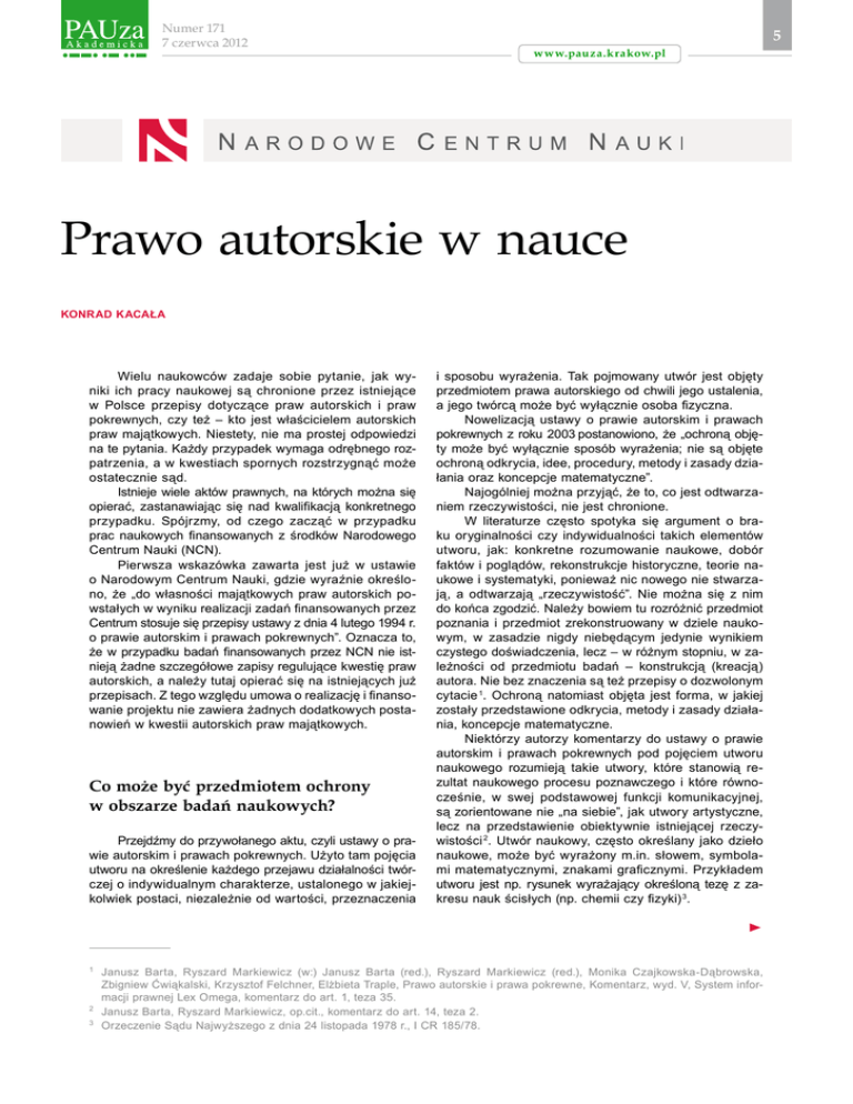 Numer 171 7 czerwca 2012 5 www.pauza.krakow.pl Prawo autorskie w nauce KONRAD KACAŁA Wielu naukowców zadaje sobie pytanie, jak wyniki ich pracy naukowej są chronione przez istniejące w Polsce przepisy dotyczące praw autorskich i praw pokrewnych, czy też – kto jest właścicielem autorskich praw majątkowych. Niestety, nie ma prostej odpowiedzi na te pytania. Każdy przypadek wymaga odrębnego rozpatrzenia, a w kwestiach spornych rozstrzygnąć może ostatecznie sąd. Istnieje wiele aktów prawnych, na których można się opierać, zastanawiając się nad kwalifikacją konkretnego przypadku. Spójrzmy, od czego zacząć w przypadku prac naukowych finansowanych z środków Narodowego Centrum Nauki (NCN). Pierwsza wskazówka zawarta jest już w ustawie o Narodowym Centrum Nauki, gdzie wyraźnie określono, że „do własności majątkowych praw autorskich powstałych w wyniku realizacji zadań finansowanych przez Centrum stosuje się przepisy ustawy z dnia 4 lutego 1994 r. o prawie autorskim i prawach pokrewnych”. Oznacza to, że w przypadku badań finansowanych przez NCN nie ist nieją żadne szczegółowe zapisy regulujące kwestię praw autorskich, a należy tutaj opierać się na istniejących już przepisach. Z tego względu umowa o realizację i finansowanie projektu nie zawiera żadnych dodatkowych postanowień w kwestii autorskich praw majątkowych. Co może być przedmiotem ochrony w obszarze badań naukowych? Przejdźmy do przywołanego aktu, czyli ustawy o pra wie autorskim i prawach pokrewnych. Użyto tam pojęcia utworu na określenie każdego przejawu działalności twórczej o indywidualnym charakterze, ustalonego w jakiejkolwiek postaci, niezależnie od wartości, przeznaczenia i sposobu wyrażenia. Tak pojmowany utwór jest objęty przedmiotem prawa autorskiego od chwili jego ustalenia, a jego twórcą może być wyłącznie osoba fizyczna. Nowelizacją ustawy o prawie autorskim i prawach pokrewnych z roku 2003 postanowiono, że „ochroną obję ty może być wyłącznie sposób wyrażenia; nie są objęte ochroną odkrycia, idee, procedury, metody i zasady działania oraz koncepcje matematyczne”. Najogólniej można przyjąć, że to, co jest odtwarzaniem rzeczywistości, nie jest chronione. W literaturze często spotyka się argument o braku oryginalności czy indywidualności takich elementów utworu, jak: konkretne rozumowanie naukowe, dobór faktów i poglądów, rekonstrukcje historyczne, teorie naukowe i systematyki, ponieważ nic nowego nie stwarzają, a odtwarzają „rzeczywistość”. Nie można się z nim do końca zgodzić. Należy bowiem tu rozróżnić przedmiot poznania i przedmiot zrekonstruowany w dziele naukowym, w zasadzie nigdy niebędącym jedynie wynikiem czystego doświadczenia, lecz – w różnym stopniu, w za leżności od przedmiotu badań – konstrukcją (kreacją) autora. Nie bez znaczenia są też przepisy o dozwolonym cytacie 1. Ochroną natomiast objęta jest forma, w jakiej zostały przedstawione odkrycia, metody i zasady działania, koncepcje matematyczne. Niektórzy autorzy komentarzy do ustawy o prawie autorskim i prawach pokrewnych pod pojęciem utworu naukowego rozumieją takie utwory, które stanowią rezultat naukowego procesu poznawczego i które równocześnie, w swej podstawowej funkcji komunikacyjnej, są zorientowane nie „na siebie”, jak utwory artystyczne, lecz na przedstawienie obiektywnie istniejącej rzeczywistości 2. Utwór naukowy, często określany jako dzieło naukowe, może być wyrażony m.in. słowem, symbolami matematycznymi, znakami graficznymi. Przykładem utworu jest np. rysunek wyrażający określoną tezę z za kresu nauk ścisłych (np. chemii czy fizyki) 3. ► 1 Janusz Barta, Ryszard Markiewicz (w:) Janusz Barta (red.), Ryszard Markiewicz (red.), Monika Czajkowska-Dąbrowska, Zbigniew Ćwiąkalski, Krzysztof Felchner, Elżbieta Traple, Prawo autorskie i prawa pokrewne, Komentarz, wyd. V, System informacji prawnej Lex Omega, komentarz do art. 1, teza 35. 2 Janusz Barta, Ryszard Markiewicz, op.cit., komentarz do art. 14, teza 2. 3 Orzeczenie Sądu Najwyższego z dnia 24 listopada 1978 r., I CR 185/78. Numer 171 7 czerwca 2012 6 www.pauza.krakow.pl ► Warto zauważyć, że skoro przedmiotem ochrony jest „utwór”, to tym samym ochrona ta nie obejmuje procesu twórczego. Istnieją jednak w kodeksie cywilnym przepisy (art. 23 i 24), które można zastosować do ochrony interesów twórcy. Twórczość naukowa jest tu pojmowana jako dobro osobiste i jako taka zasługuje na ochronę. Czym są prawa autorskie? Według polskich przepisów, prawa autorskie należy podzielić na dwie kategorie: prawa autorskie osobiste oraz prawa autorskie majątkowe. Jak się je rozróżnia? Najważniejszym kryterium podziału jest zbywalność praw. Prawa autorskie osobiste są niezbywalne. Według definicji ustawowej, chronią nieograniczoną w czasie i niepodlegającą zrzeczeniu się lub zbyciu więź twórcy z utworem. Na podstawie autorskich praw osobistych do utworu wyłącznie jego twórca może oznaczać utwór swoim nazwiskiem lub pseudonimem, udostępniać go anonimowo, decydować o pierwszym udostępnieniu utworu publiczności i nadzorować sposób korzystania z utworu. Autorskie prawa osobiste to również prawo do nienaruszalności treści i formy utworu oraz jego rzetelnego wykorzystania. Z kolei autorskie prawa majątkowe są określone jako wyłączne prawo do korzystania z utworu i rozporządzania nim na wszystkich polach eksploatacji oraz do otrzymania wynagrodzenia za korzystanie z utworu. Taki zapis oznacza, że twórca może dowolnie rozporządzać utworem, np. przenieść prawa autorskie majątkowe lub upoważnić do korzystania z utworu (udzielić licencji). Autorskie prawa majątkowe można również dziedziczyć. Należy jednak pamiętać, że aby przenieść prawa autorskie majątkowe lub udzielić licencji wyłącznej, należy sporządzić pisemną umowę – inaczej przeniesienie