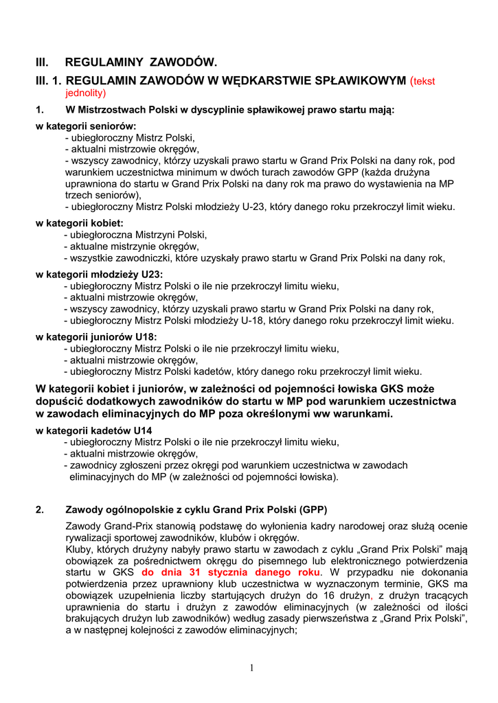 III. REGULAMINY ZAWODÓW. III. 1. REGULAMIN ZAWODÓW W WĘDKARSTWIE SPŁAWIKOWYM (tekst jednolity) 1. W Mistrzostwach Polski w dyscyplinie spławikowej prawo startu mają: w kategorii seniorów: - ubiegłoroczny Mistrz Polski, - aktualni mistrzowie okręgów, - wszyscy zawodnicy, którzy uzyskali prawo startu w Grand Prix Polski na dany rok, pod warunkiem uczestnictwa minimum w dwóch turach zawodów GPP (każda drużyna uprawniona do startu w Grand Prix Polski na dany rok ma prawo do wystawienia na MP trzech seniorów), - ubiegłoroczny Mistrz Polski młodzieży U-23, który danego roku przekroczył limit wieku. w kategorii kobiet: - ubiegłoroczna Mistrzyni Polski, - aktualne mistrzynie okręgów, - wszystkie zawodniczki, które uzyskały prawo startu w Grand Prix Polski na dany rok, w kategorii młodzieży U23: - ubiegłoroczny Mistrz Polski o ile nie przekroczył limitu wieku, - aktualni mistrzowie okręgów, - wszyscy zawodnicy, którzy uzyskali prawo startu w Grand Prix Polski na dany rok, - ubiegłoroczny Mistrz Polski młodzieży U-18, który danego roku przekroczył limit wieku. w kategorii juniorów U18: - ubiegłoroczny Mistrz Polski o ile nie przekroczył limitu wieku, - aktualni mistrzowie okręgów, - ubiegłoroczny Mistrz Polski kadetów, który danego roku przekroczył limit wieku. W kategorii kobiet i juniorów, w zależności od pojemności łowiska GKS może dopuścić dodatkowych zawodników do startu w MP pod warunkiem uczestnictwa w zawodach eliminacyjnych do MP poza określonymi ww warunkami. w kategorii kadetów U14 - ubiegłoroczny Mistrz Polski o ile nie przekroczył limitu wieku, - aktualni mistrzowie okręgów, - zawodnicy zgłoszeni przez okręgi pod warunkiem uczestnictwa w zawodach eliminacyjnych do MP (w zależności od pojemności łowiska). 2. Zawody ogólnopolskie z cyklu Grand Prix Polski (GPP) Zawody Grand-Prix stanowią podstawę do wyłonienia kadry narodowej oraz służą ocenie rywalizacji sportowej zawodników, klubów i okręgów. Kluby, których drużyny nabyły prawo startu w zawodach z cyklu „Grand Prix Polski” mają obowiązek za pośrednictwem okręgu do pisemnego lub elektronicznego potwierdzenia startu w GKS do dnia 31 stycznia danego roku. W przypadku nie dokonania potwierdzenia przez uprawniony klub uczestnictwa w wyznaczonym terminie, GKS ma obowiązek uzupełnienia liczby startujących drużyn do 16 drużyn, z drużyn tracących uprawnienia do startu i drużyn z zawodów eliminacyjnych (w zależności od ilości brakujących drużyn lub zawodników) według zasady pierwszeństwa z „Grand Prix Polski”, a w następnej kolejności z zawodów eliminacyjnych; 1 prawo startu ma: 16 klubów (12 wyłonionych z klasyfikacji drużynowej za ubiegły rok oraz 4 drużyny z zawodów eliminacyjnych) w składach 5-cio osobowych (3 seniorów, kobieta, młodzież (U23), oraz indywidualnie: - w kategorii seniorów zawodnicy od 1 do 30 miejsca z klasyfikacji ‘Grand Prix Polski” za ubiegły rok i od 1 do 8 miejsca zawodnicy z zawodów eliminacyjnych, nie będącymi członkami drużyn, które uzyskały prawo startu; - w kategorii kobiet, młodzieży (U23) zawodniczki i zawodnicy od 1 do 10 miejsca z klasyfikacji „Grand Prix Polski” za ubiegły rok i od 1 do 4 miejsca zawodniczki i zawodnicy z zawodów eliminacyjnych, nie będącymi członkami drużyn, które uzyskały prawo startu ; - ubiegłoroczny indywidualny Mistrz Polski w kategorii kobiet, seniorów i młodzieży U23. - członkowie kadry narodowej po uzyskaniu zgody Głównego Kapitanatu Sportowego Na koniec każdego roku startów 4 ostatnie drużyn z klasyfikacji rocznej opuszczają rywalizację w zawodach z cyklu „Grand Prix Polski ” oraz zawodniczki i zawodnicy indywidualni: - w kategorii seniorów od 31 miejsca, - w kategorii kobiet i młodzieży (U23) od 11 miejsca, Członek kadry narodowej w kategorii: młodzieży U23 i juniorów U18, który danego roku przekroczył limit wieku ma prawo startu w zawodach Grand Prix Polski w wyższej kategorii wiekowej. Jeżeli drużyna, która zakwalifikowała się do startu w zawodach Grand Prix Polski na dany sezon nie będzie w stanie startować w pełnym składzie od początku sezonu, zostanie wykreślona z listy zakwalifikowanych drużyn, a jej miejsce zajmie kolejna drużyna. W każdych zawodach GPP drużyna musi startować w pełnym składzie. W przypadku dopuszczenia do startu w zawodach dwóch lub więcej drużyn z jednego klubu, zgłaszający jest zobowiązany do jednoznacznego określenia drużyny I i II itd. Zawodnicy mogą reprezentować w całym cyklu zawodów GPP tylko jedną drużynę, a ewentualne zmiany składu mogą dotyczyć jedynie zawodników, którzy w bieżącym sezonie nie startowali w innych drużynach lub stratowali w zawodach GPP indywidualnie. Zawody eliminacyjne – cykl 3 zawodów 2-turowych. Kluby, które chcą uczestniczyć w danym roku w zawodach eliminacyjnych do „Grand Prix Polski” mają obowiązek do pisemnego lub elektronicznego zgłoszenia startu do Głównego Kapitanatu Sportowego do dnia 28 lutego danego roku. W zawodach eliminacyjnych do „GPP” prawo startu mają zawodnicy zrzeszeni w klubach, drużyny: w składach 5-cio osobowych (3 seniorów, kobieta, młodzież (U23) oraz zawodniczki i zawodnicy indywidualni. Organizator ma prawo ograniczyć ilość startujących zawodników ze względu na pojemność łowiska. O przyjęciu decyduje kolejność zgłoszeń Zawody w kategorii juniorów U18 i kadetów U14 – cykl 3 zawodów 2-turowych. Zawody rozgrywane w klasyfikacji indywidualnej. Prawo startu mają zawodnicy zgłoszeni przez macierzyste okręgi. 3. TEREN ZAWODÓW. 3.1. Zawody mogą być rozgrywane na wodach stojących lub bieżących. Wzdłuż odcinka brzegu przewidzianego do odbycia zawodów, woda powinna mieć jednakową głębokość, nie mniejszą niż 1,00 metr. 2 3.2. Odcinek brzegu, przewidziany do rozegrania zawodów, powinien przebiegać w miarę możliwości w linii prostej, a se