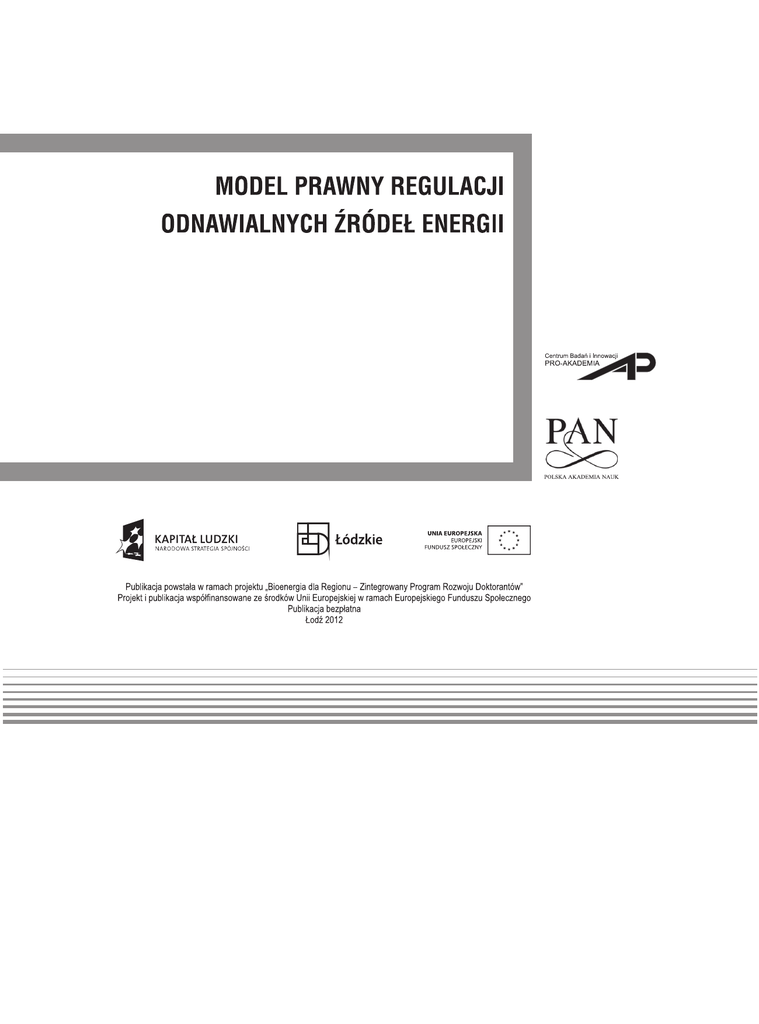 RECENZENT: prof. zw. dr hab. Marek Górski REDAKCJA NAUKOWA: dr hab. Piotr Korzeniowski, profesor UŁ, dr Leszek Karski AUTORZY: dr hab. Piotr Korzeniowski, profesor UŁ, Uniwersytet Łódzki, Wydział Prawa i Administracji dr Aneta Kaźmierska-Patrzyczna, Uniwersytet Łódzki, Wydział Prawa i Administracji mgr Magdalena Łysek, Uniwersytet Łódzki, Wydział Prawa i Administracji mgr Paweł Grabowski, Uniwersytet Łódzki, Wydział Prawa i Administracji mgr Mateusz Izbicki, Uniwersytet Łódzki, Wydział Prawa i Administracji OPRACOWANIE REDAKCYJNE: Elżbieta Marciszewska-Kowalczyk, Ewa Siwińska AUTOR ZDJĘCIA NA OKŁADCE: Piotr Korzeniowski NA OKŁADCE: Tullia, pędzący rydwan, starożytny Rzym (drzeworyt z 1897 r. ze zbioru Moderne Kunst in Meister-Holzschnitten. Nach Gemälden und Sculpturen berühmeter Meister der Gegenwart, Berlin 1896–1900). Arcydzieła sztuki drzeworytniczej z XIX wieku. Autor pierwowzoru: Augustin Querol. © Copyright by Centrum Badań i Innowacji Pro-Akademia, 2012 © Copyright for this edition by Oddział Polskiej Akademii Nauk w Łodzi, 2012 Opinie przedstawione w publikacji przez pracowników urzędów administracji publicznej lub instytucji publicznych są prywatne i nie mogą być w żaden sposób traktowane jako oficjalna (urzędowa) wykładnia tekstu prawnego dokonywana w imieniu organu administracji publicznej. Pro-Akademia ISBN 978-83-63704-06-3 PAN ISBN 978-83-86492-68-8 Autorzy dedykują niniejszą pracę dr Ewie Kochańskiej za wsparcie i motywację Spis treści Wykaz skrótów ....................................................................................................................................... 11 Słowo wstępne ........................................................................................................................................ 15 CZĘŚĆ I – OTOCZENIE SYSTEMOWE MODELU REGULACJI PROCESU INWESTYCYJNEGO W SEKTORZE ODNAWIALNYCH ŹRÓDEŁ ENERGII .................................................... 20 Rozdział 1. Teoretyczny model systemu gospodarczego prawa środowiska (Piotr Korzeniowski) . 20 1.1. Przedmiot gospodarczego prawa środowiska .................................................................... 31 1.2. Metoda badań gospodarczego prawa środowiska ............................................................. 37 1.3. Międzynarodowe gospodarcze prawo środowiska ............................................................. 43 1.4. Unijne gospodarcze prawo środowiska.............................................................................. 56 1.5. Polskie gospodarcze prawo środowiska ............................................................................. 63 Rozdział 2. Zasady ogólne gospodarczego prawa środowiska (Piotr Korzeniowski) ....................... 71 2.1. Zasada zrównoważonego rozwoju ...................................................................................... 72 2.2. Zasada kompleksowości ochrony środowiska.................................................................... 75 2.3. Zasada prewencji................................................................................................................ 78 2.4. Zasada przezorności ........................................................................................................... 81 2.5. Zasada materialnej odpowiedzialności sprawcy zanieczyszczającego środowisko (zasada „zanieczyszczający płaci”) ......................................................................................... 83 2.6. Zasada nadrzędności wymagań ochrony środowiska ....................................................... 85 2.7. Zasada dostępu do informacji o środowisku i jego ochronie ............................................. 89 2.8. Zasada partycypacji publicznej.......................................................................................... 93 2.9. Zasada reglamentacji ......................................................................................................... 94 2.10. Zasada sprawiedliwości ekologicznej w korzystaniu z zasobów środowiska ................. 104 2.11. Zasada ujednolicania ....................................................................................................... 109 Rozdział 3. Próba zbudowania modelu instytucji prawnej odnawialnych źródeł energii w projekcie ustawy o odnawialnych źródłach energii z 20 grudnia 2011 r. (Aneta Kaźmierska-Patrzyczna, Piotr Korzeniowski) ............................................................................. 120 5 6 CZĘŚĆ II – UWARUNKOWANIA ADMINISTRACYJNO-PRAWNE SEKTORA ODNAWIALNYCH ŹRÓDEŁ ENERGII............................................................................................................... 157 Rozdział 1. Model regulacji OZE na gruncie prawa unijnego i polskiego (Magdalena Łysek) ....... 157 1.1. Zrównoważony rozwój a OZE............................................................................................. 157 1.2. Polityka energetyczna ........................................................................................................ 160 1.3. Promowanie odnawialnych źródeł energii ........................................................................ 164 1.4. Model regulacji OZE na gruncie prawa polskiego ............................................................ 167 1.5. Bariery w rozwoju odnawialnych źródeł energii ............................................................... 169 Rozdział 2. Podmioty działające w branży OZE (Magdalena Łysek)............................................... 172 2.1. Określenie kompetencji wybranych organów administracji ............................................ 172 2.2. Kontrola i nadzór ............................................................................................................... 177 2.3. Pozostali uczestnicy rynku OZE .....................................................................