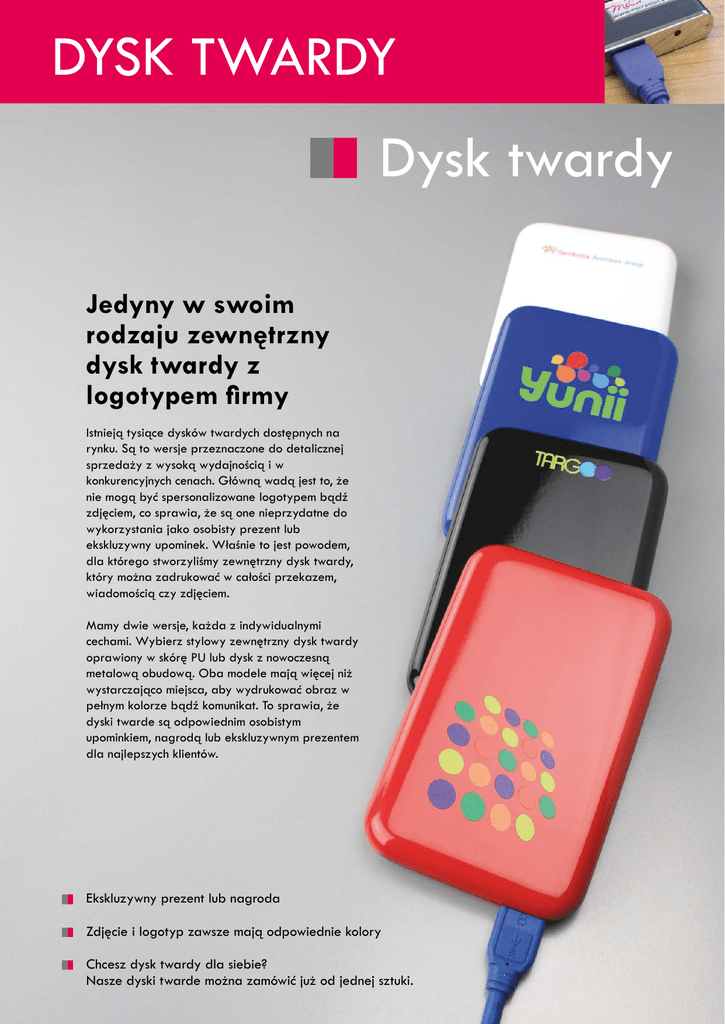 DYSK TWARDY Dysk twardy Jedyny w swoim rodzaju zewnętrzny dysk twardy z logotypem firmy Istnieją tysiące dysków twardych dostępnych na rynku. Są to wersje przeznaczone do detalicznej sprzedaży z wysoką wydajnością i w konkurencyjnych cenach. Główną wadą jest to, że nie mogą być spersonalizowane logotypem bądź zdjęciem, co sprawia, że są one nieprzydatne do wykorzystania jako osobisty prezent lub ekskluzywny upominek. Właśnie to jest powodem, dla którego stworzyliśmy zewnętrzny dysk twardy, który można zadrukować w całości przekazem, wiadomością czy zdjęciem. Mamy dwie wersje, każda z indywidualnymi cechami. Wybierz stylowy zewnętrzny dysk twardy oprawiony w skórę PU lub dysk z nowoczesną metalową obudową. Oba modele mają więcej niż wystarczająco miejsca, aby wydrukować obraz w pełnym kolorze bądź komunikat. To sprawia, że dyski twarde są odpowiednim osobistym upominkiem, nagrodą lub ekskluzywnym prezentem dla najlepszych klientów. Ekskluzywny prezent lub nagroda Zdjęcie i logotyp zawsze mają odpowiednie kolory Chcesz dysk twardy dla siebie? Nasze dyski twarde można zamówić już od jednej sztuki. Dysk twardy w skórze PU • Luksusowa czarna oprawa • Pełnokolorowy doming możliwy w każdym kształcie i romiarze Pojemność 320 GB, 500 GB, 1 TB Technologia USB 3.0 (5 Gbps) Twardy dysk 2,5” 5400 rpm SATA II Kompatybilność Windows 98SE/ NT/ 2000/ 2003/ XP/ Vista/ 7, MAC OS 10.X i wyżej wymienione Gwarancja i bezpieczeństwo Roczna gwarancja na dysk twardy Obudowa Aluminiowa obudowa wykończona wysokiej jakości materiałem skóropodobnym (czarny kolor) Wymiary 127 x 78,6 x 13,5 mm Powierzchnia nadruku Dowolny kształt i rozmiar Opakowanie Standardowe opakowanie detaliczne, ochronny pokrowiec Dodatkowe możliwości • Pełnokolorowe logo z akrylowym pokryciem (tzw. doming) Metalowy dysk twardy • Nowoczesna, kolorowa obudowa • Możliwość znakowania poprzez nadruk w pełnym kolorze po obu stronach Pojemność 320 GB, 500 GB, 1 TB Technologia USB 3.0 (5 Gbps) Twardy dysk 2,5” 5400 rpm SATA II Kompatybilność Windows 98SE/ NT/ 2000/ 2003/ XP/ Vista/ 7, MAC OS 10.X i wyżej wymienione Gwarancja i bezpieczeństwo Roczna gwarancja na dysk twardy Obudowa Metal z połyskiem, możliwość połączenia różnych kolorów obudowy Wymiary 120,5 x 77,5 x 14 mm Powierzchnia nadruku 50 x 100 mm Opakowanie Standardowe opakowanie detaliczne, ochronny pokrowiec Dodatkowe możliwości • Dwustronny pełnokolorowy nadruk